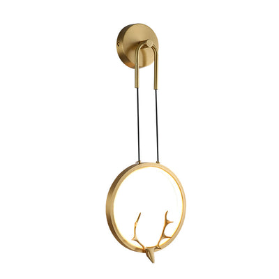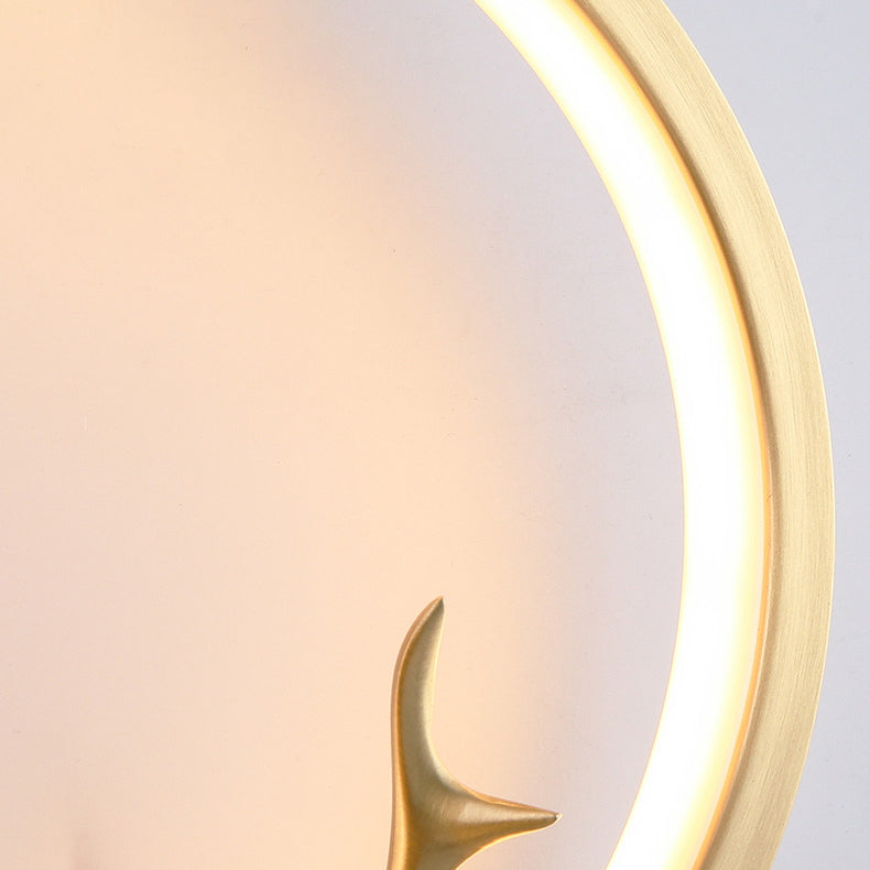 أضف سحرًا خياليًا وأناقة عصرية إلى مساحتك مع هذا مصباح الجدار الدائري بأسلوب الفن الحديث. تم تصميمه بإطار دائري ناعم من النحاس والسيليكون، ويتميز بزوج رقيق من قرون الغزلان، مما يضفي لمسة مرحة ولكن راقية على الشكل البسيط.