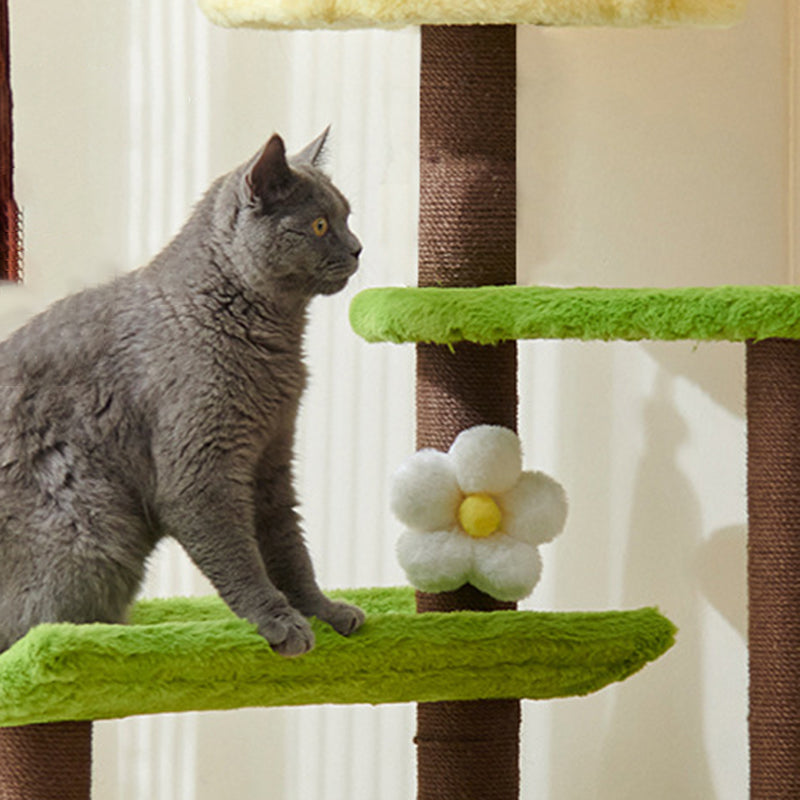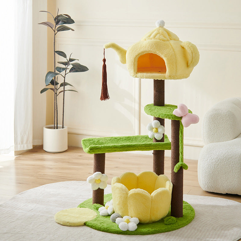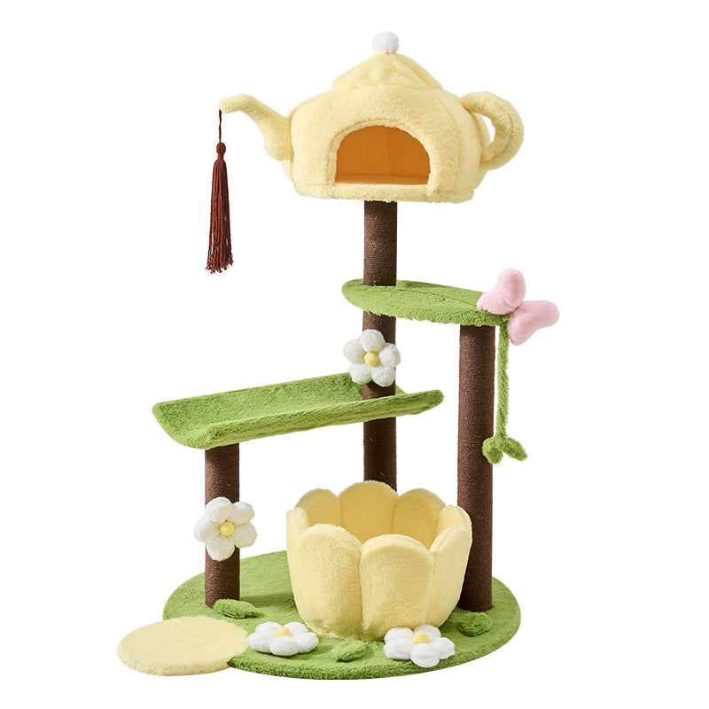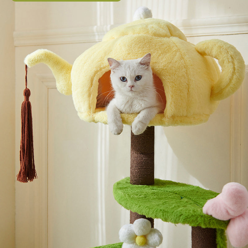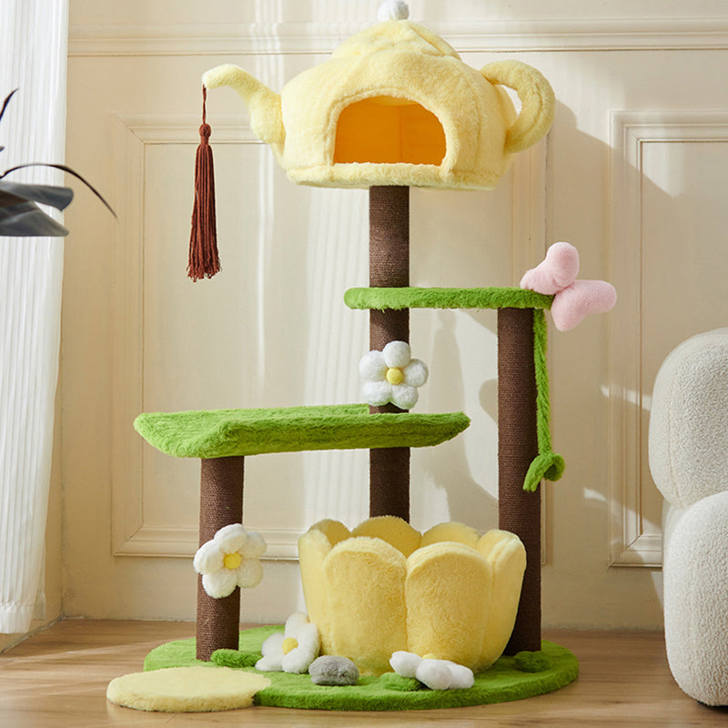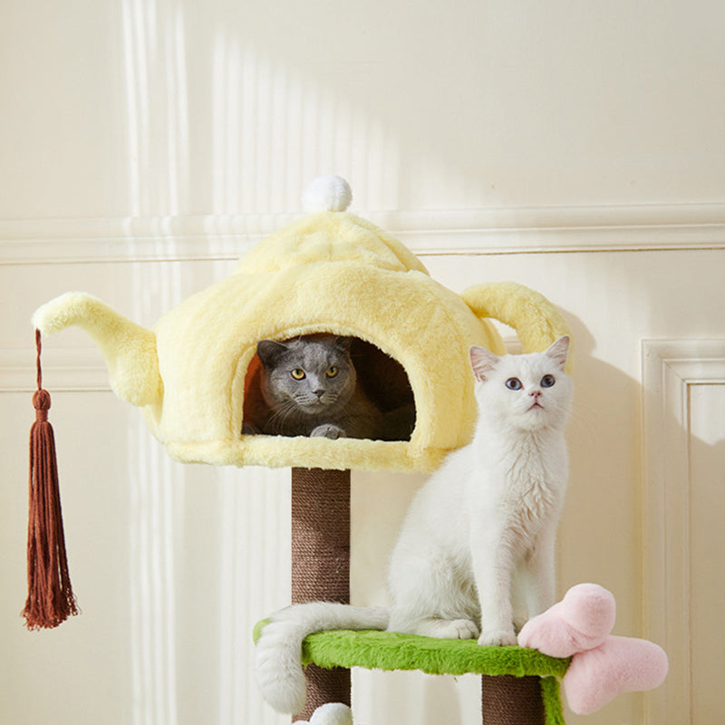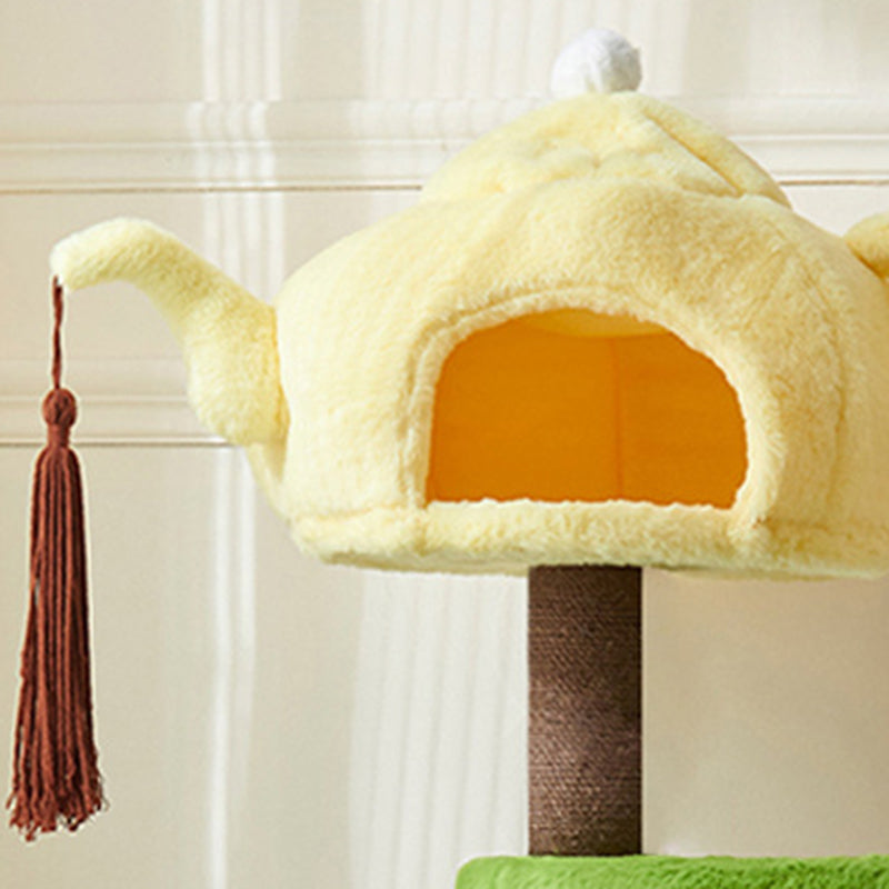 Thoughtfully designed for multi-cat households, this tower features two cozy, dedicated cat beds and ample space for climbing, lounging, and daily play. Its multi-functional design makes it the perfect enrichment center for your pets. Available in cheerful yellow, playful green, or warm brown, this piece adds a fun, decorative touch to your living room or bedroom. Optimized for North American consumers searching for unique teapot-shaped cat trees, 3-tier plush cat condos, multi-cat houses with beds, and whimsical engineered wood pet furniture.