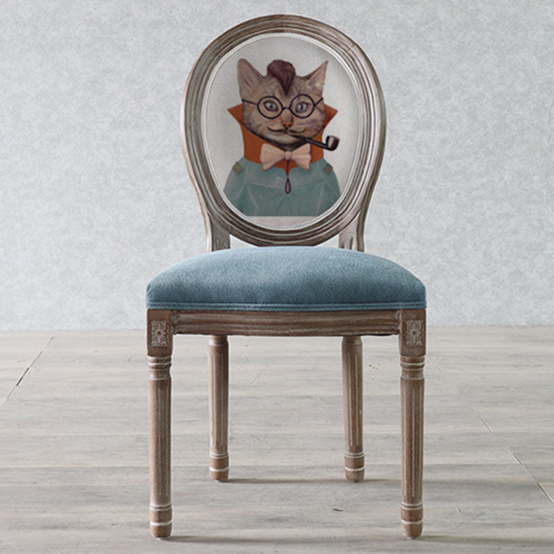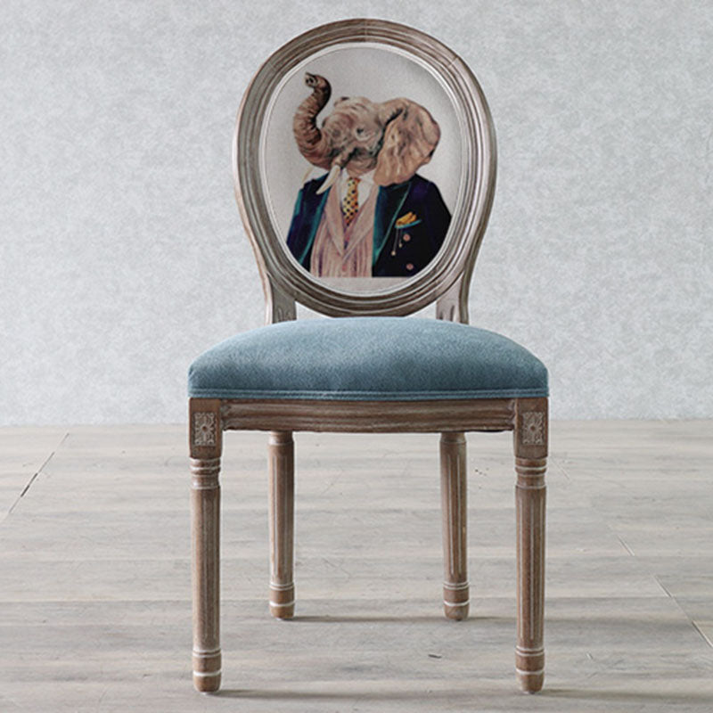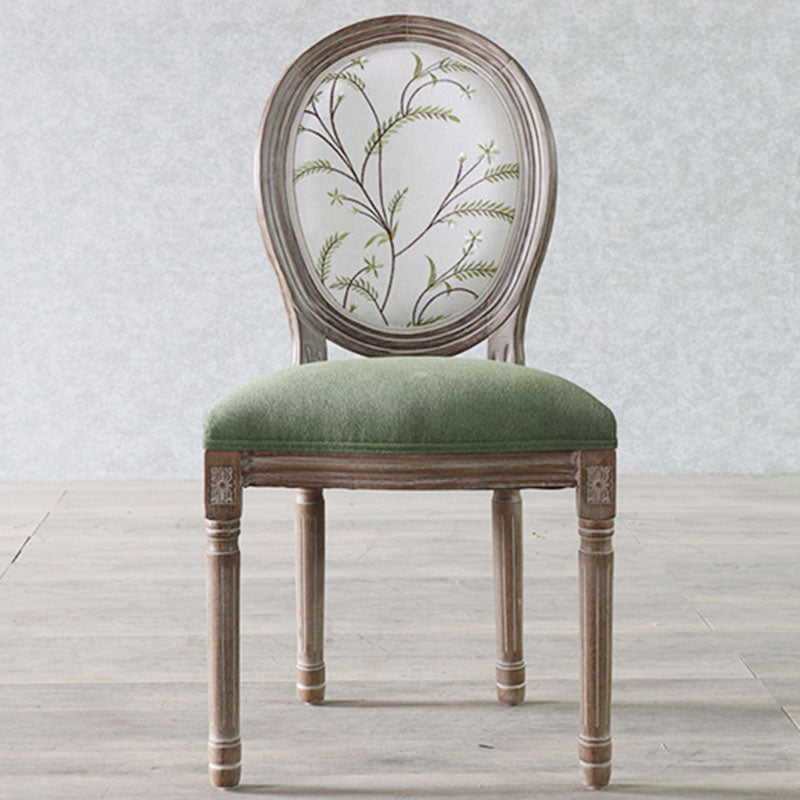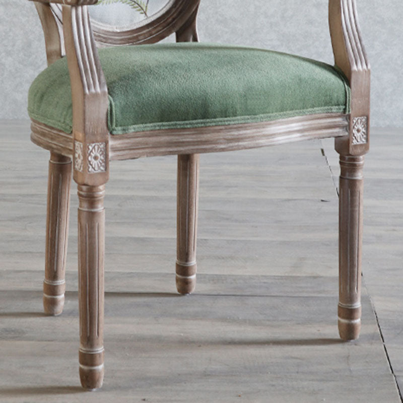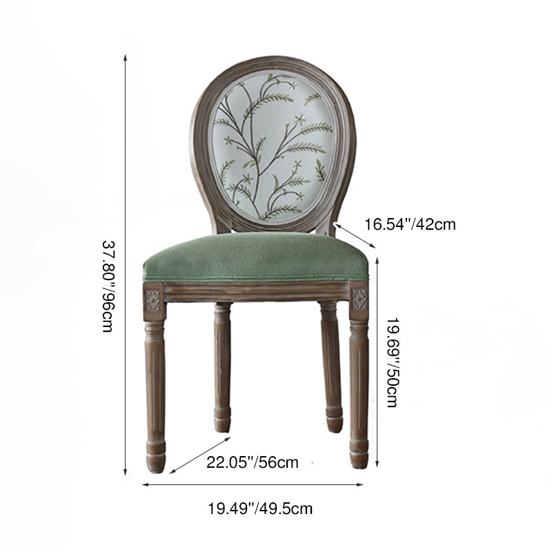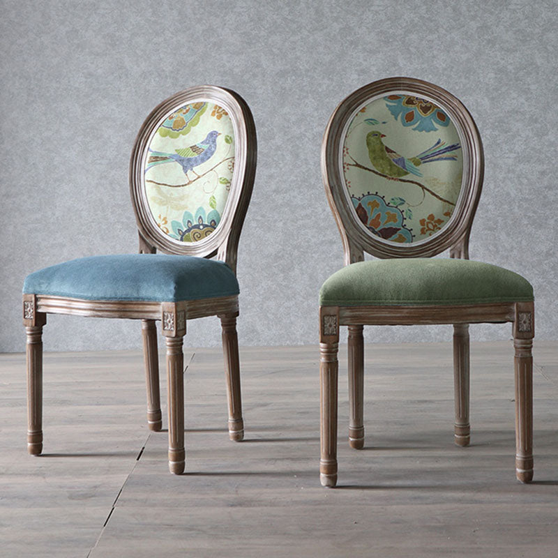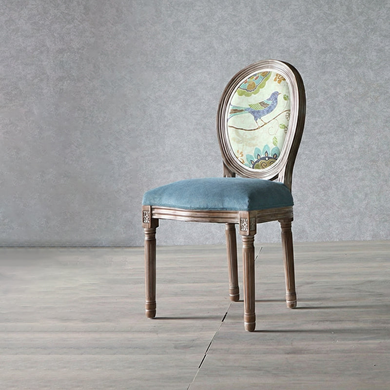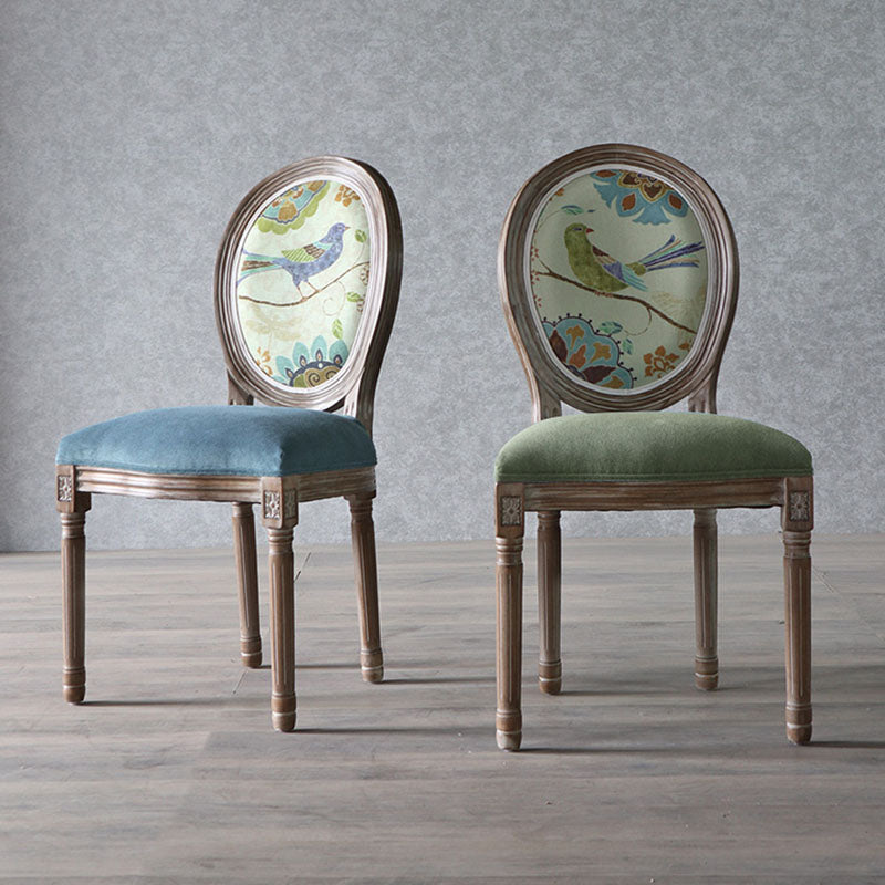 كرسي طعام من القماش المخملي بإطار خشبي منحني تقليدي أوروبي مستهلك بمظهر قديم مع ظهر مستدير لغرفة الطعام