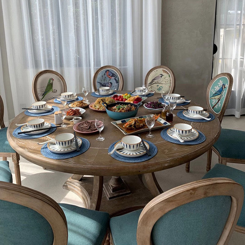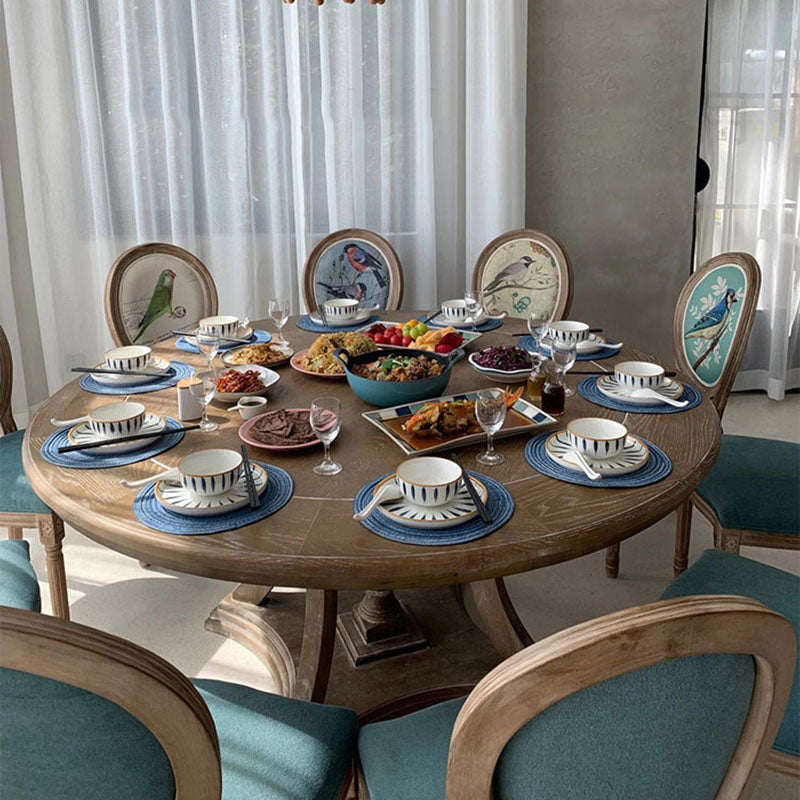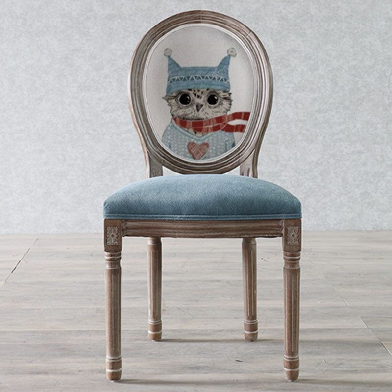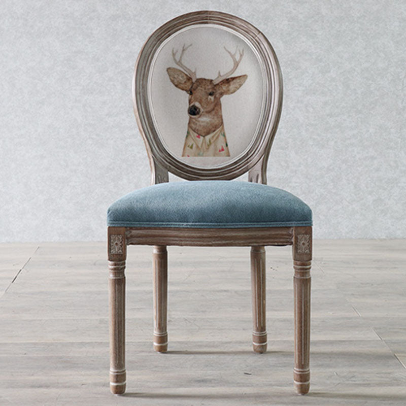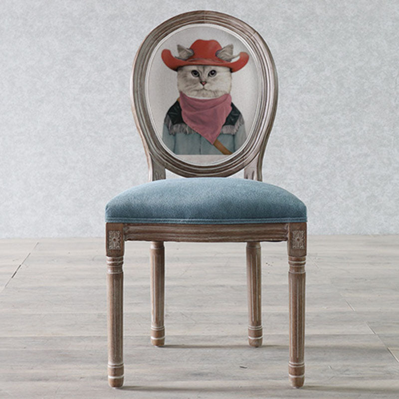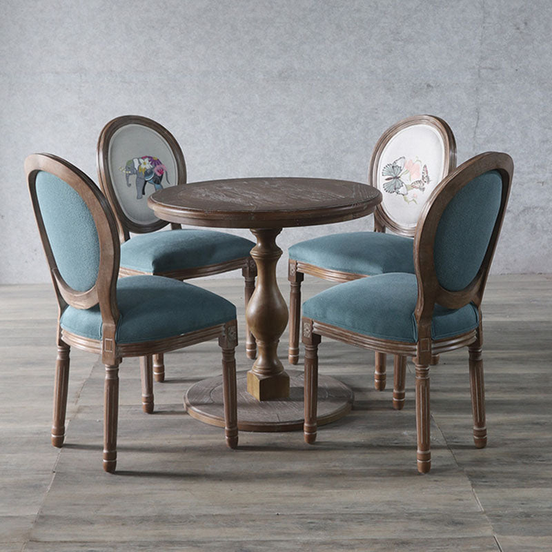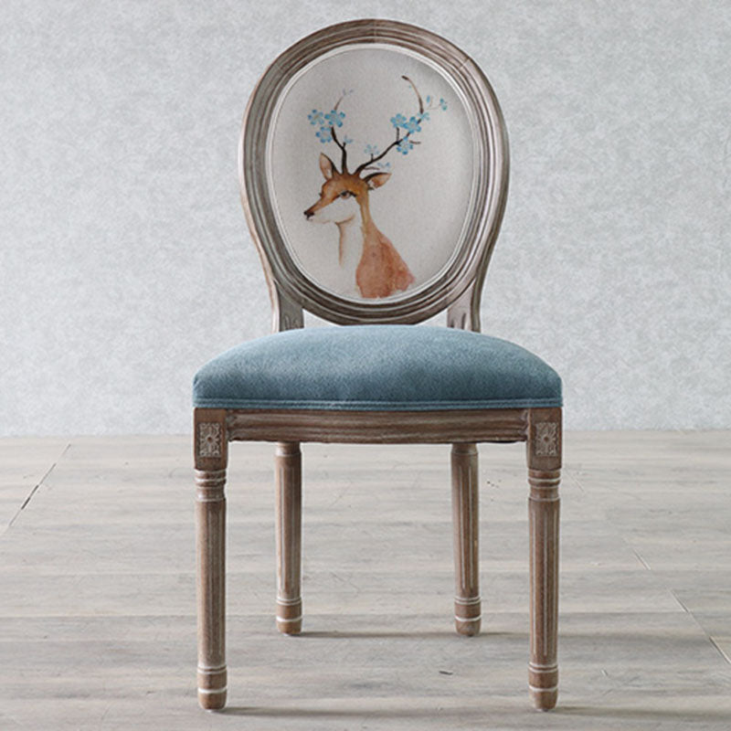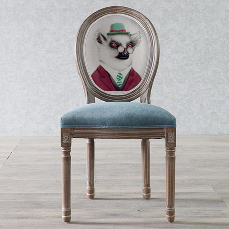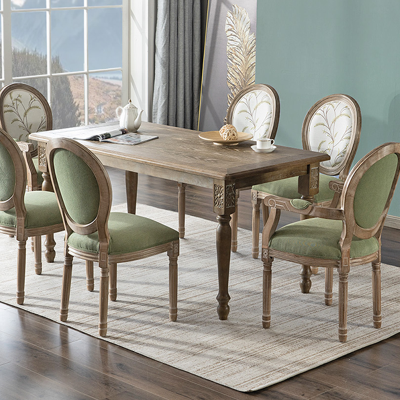 كرسي طعام من القماش المخملي بإطار خشبي منحني تقليدي أوروبي مستهلك بمظهر قديم مع ظهر مستدير لغرفة الطعام