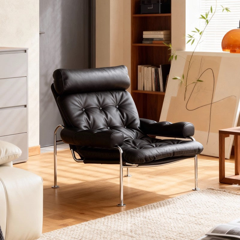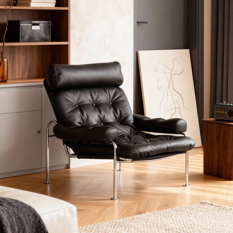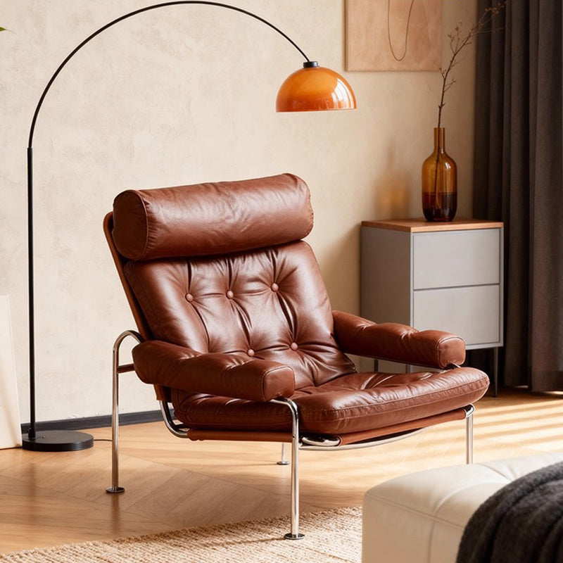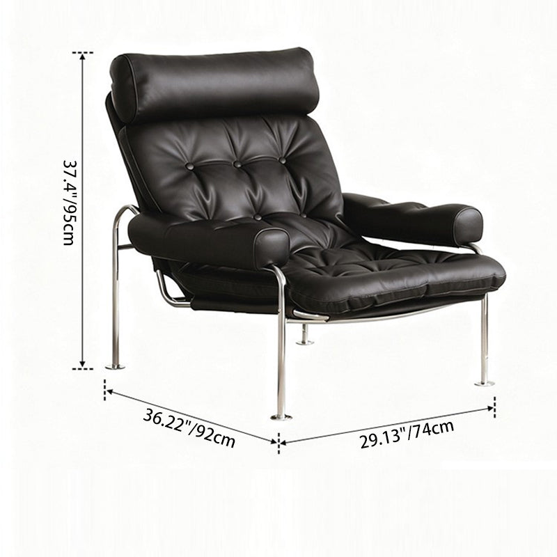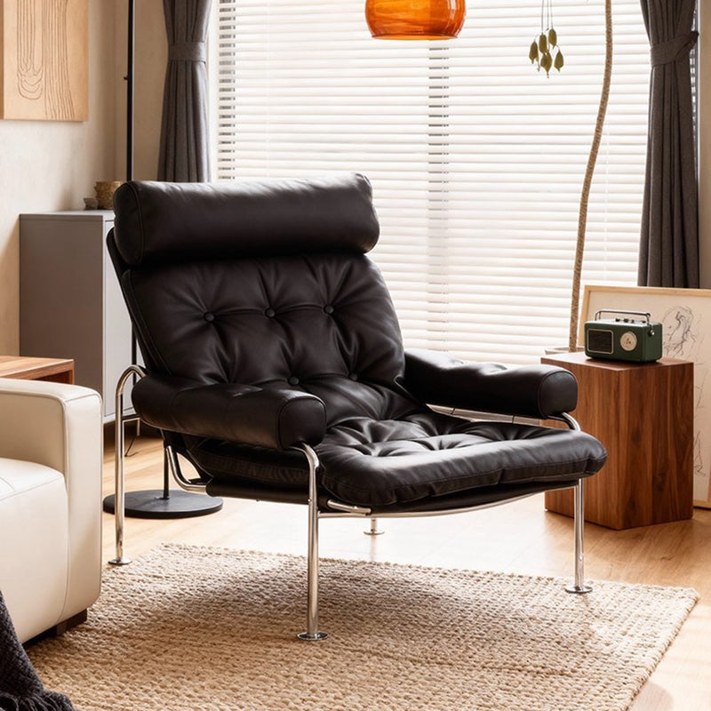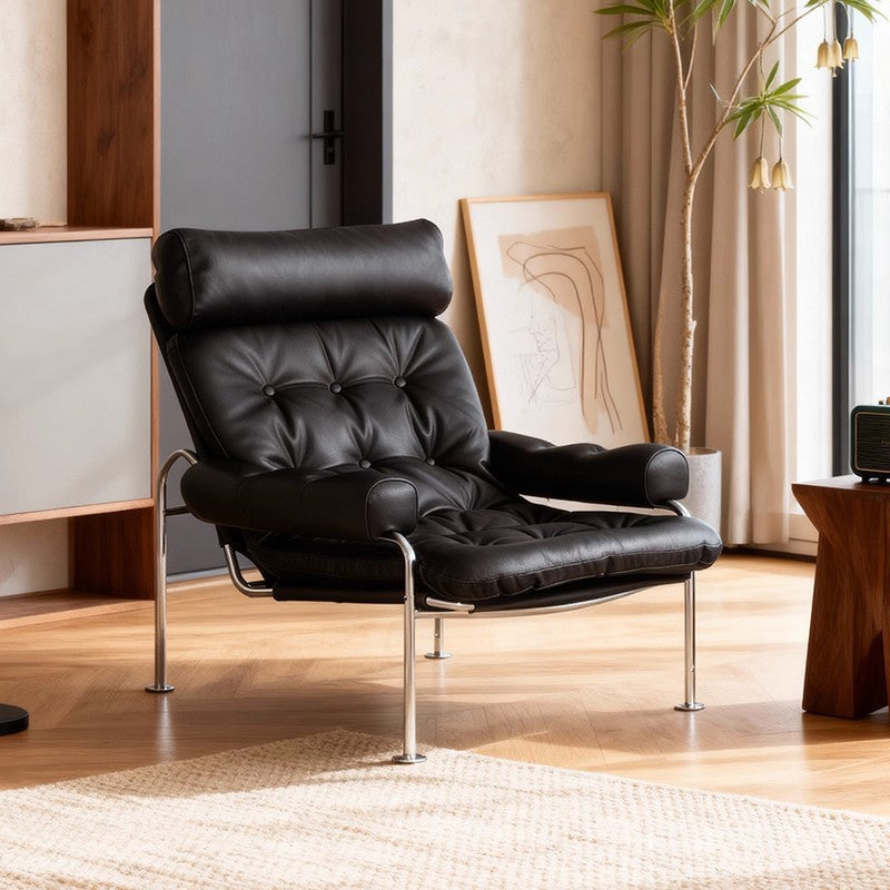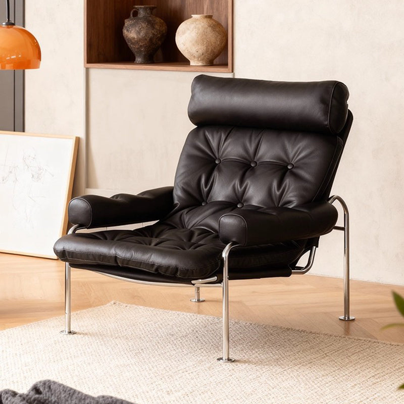 Designed for exceptional comfort and sophisticated style, this modern minimalist lounge armchair features a beautifully curved faux-leather seat, a supportive backrest, and comfortable armrests, making it the ideal spot for relaxation in any living room. The chair is built for long-lasting durability and stability with a striking stainless-steel frame and includes a soft, cushioned seat, all available in your choice of classic black or rich brown.