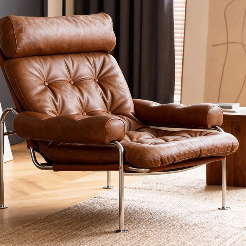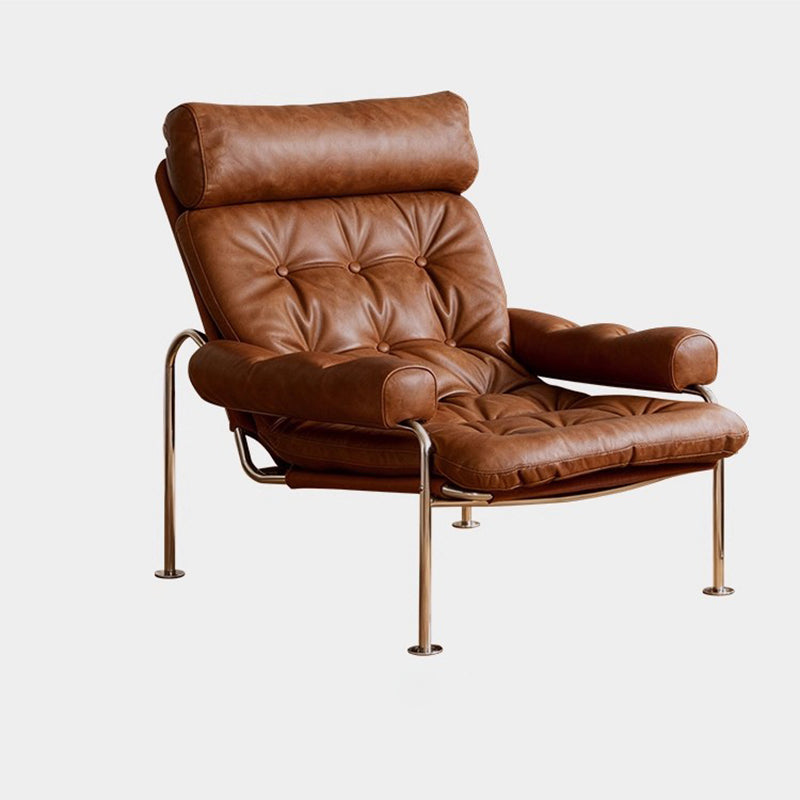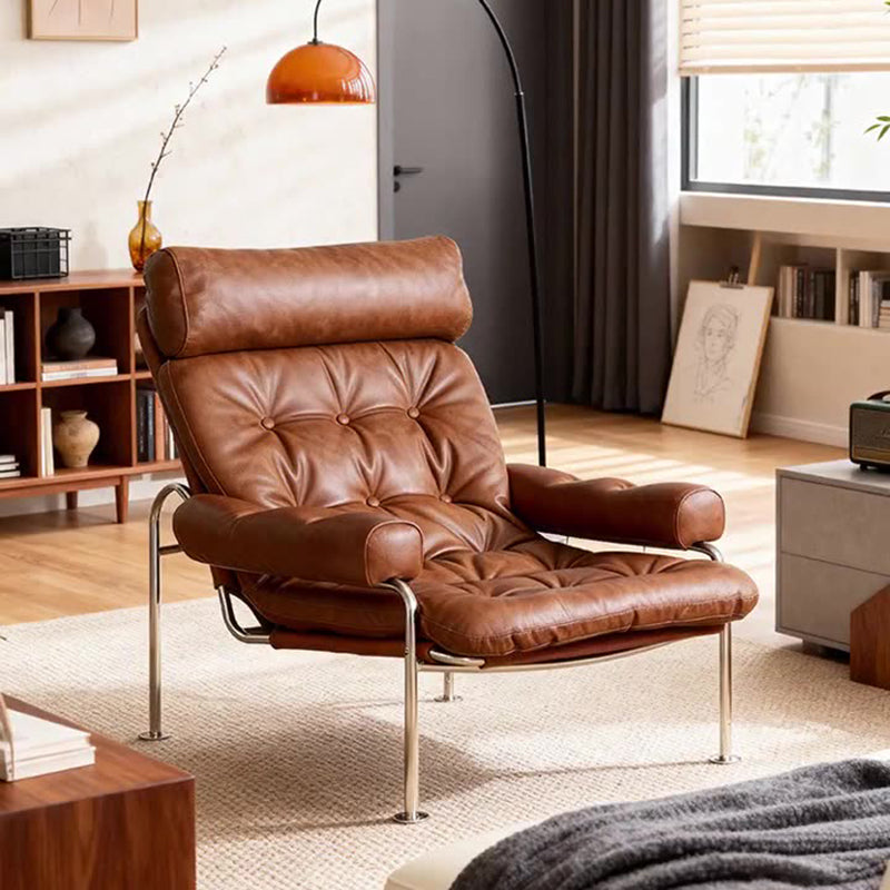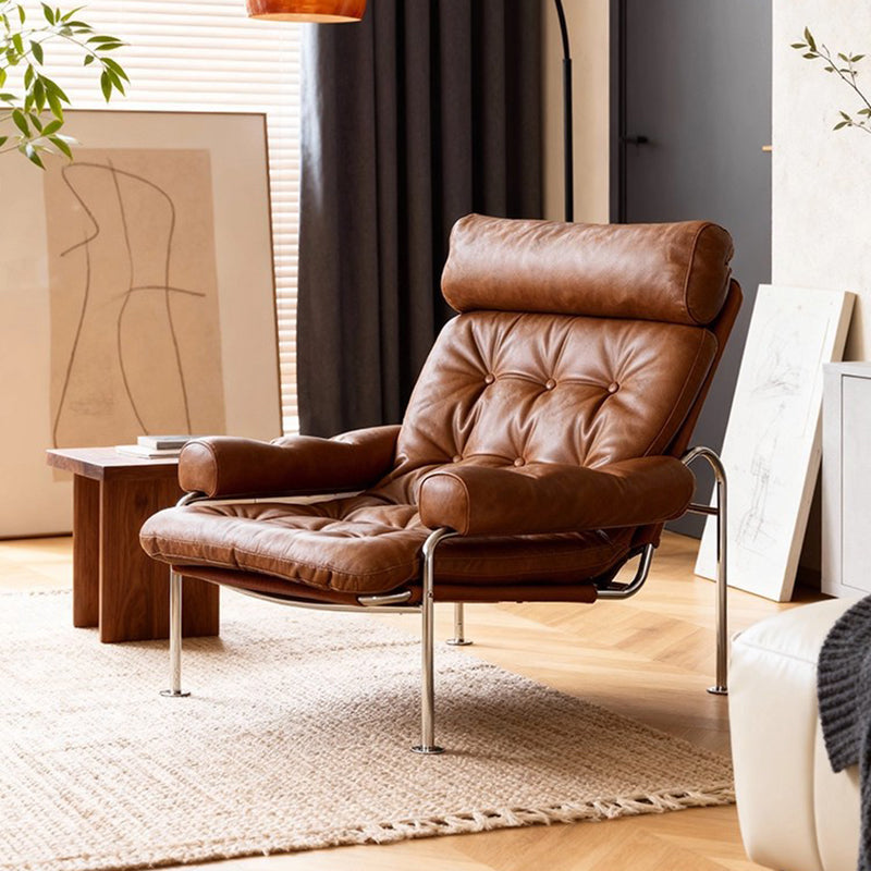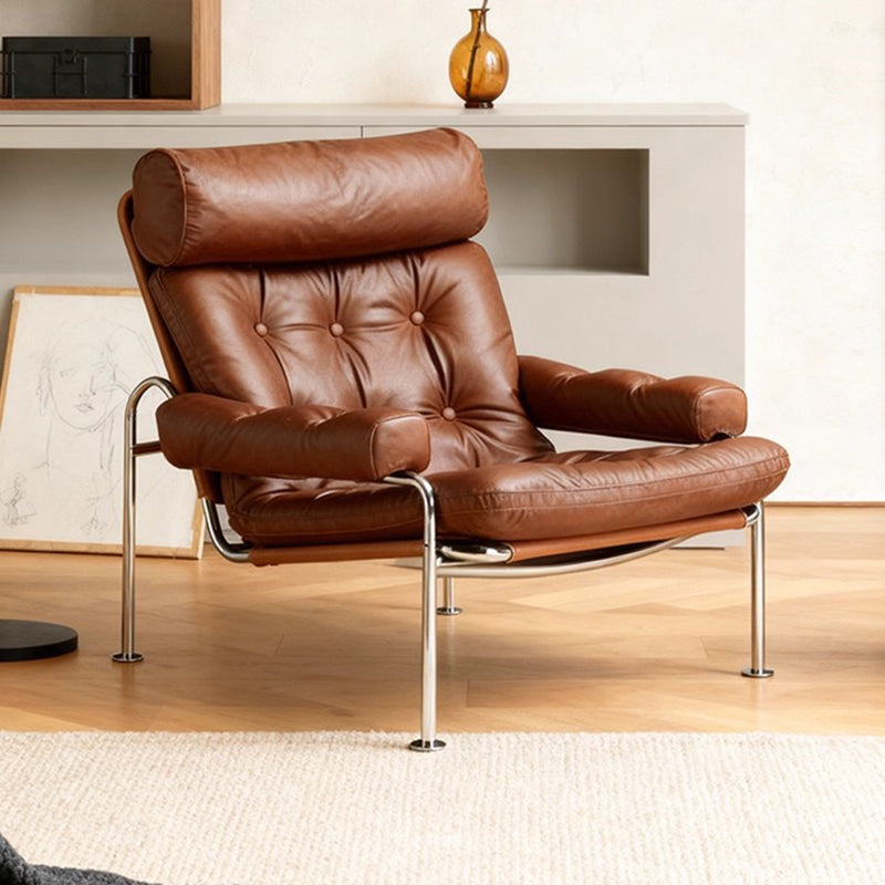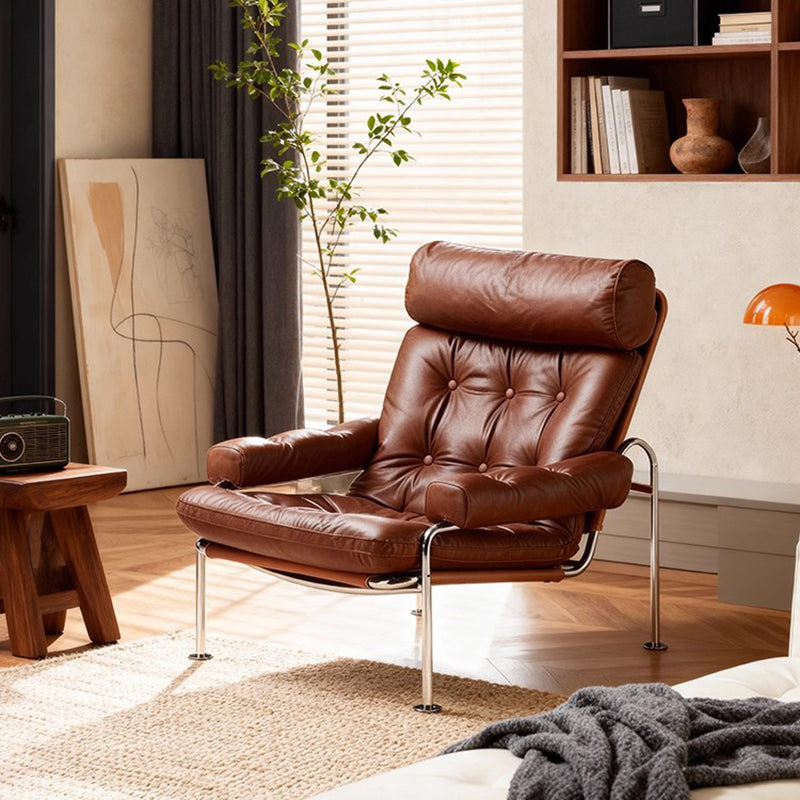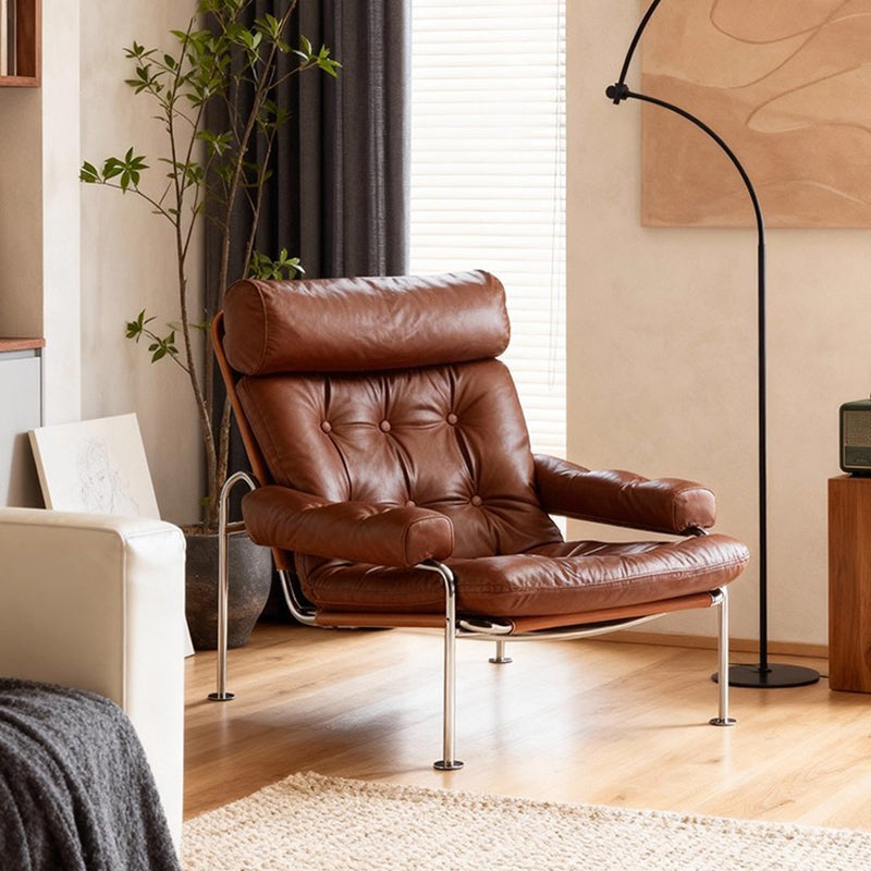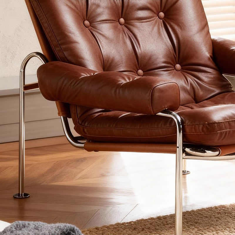 Designed for exceptional comfort and sophisticated style, this modern minimalist lounge armchair features a beautifully curved faux-leather seat, a supportive backrest, and comfortable armrests, making it the ideal spot for relaxation in any living room. The chair is built for long-lasting durability and stability with a striking stainless-steel frame and includes a soft, cushioned seat, all available in your choice of classic black or rich brown.