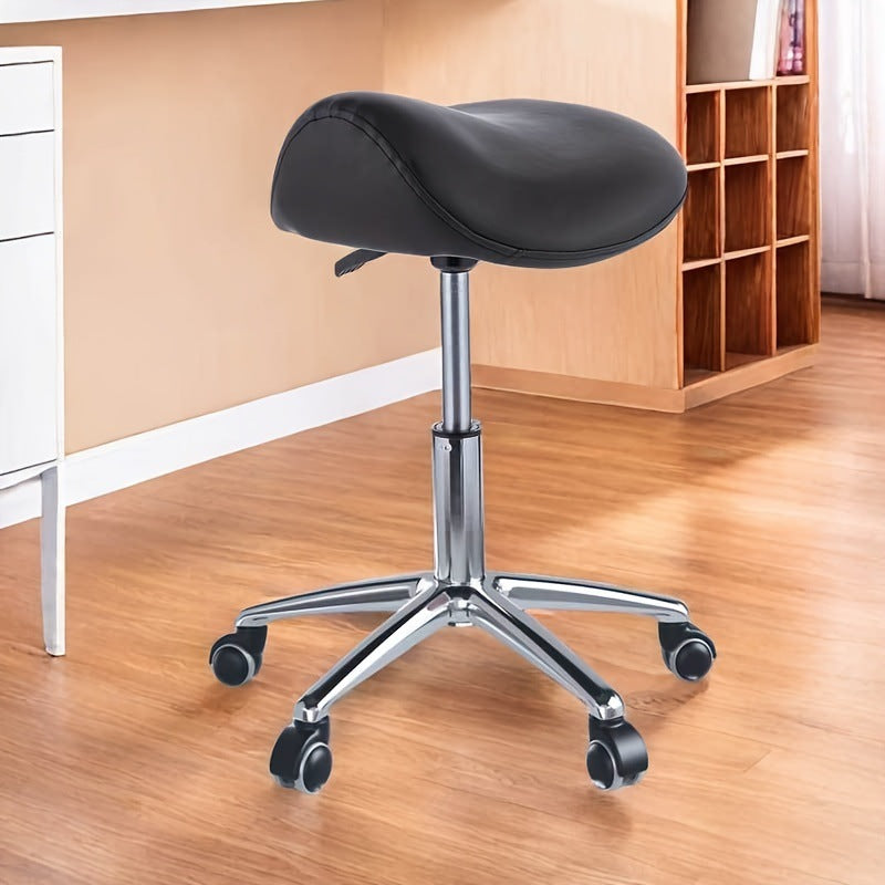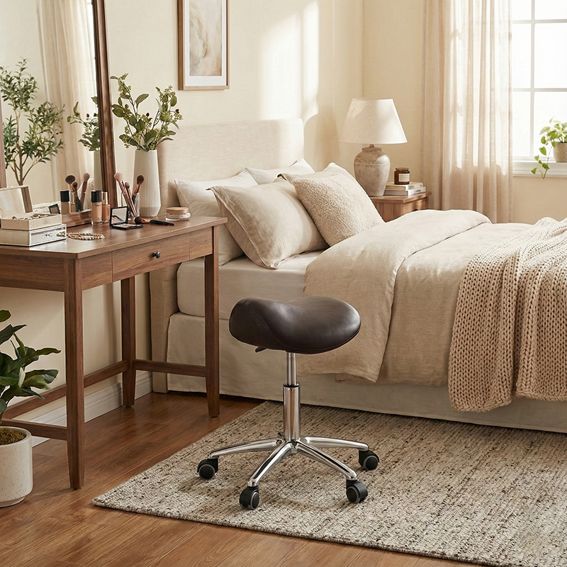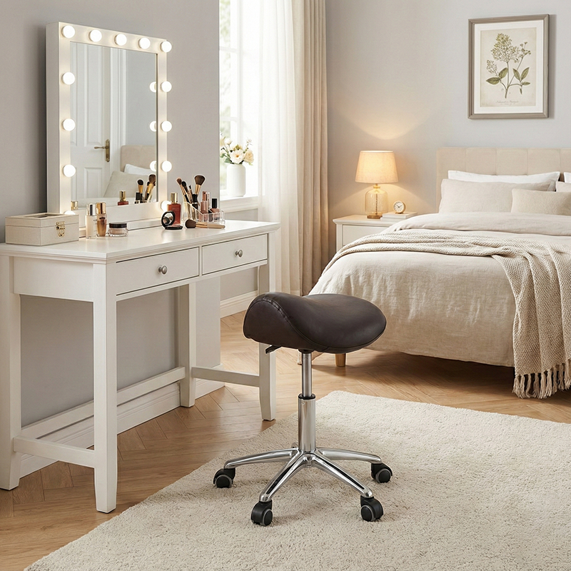 This modern minimalist vanity chair is the perfect blend of style and functional comfort for your makeup area. It features an elegantly curved seat upholstered in classic black PU leather, complemented by a soft, integrated cushion for enhanced comfort. Supported by a sturdy iron base, the chair offers smooth mobility, bringing a clean, chic, and polished look to any bedroom or dressing space.