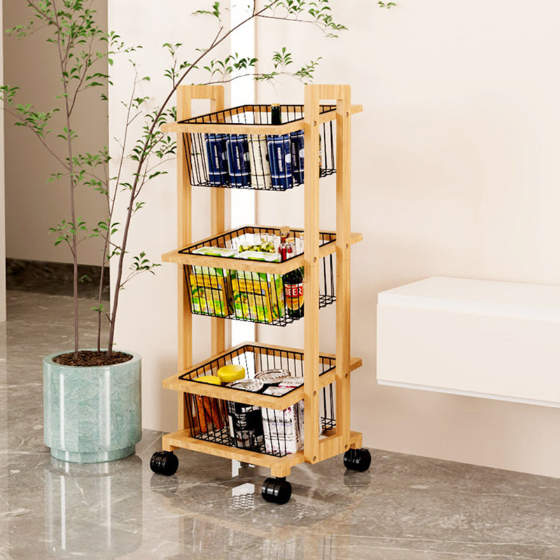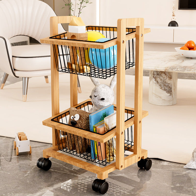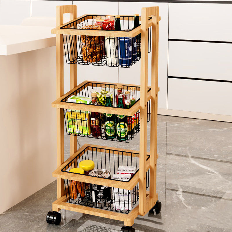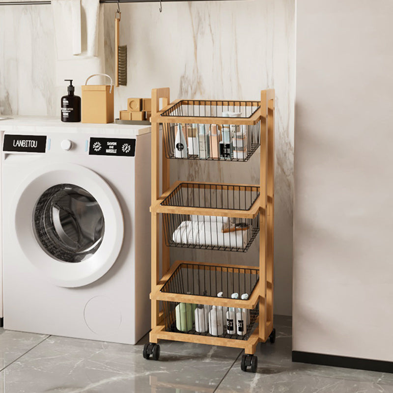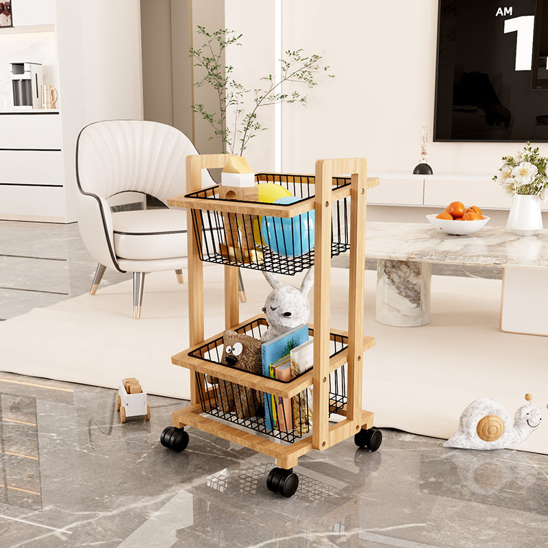 This modern minimalist rolling storage rack combines natural beech wood and durable black metal in a sleek rectangular frame. Featuring 2 or 3 spacious baskets and smooth wheels for easy mobility, it's a stylish and functional organizer for your living room, bedroom, or retail display space.