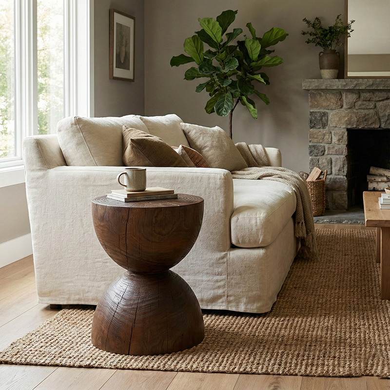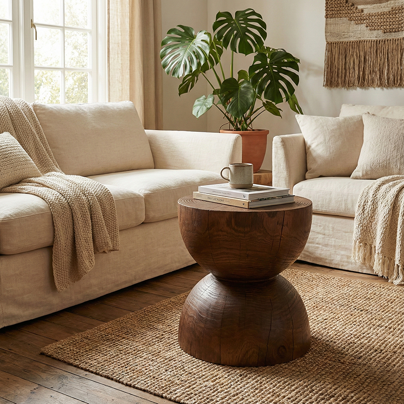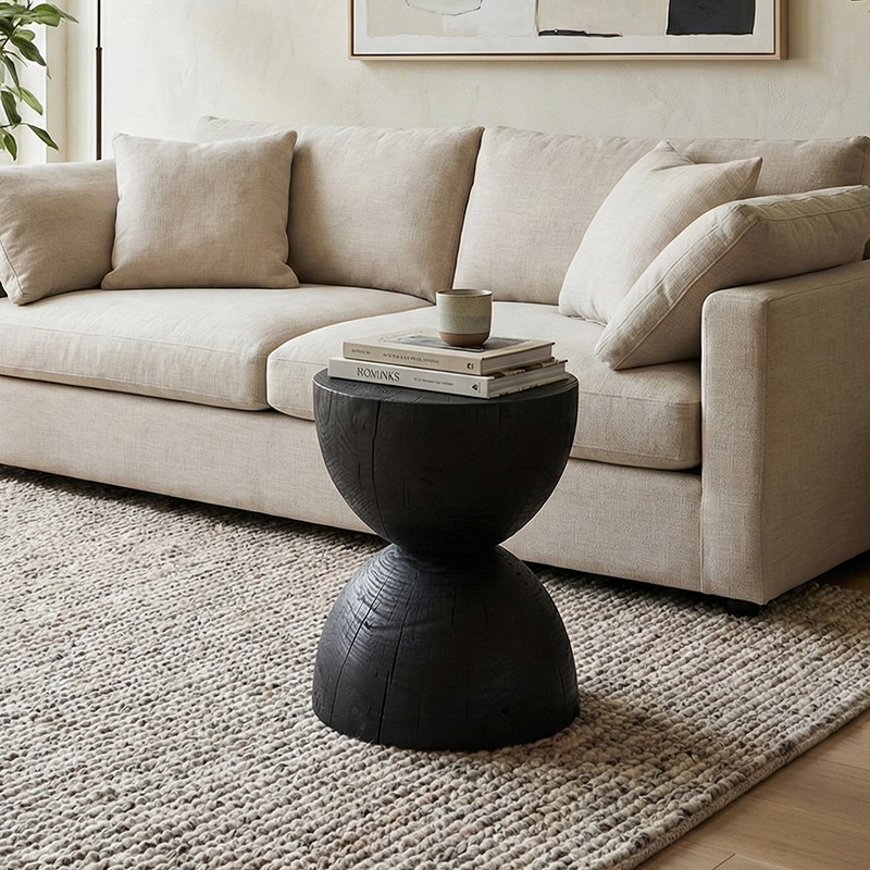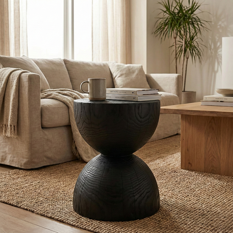 Crafted from durable solid wood, this modern minimalist hourglass side table is a stable and stylish addition, anchoring any living room space with its distinctive form. Available in versatile walnut and black finishes, it offers a timeless aesthetic coupled with long-lasting durability, making it the perfect companion for your favorite sofa or accent chair.