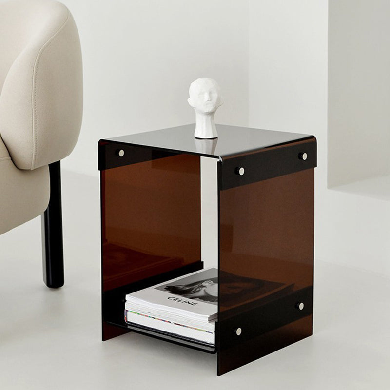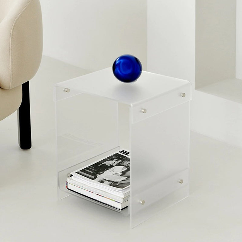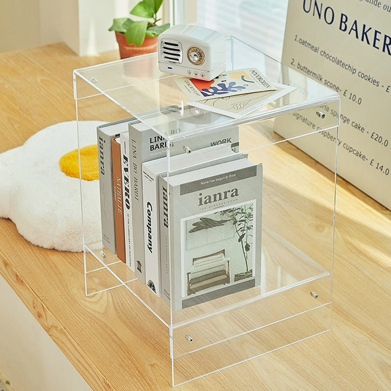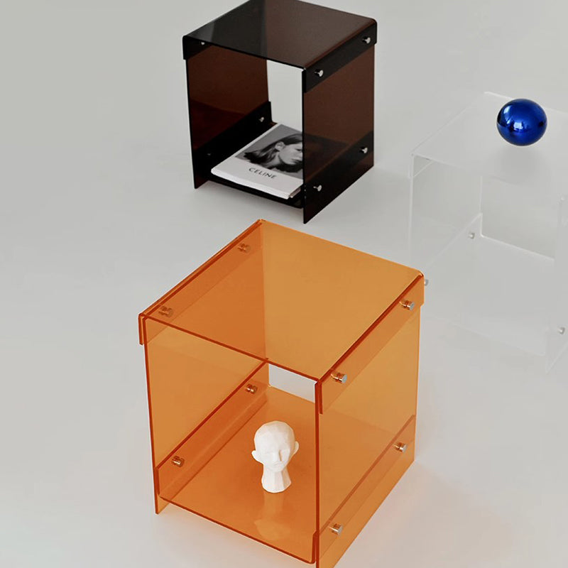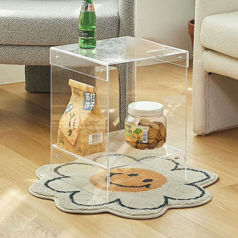 This modern minimalist acrylic rectangular side table features a crystal-clear two-tier structure, offering both style and functional storage for living rooms and bedrooms. Available in transparent, orange, tea brown, and frosted clear, its glossy acrylic design adds a sleek, lightweight accent perfect as an end table, nightstand, or corner table.