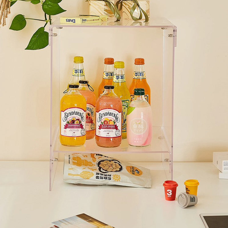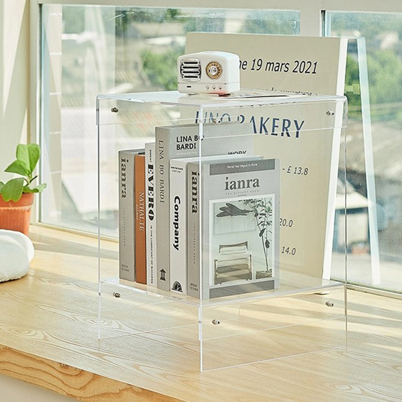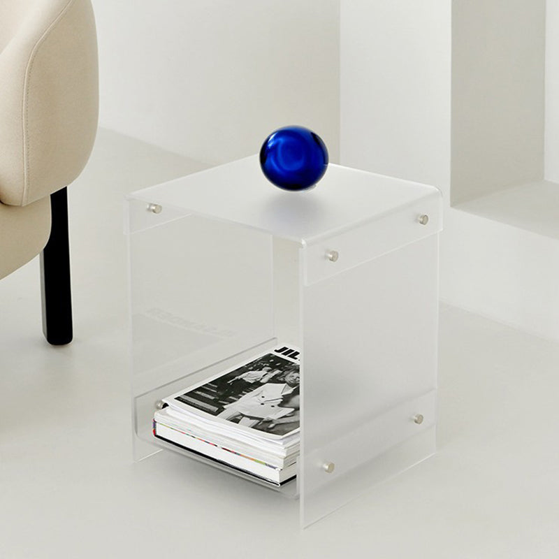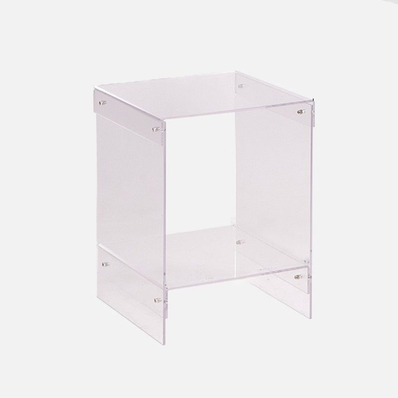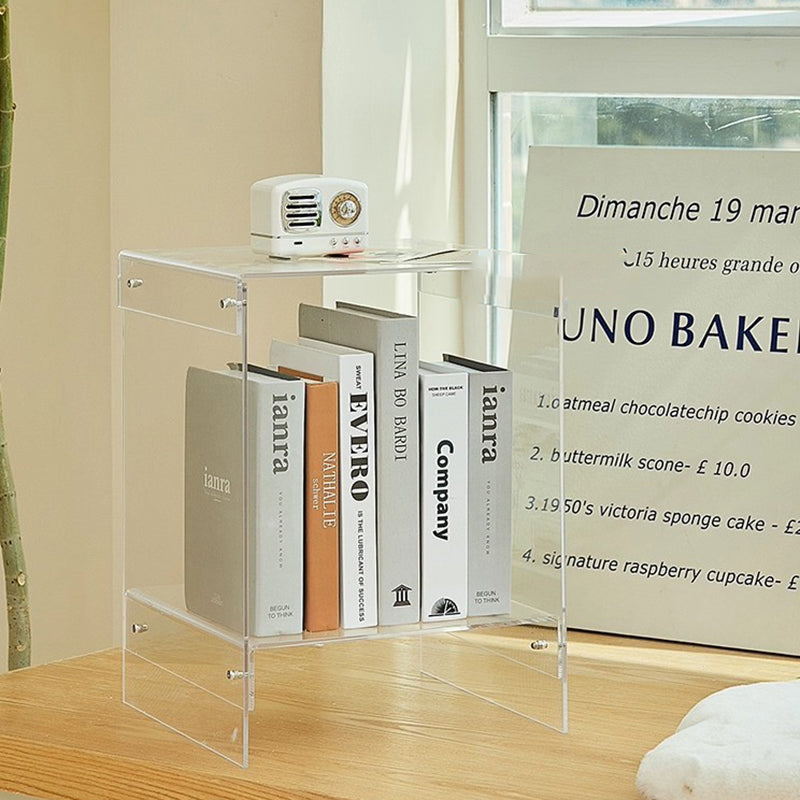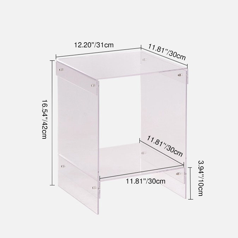 This modern minimalist acrylic rectangular side table features a crystal-clear two-tier structure, offering both style and functional storage for living rooms and bedrooms. Available in transparent, orange, tea brown, and frosted clear, its glossy acrylic design adds a sleek, lightweight accent perfect as an end table, nightstand, or corner table.