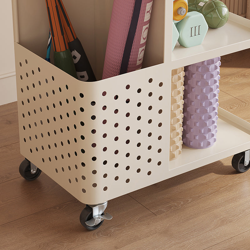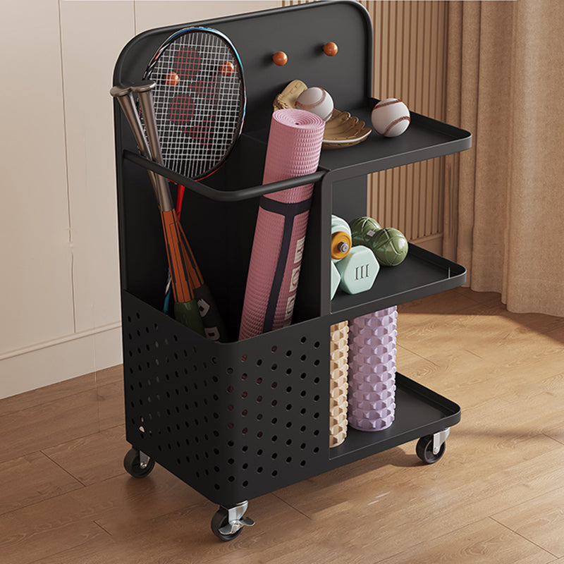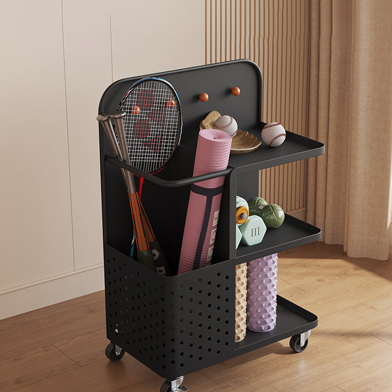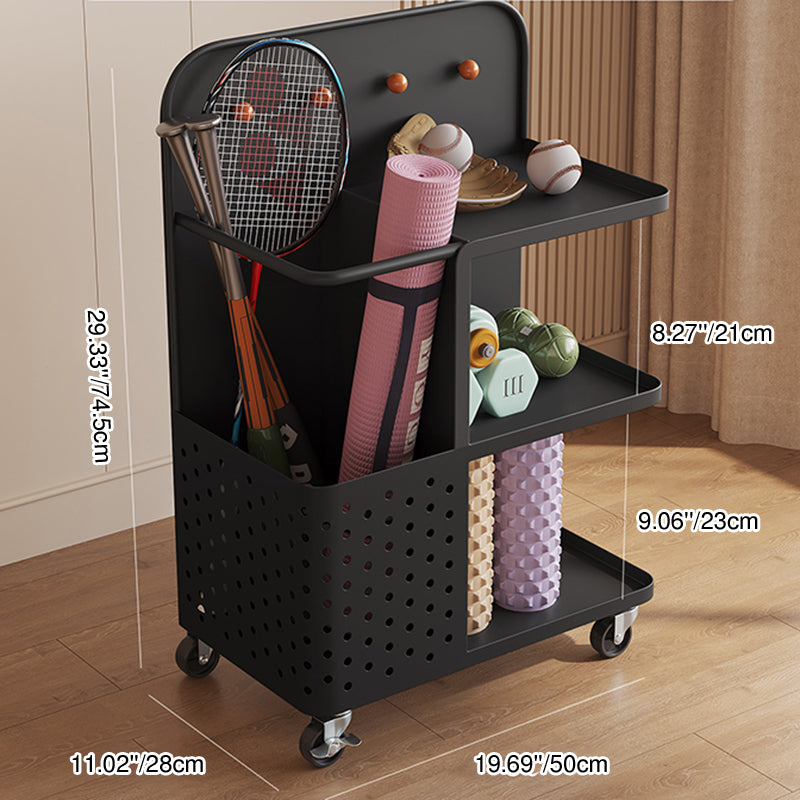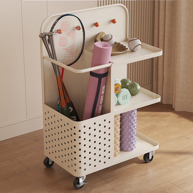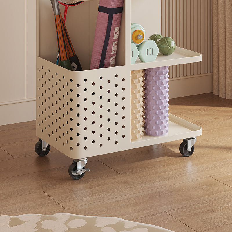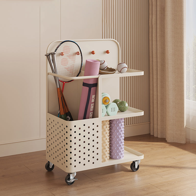 This modern carbon steel movable storage rack features a durable baked-paint finish that resists rust and peeling, designed with 3 tiers plus one basket to neatly organize yoga mats, fitness gear, and everyday items. Available in Cream-White and Black, it fits perfectly in living rooms or bedrooms while offering stable, minimalist storage for any home.