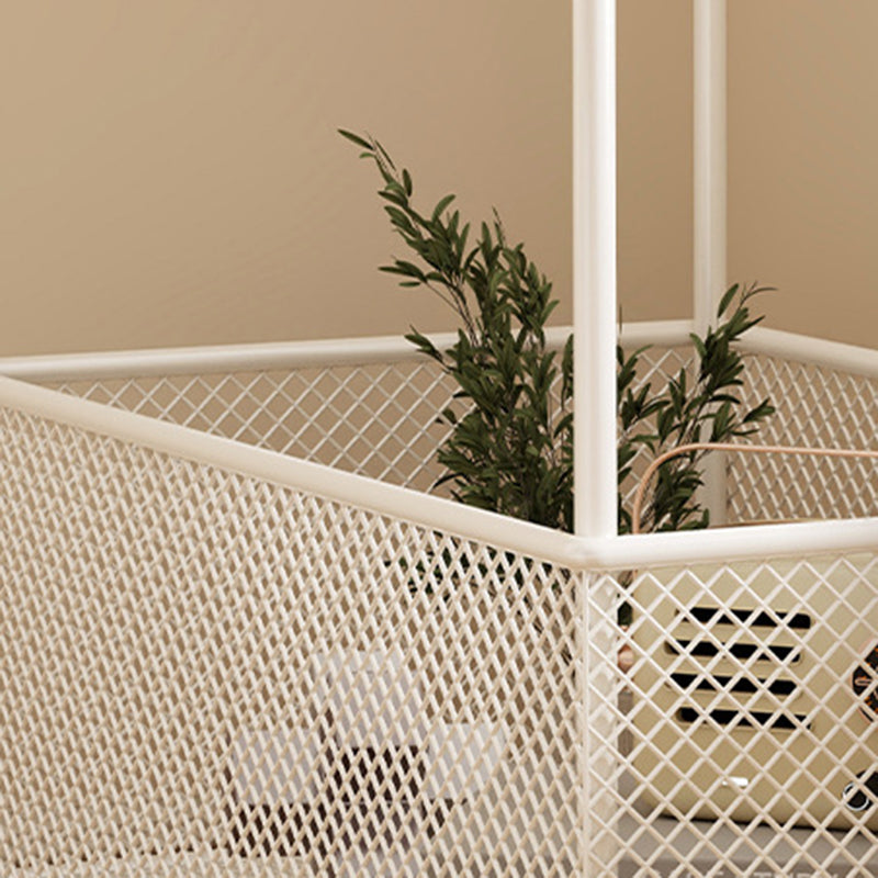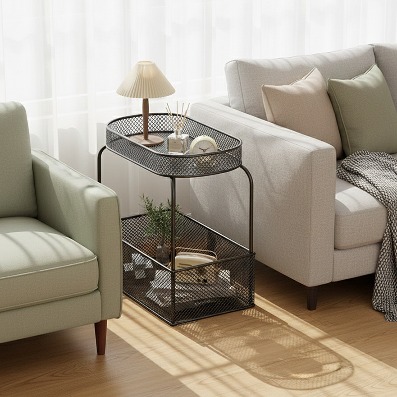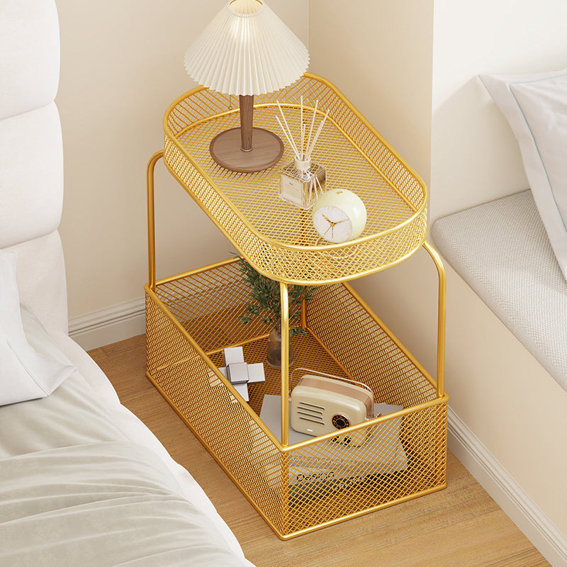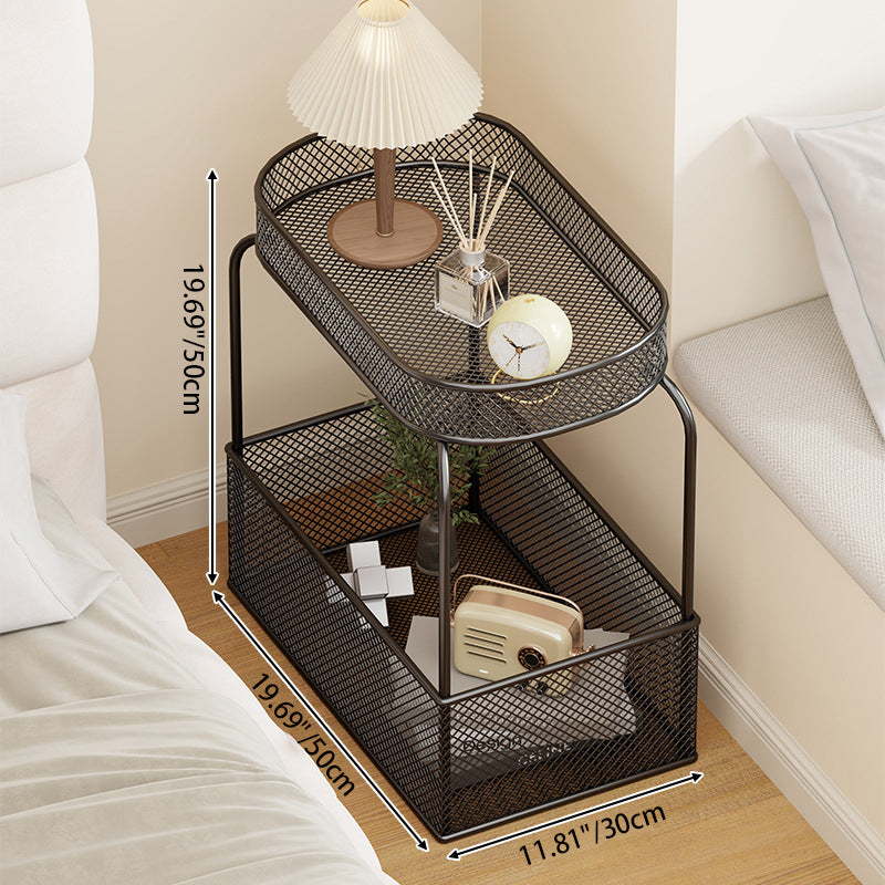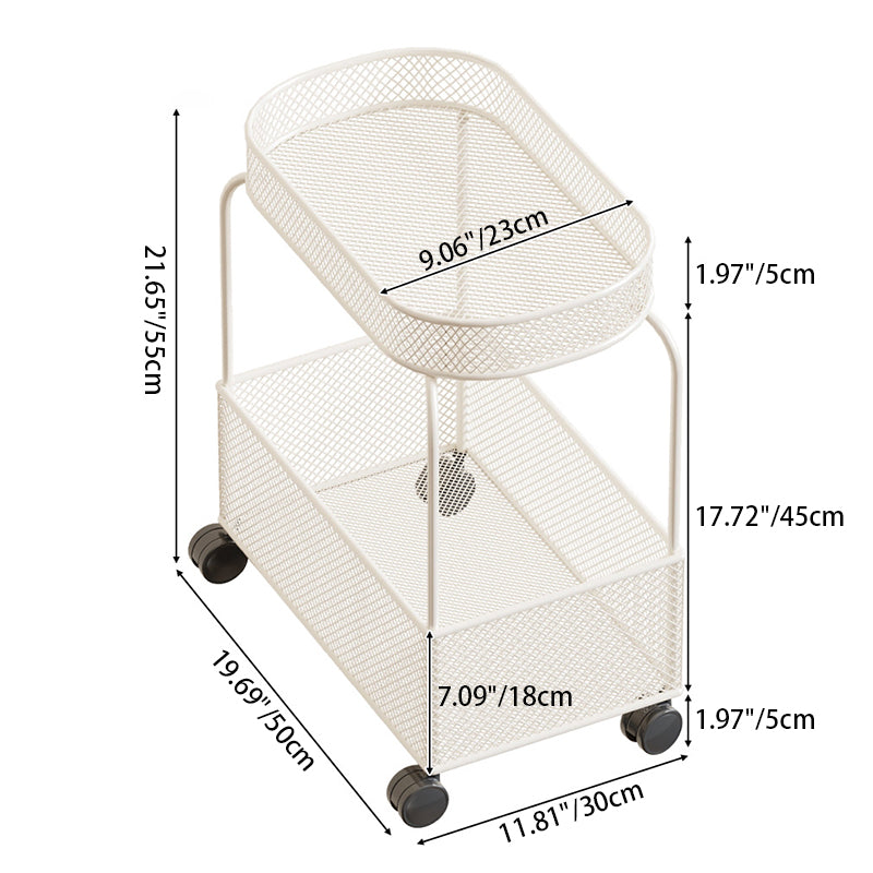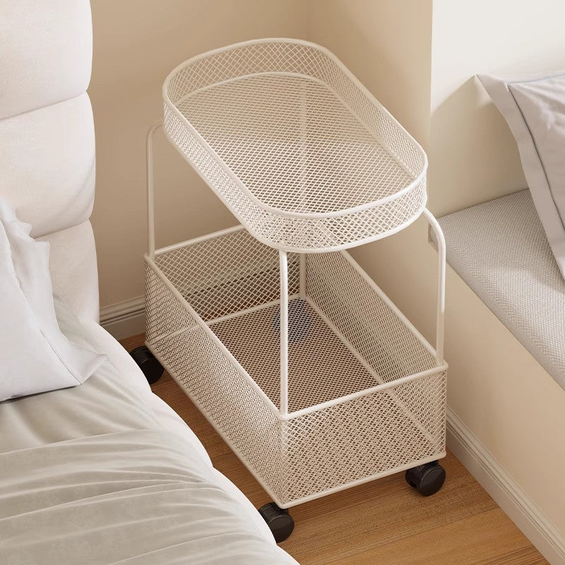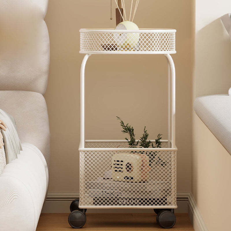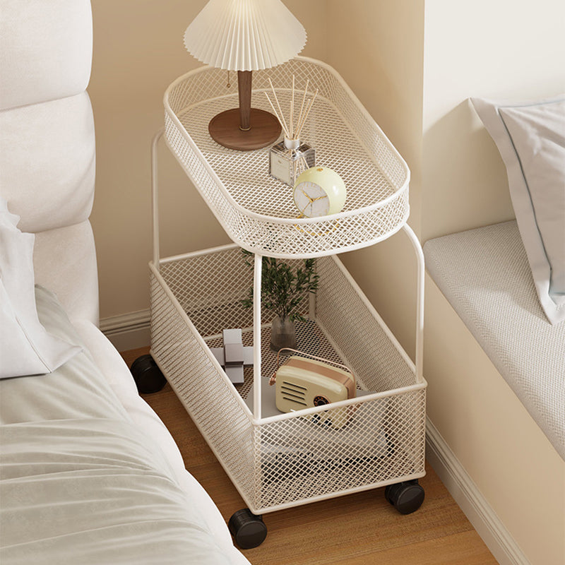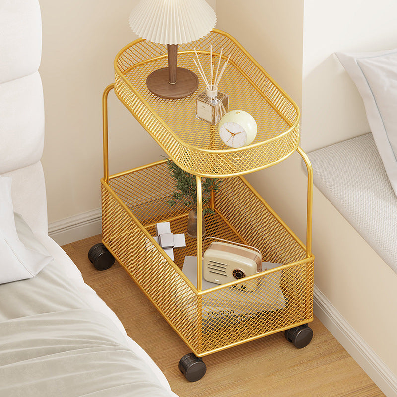 This modern minimalist iron side table features a sturdy rectangular frame with 2-tier storage, elevated guardrails, and strong load-bearing construction. Available in black, white or gold, it includes smooth 360° swivel wheels for easy mobility, offering practical storage and display space as a sleek and versatile addition to any living room.