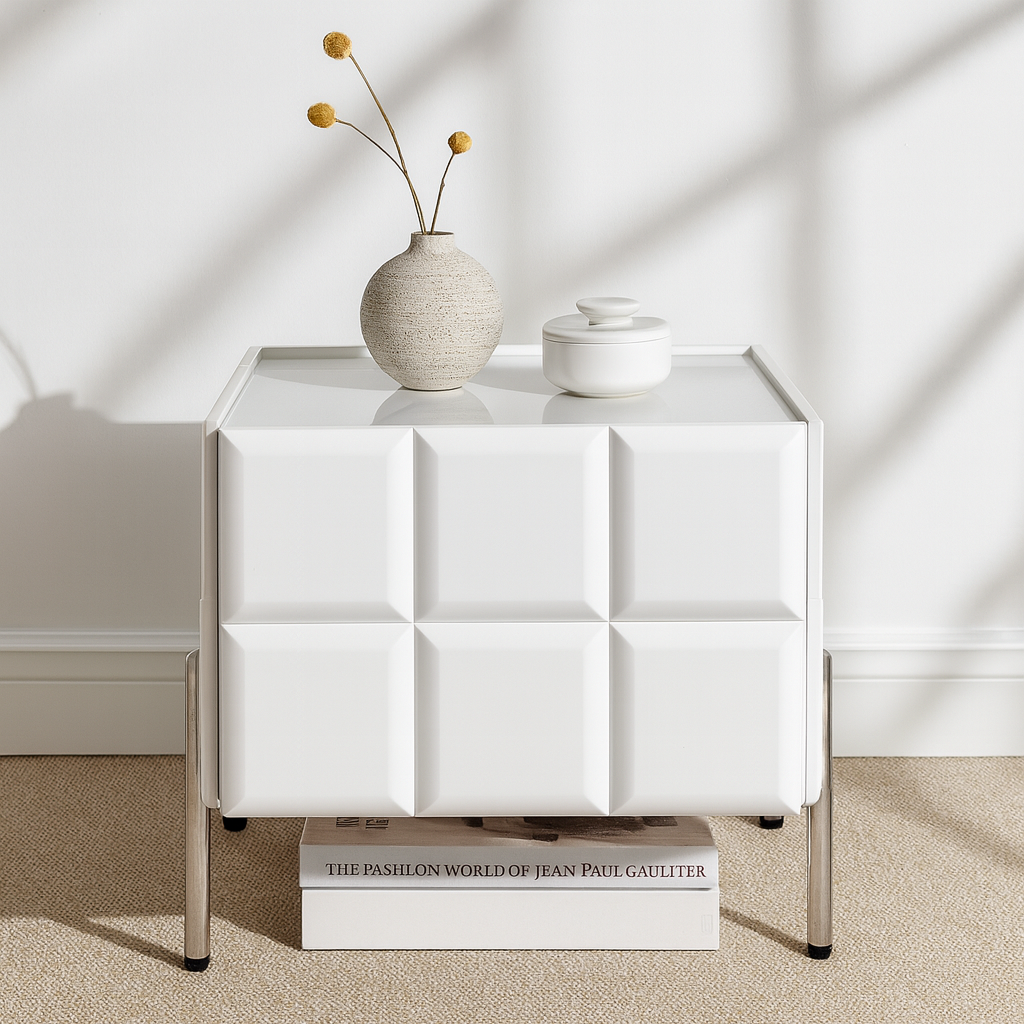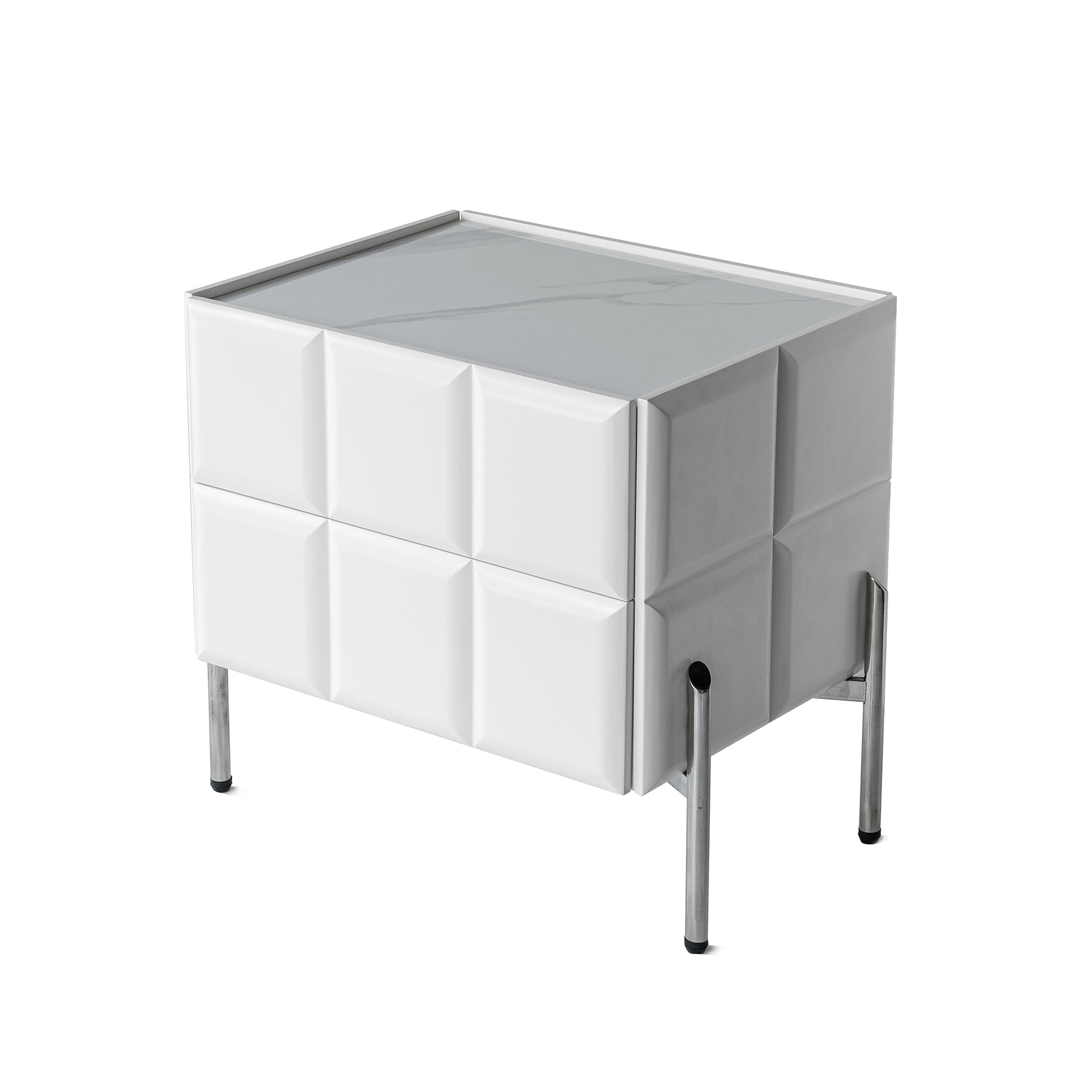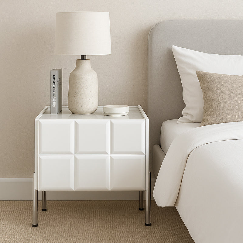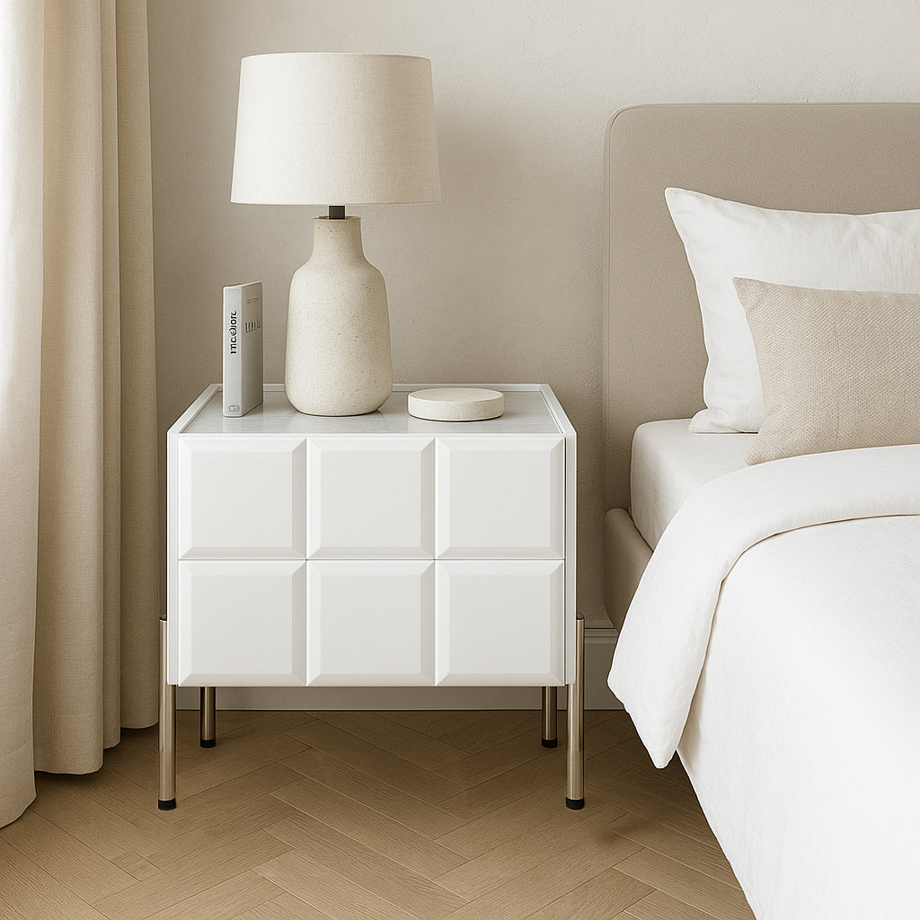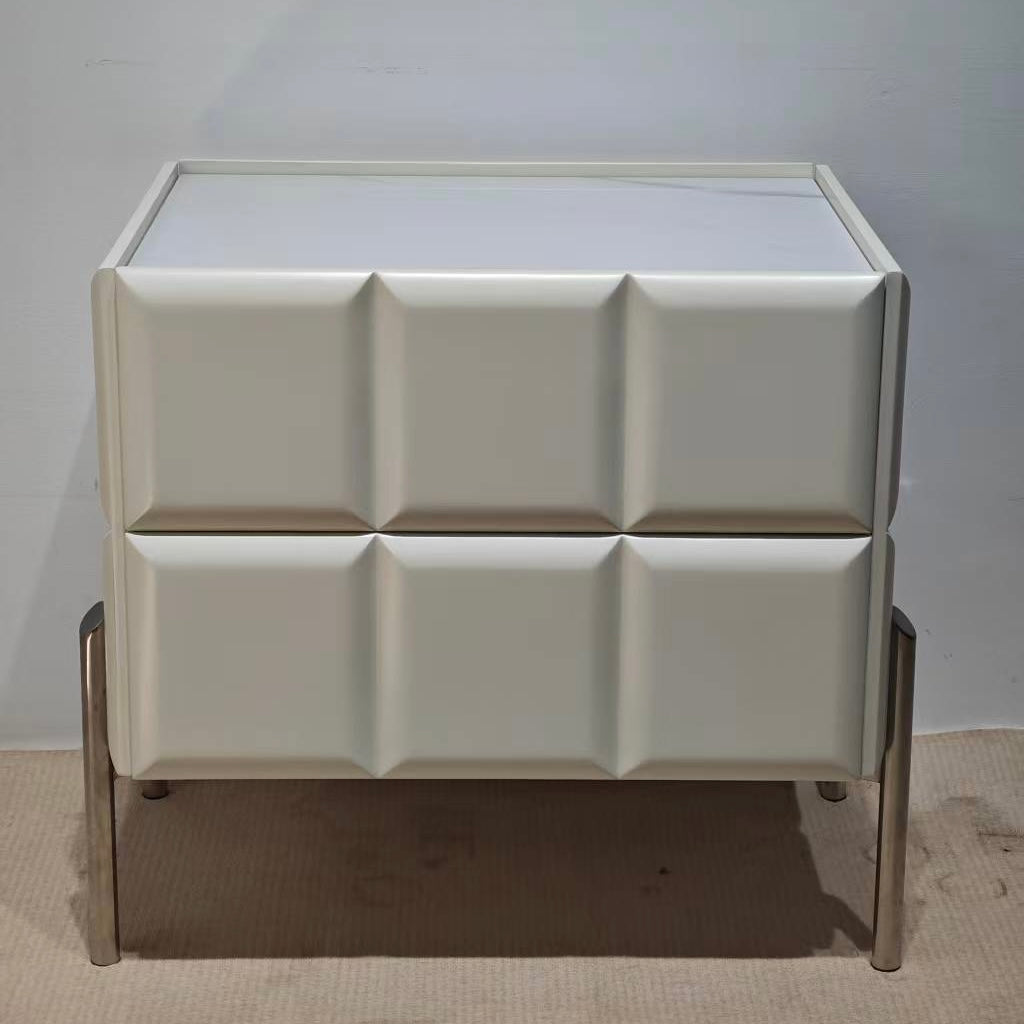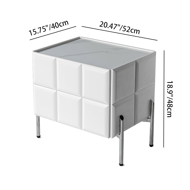 This contemporary rectangular nightstand blends a premium slate stone top with a solid multilayer plywood body and durable stainless steel legs, creating a design that is both elegant and long-lasting. Offered in black and white, it includes two smooth-gliding drawers for concealed storage and a raised-edge stone surface that keeps bedside items secure. The high-leg structure adds extra clearance for easy cleaning while maintaining a refined modern silhouette. Perfect for bedrooms seeking style, durability, and practical organization.
