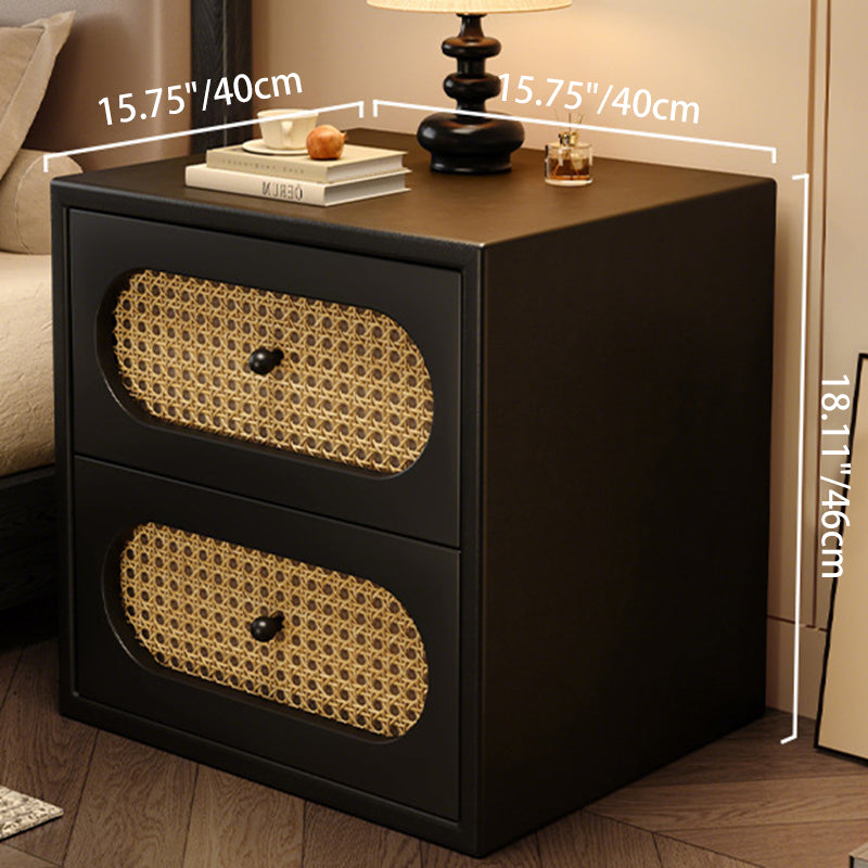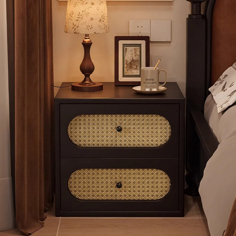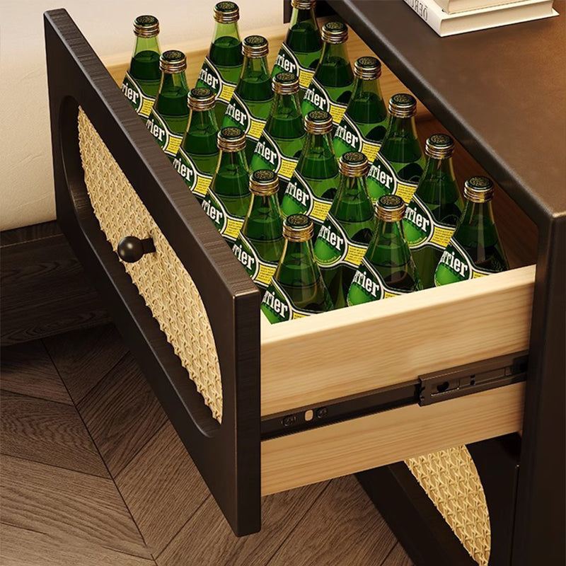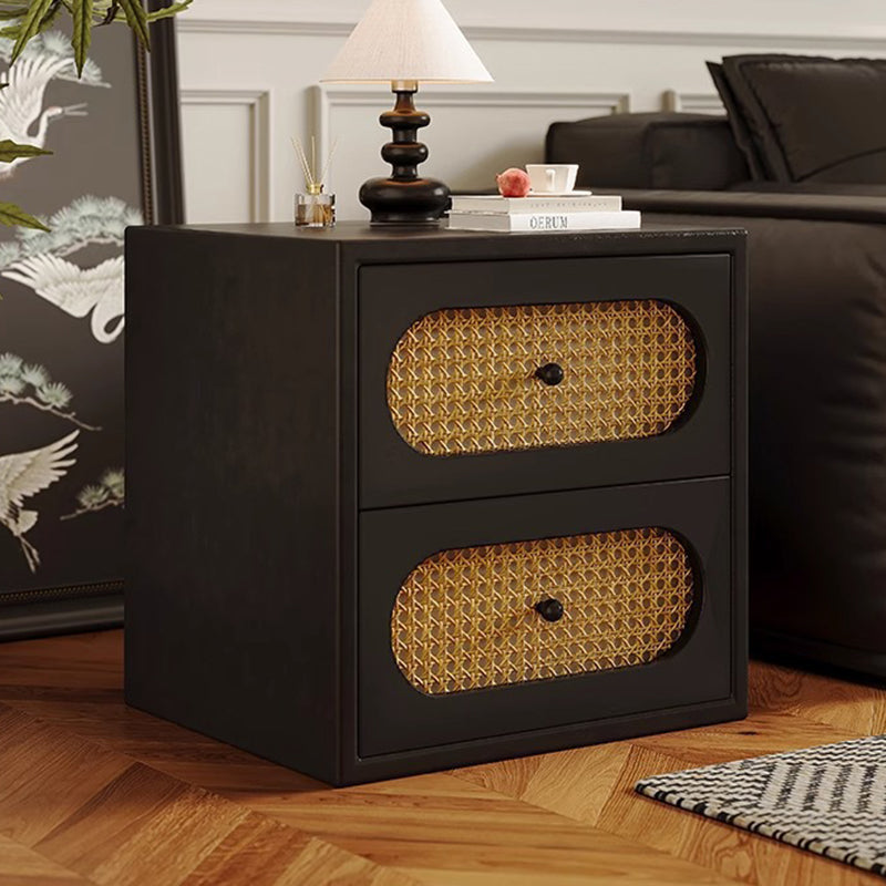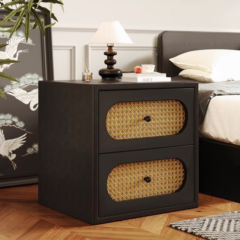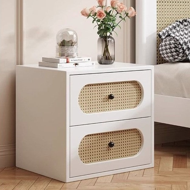 طاولة سرير جانبية ذات درجين لغرفة النوم مصنوعة من الجلد الميكروفايبر الياباني التقليدي مربع الشكل والمستطيل من خشب MDF والخشب الصلب والخشب الرقائقي وPVC ونسج الخيزران