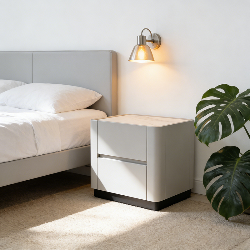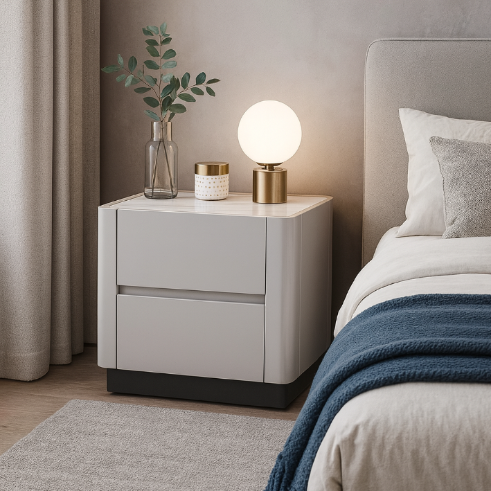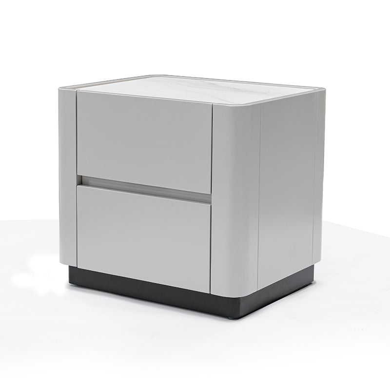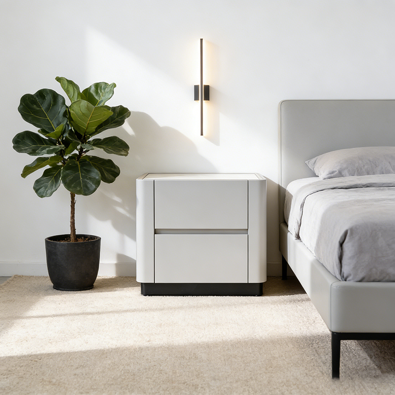 Bring effortless Parisian charm into your bedroom with this French-style bedside table. Crafted from durable solid multi-layer wood, it features soft rounded edges, a smooth light-grey finish, and a grounded black base for modern contrast. The handle-free double drawer design creates a clean, elegant façade while offering practical storage for your essentials.