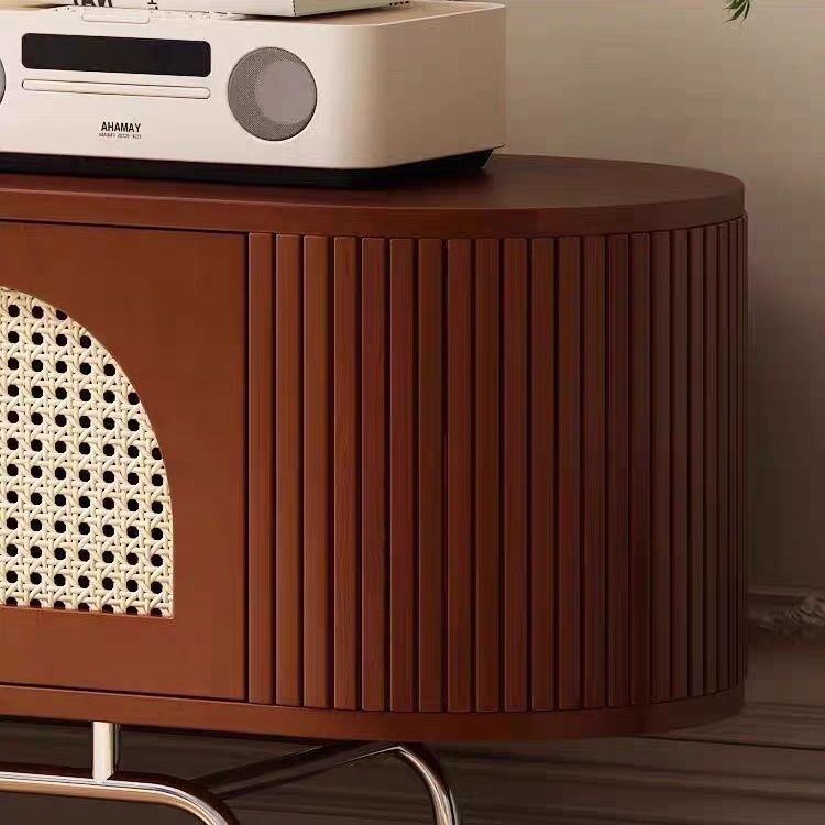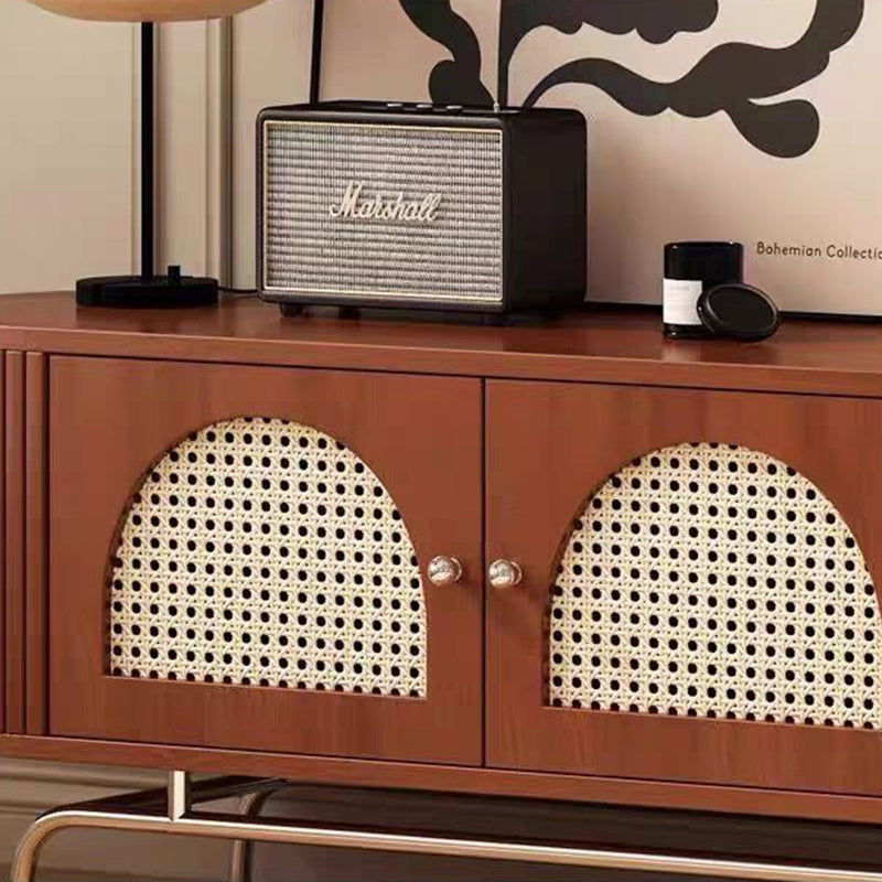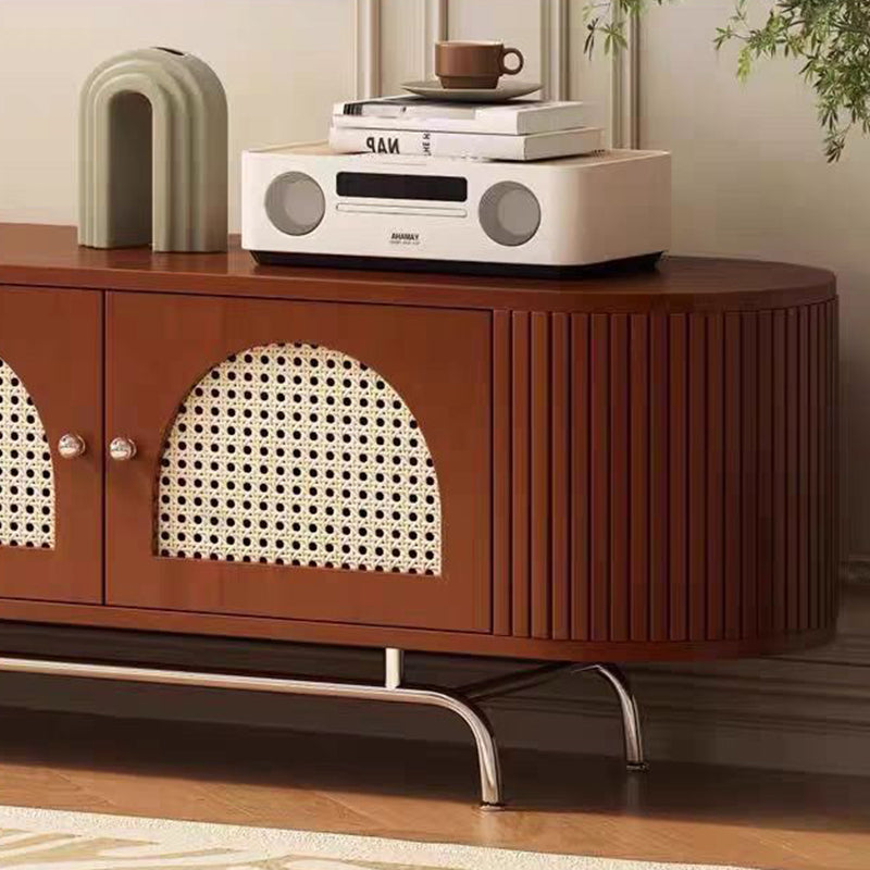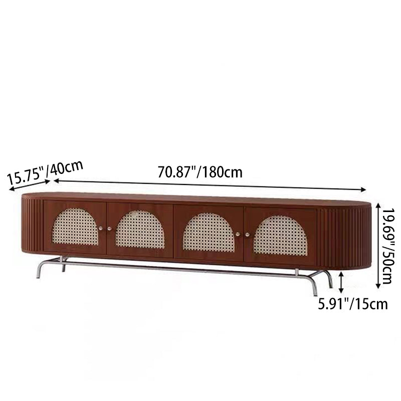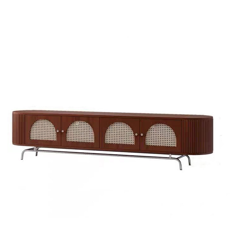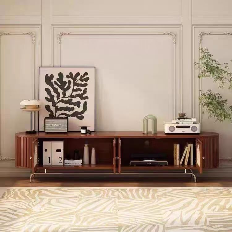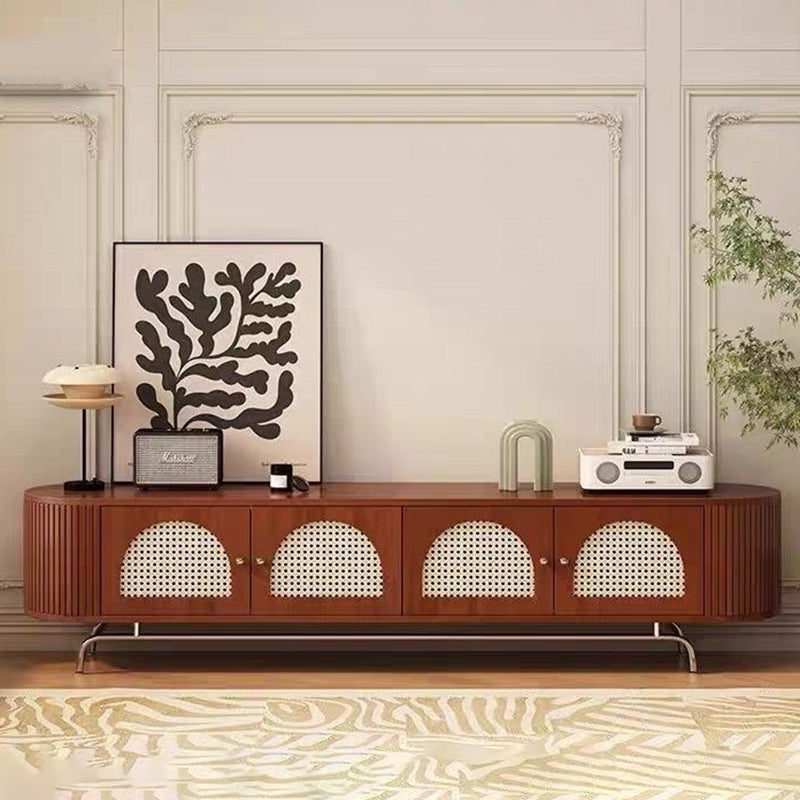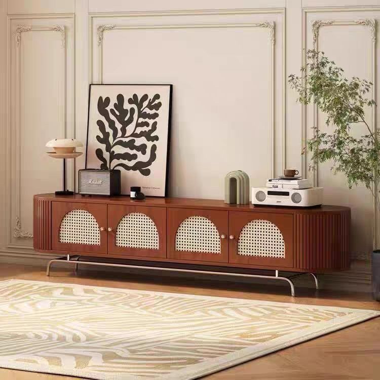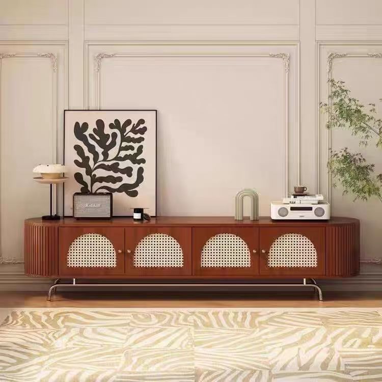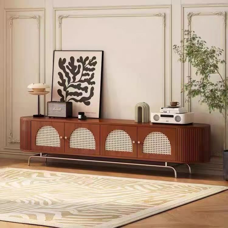 This Traditional Chinese TV stand features a pine wood and woven rattan structure with stainless steel support, finished in vintage and walnut tones for a warm, timeless look. Built with mortise-and-tenon craftsmanship, it offers 4 spacious storage compartments and a stable, reinforced frame that resists sagging—ideal for small living rooms seeking functional and elegant media storage.