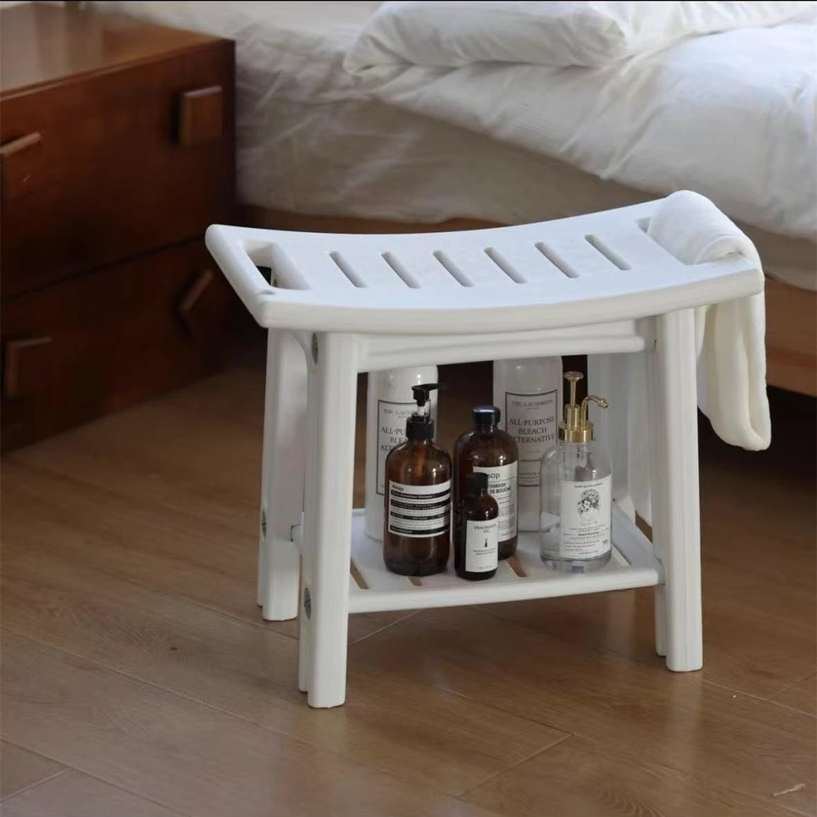 Crafted from high-toughness HDPE plastic, this modern minimalist curved rectangular stool features a waterproof, non-slip design—safe for kids, pregnant women and seniors. Available in white and gray, it’s a practical, durable seating option for bathrooms and hallway.
