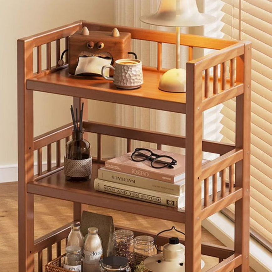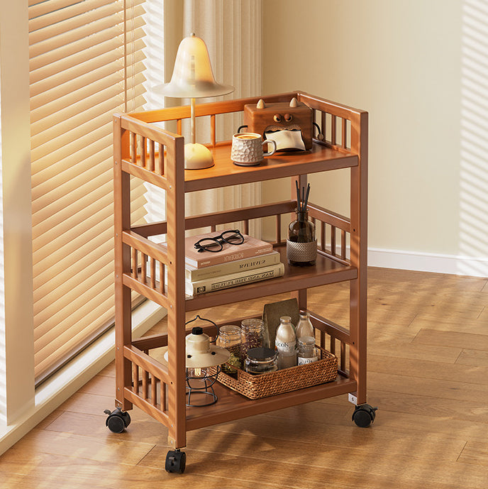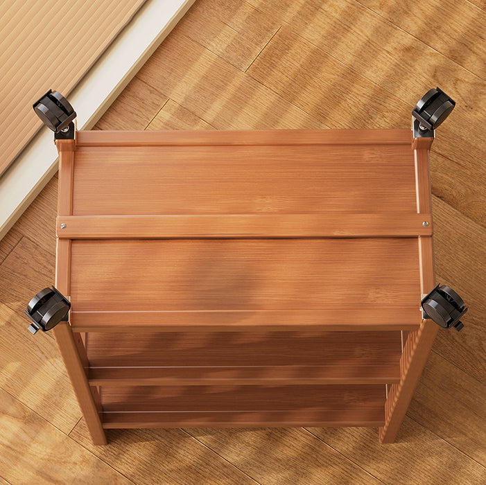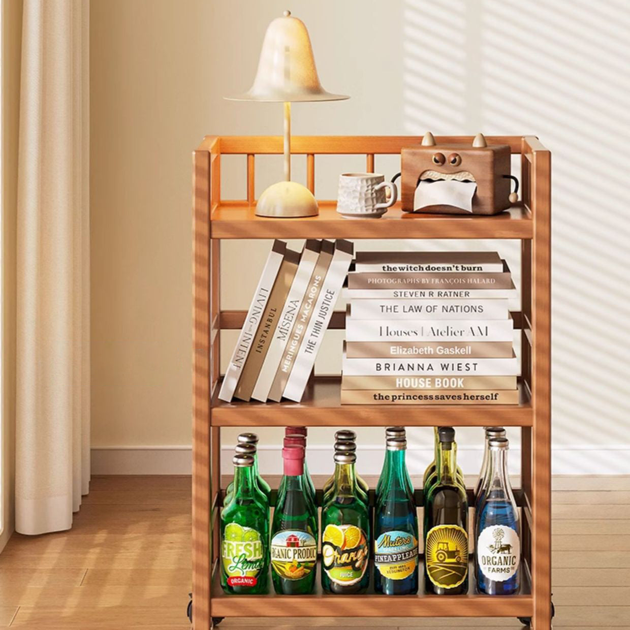 This modern minimalist rolling storage rack is crafted from durable bamboo and MDF, featuring a square open-frame design with 2- spacious tiers for flexible organization. Designed with protective guard rails and smooth-rolling wheels, it offers convenient mobility and secure storage, making it ideal for living rooms, kitchens, or multi-purpose home spaces.