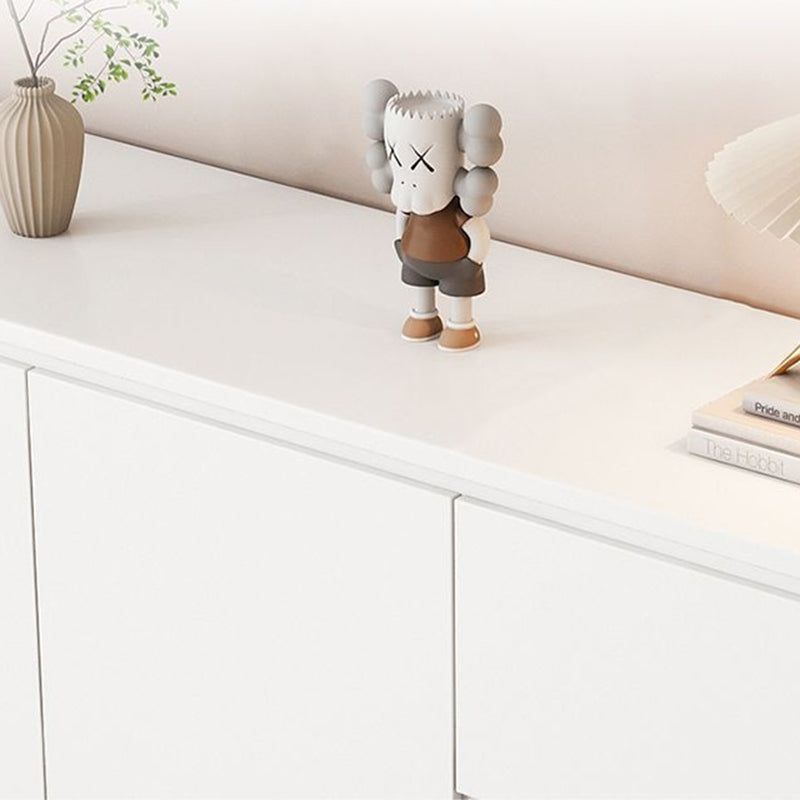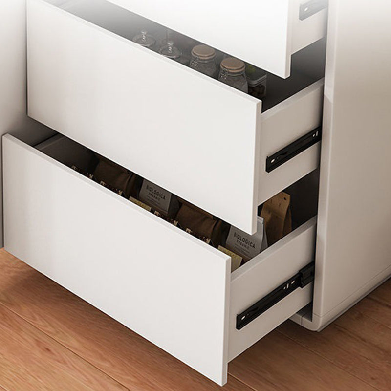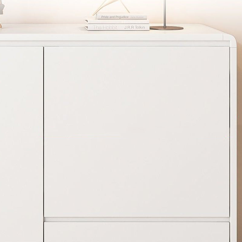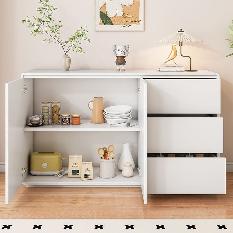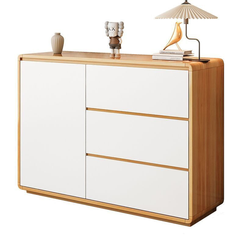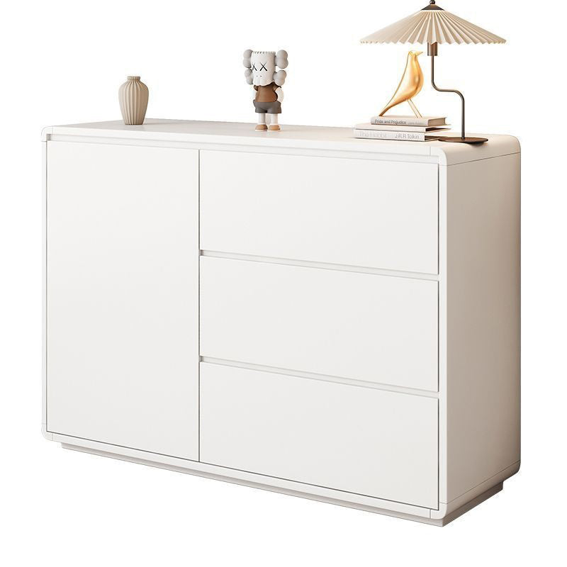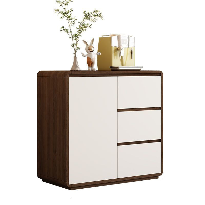 This modern minimalist storage cabinet features a sleek rounded rectangular silhouette crafted from durable wood panels with refined hardware. Designed with three smooth-glide drawers, a hidden handle system, and a practical height, it offers elegant storage for the living room while enhancing the space with its walnut and white color options and clean contemporary style.
