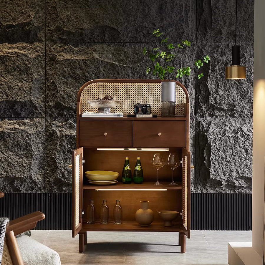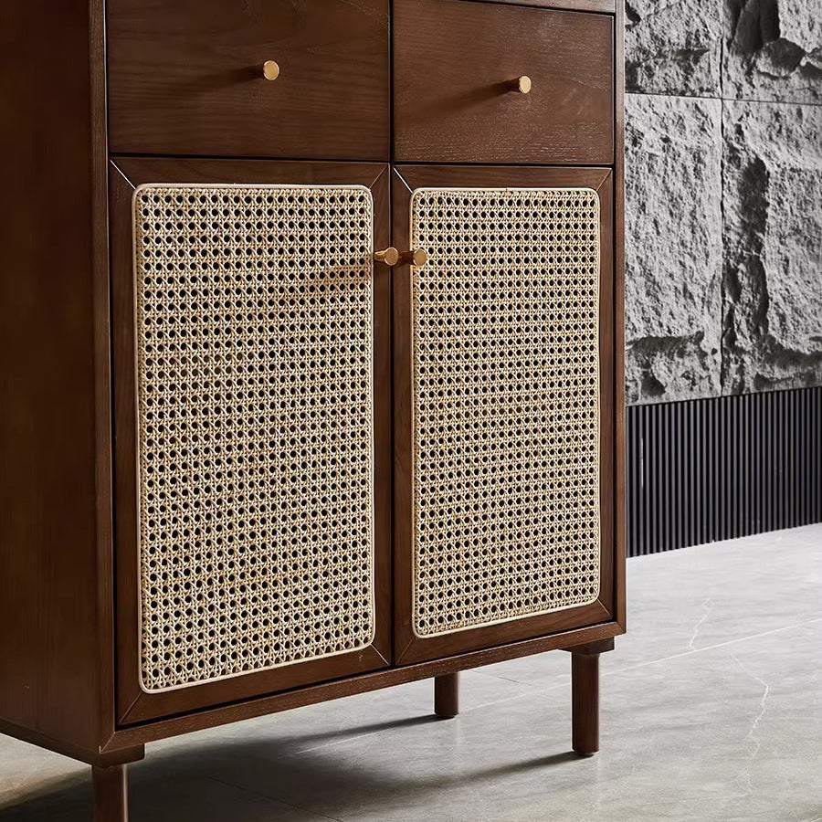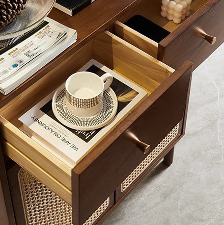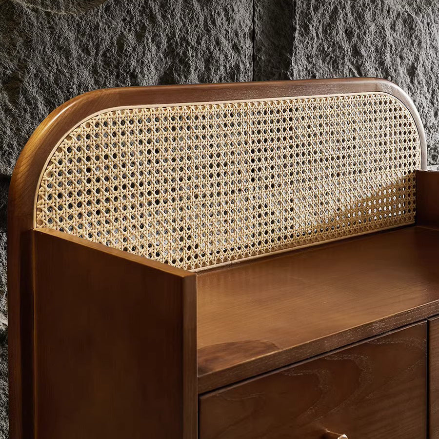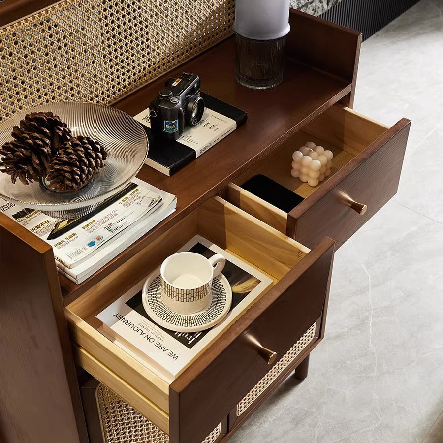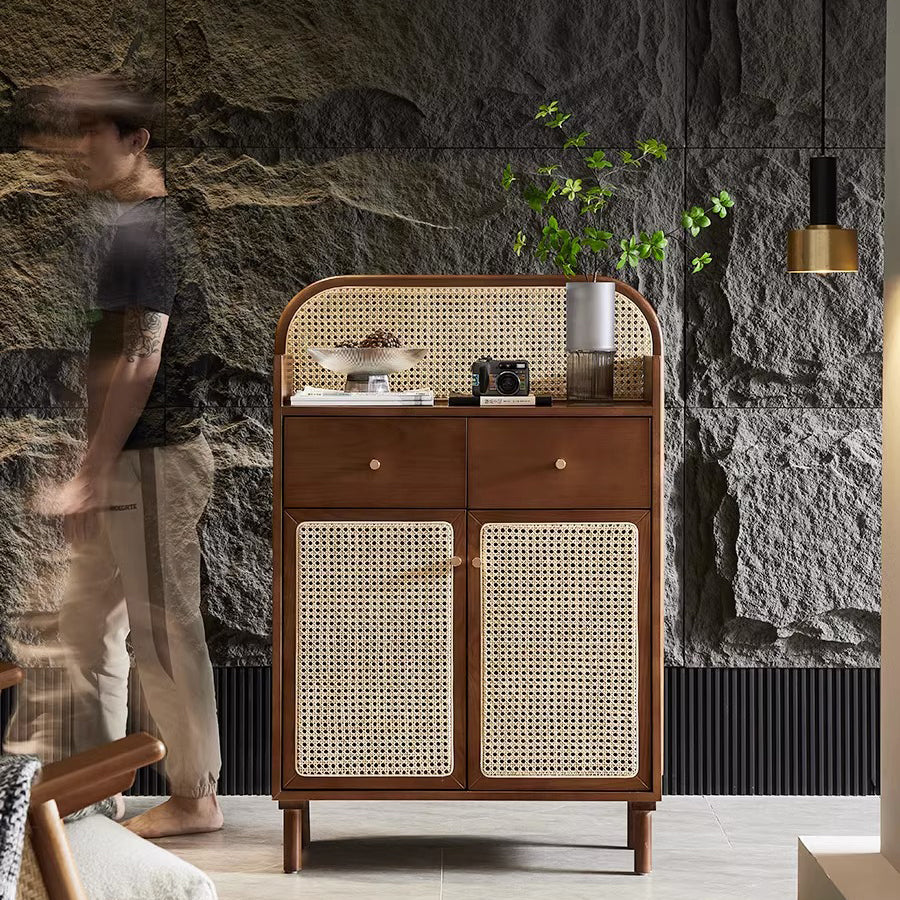 This Traditional Chinese–style side cabinet combines solid wood, Indonesian rattan, and ash wood to create a naturally textured and breathable storage solution. Designed with a smooth curved rectangular silhouette and two functional drawers, it offers stable storage and refined craftsmanship in walnut or black finishes, making it an elegant choice for living rooms, entryways, or multifunctional spaces.