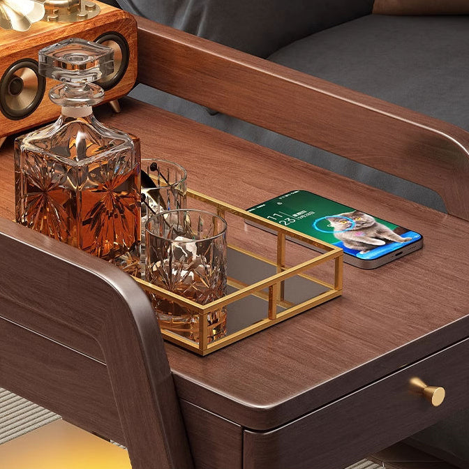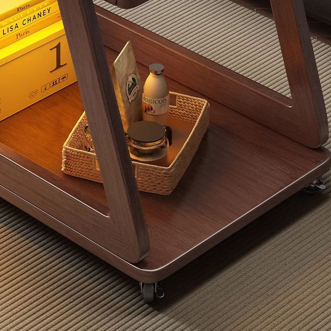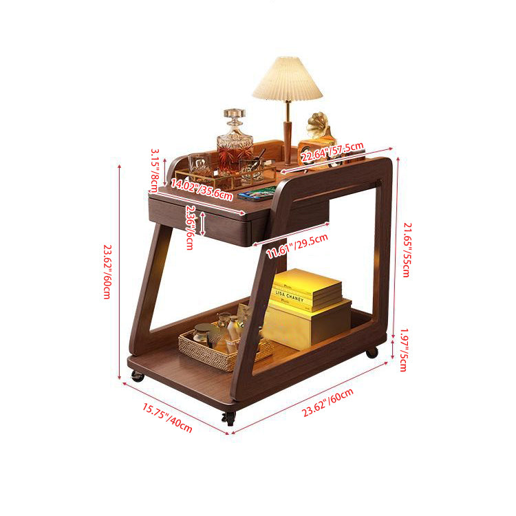 This contemporary Scandinavian solid wood side table features a movable rectangular trapezoid design with 2-tier storage. Available in walnut, natural, and white finishes, it offers a wide tabletop, rounded edges, and silent metal rails with safety guard edges—perfect for versatile living room storage and display.