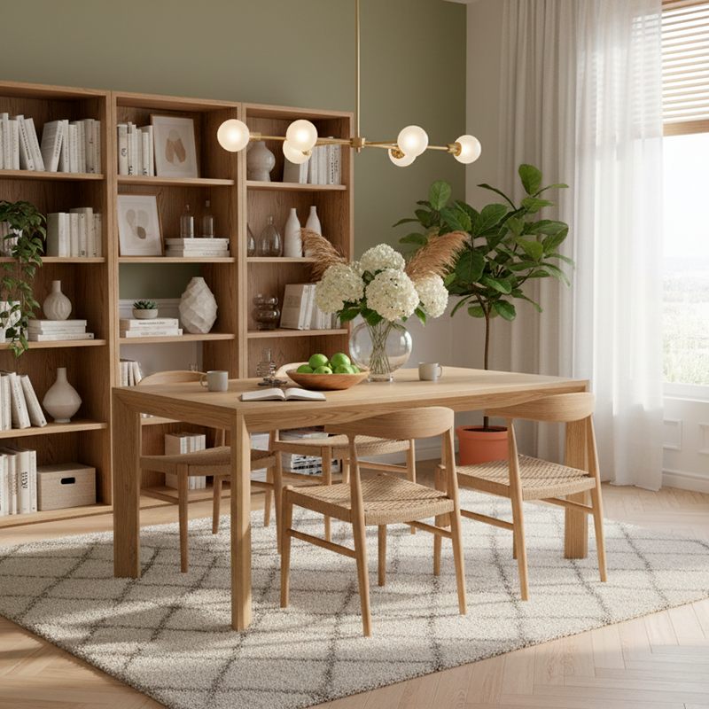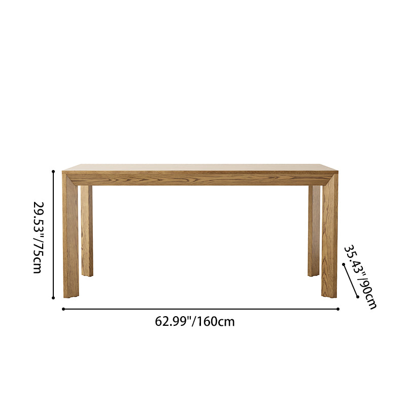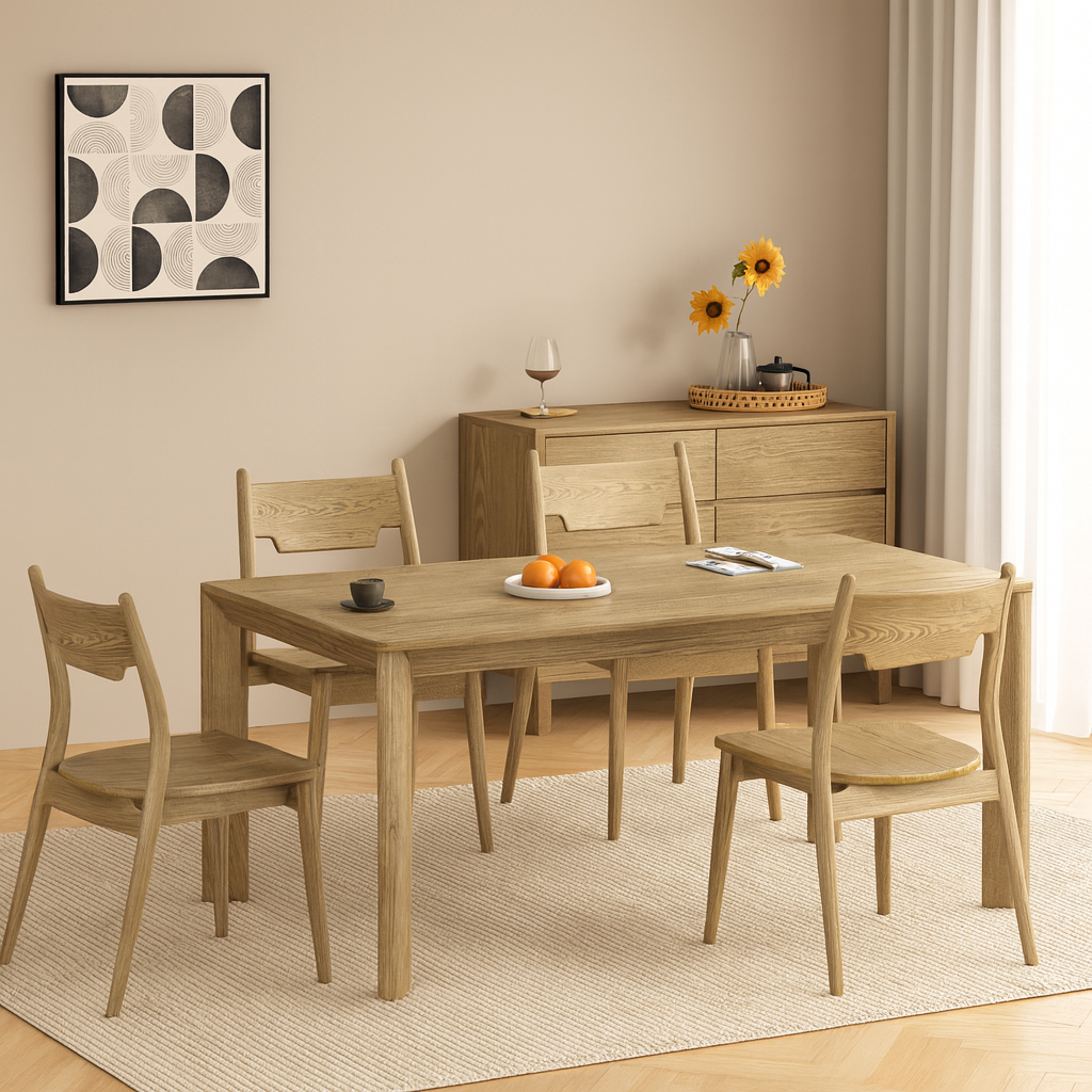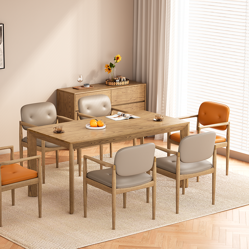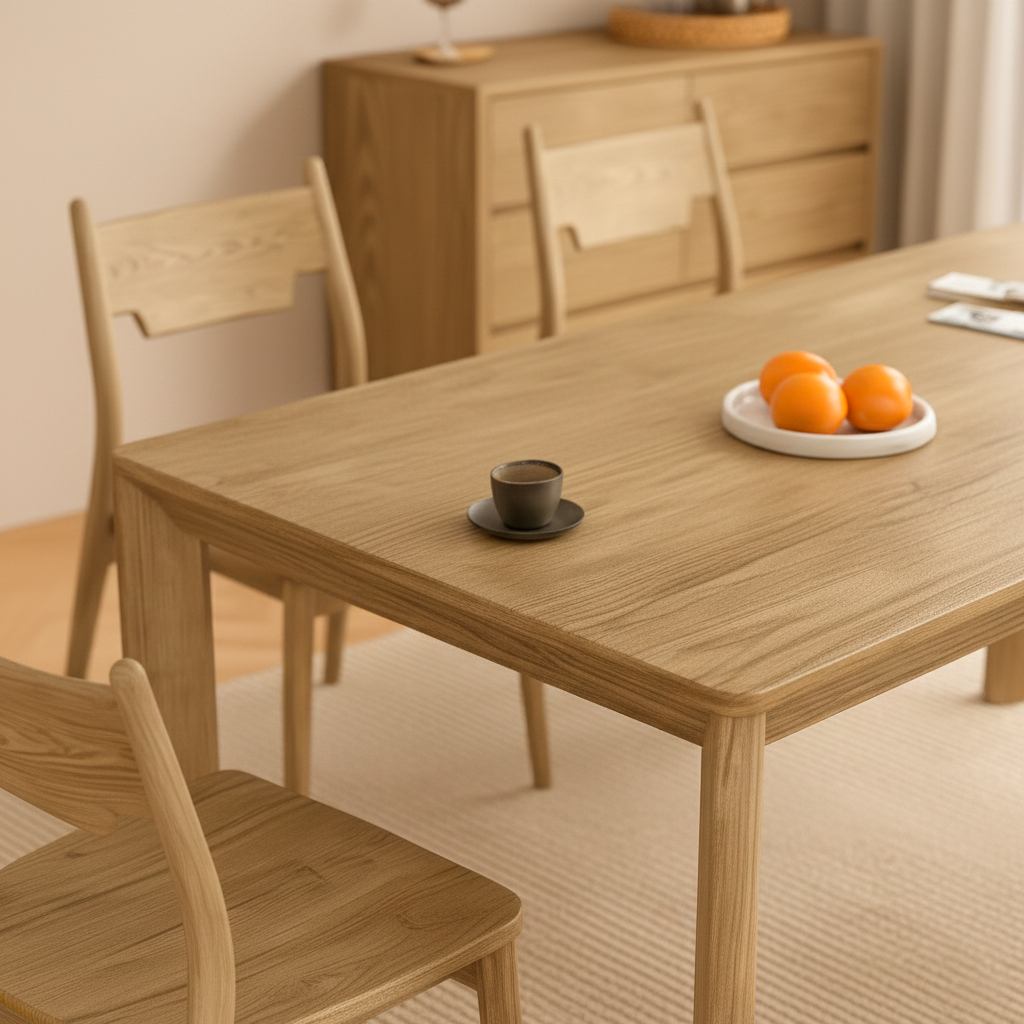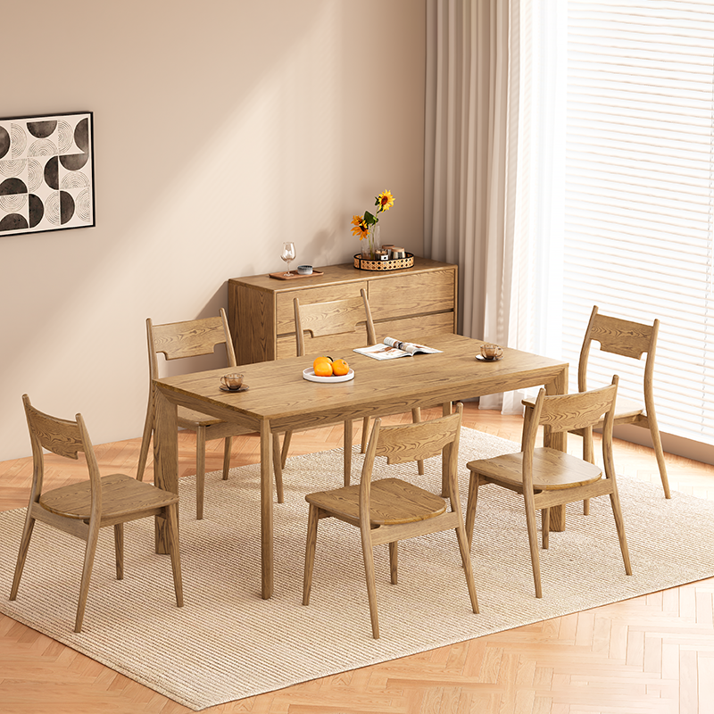 Crafted from premium North American ash wood, this dining table features a Light Walnut finish, showcasing clear, flowing natural wood grain. The rectangular tabletop with rounded edges offers a smooth, safe, and soft visual appeal. Supported by straight cylindrical solid wood legs, it maintains a simple, stable, and lightweight look, enhancing spatial openness and modern aesthetics.