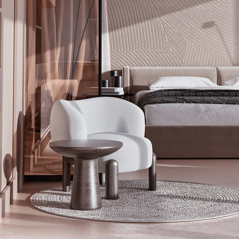 This designer lounge chair combines breathable velvet fabric with a sturdy solid wood frame in walnut, natural, or white finishes. Featuring a curved round design with supportive backrest and high-density rebound cushioning, it brings comfort and modern creative style to any living room.