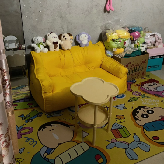 This contemporary Scandinavian sofa features a playful bunny-shaped rectangular design crafted with breathable cotton linen and EPS filling. Available in pink, yellow, khaki, blue, white, gray, and brown, it offers a soft backrest, supportive armrests, and high-resilience comfort for small apartments, bedrooms, or cozy living rooms.