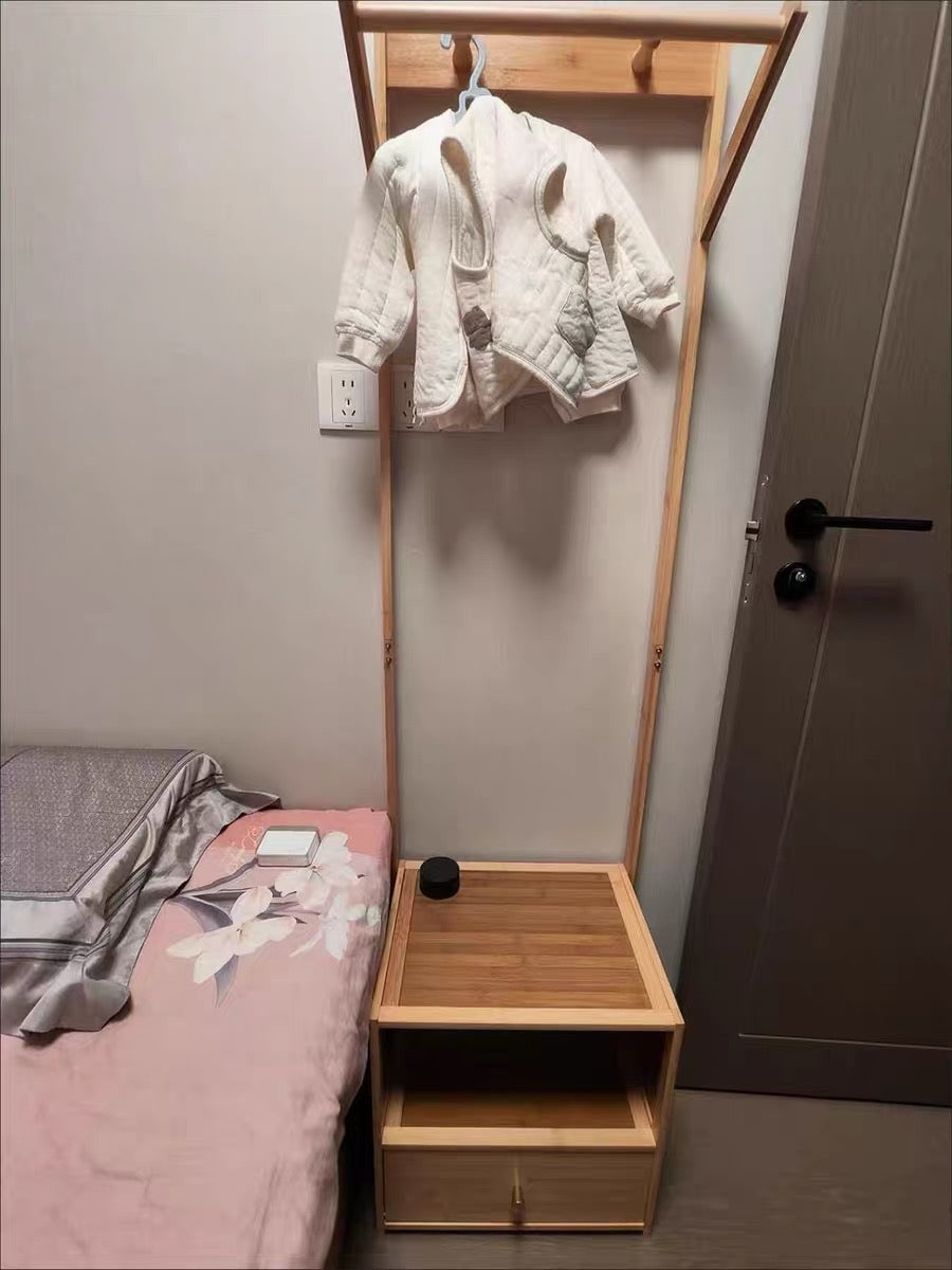 يجمع هذا الحامل الحديث للملابس بين الخيزران الطبيعي وMDF المتين في تصميم مستطيل نظيف، ويتميز بنظام تخزين مكون من خزانة واحدة ورفين وقضيب تعليق قوي. متاح بتشطيبات باللون الطبيعي ولون الشاي، ويوفر تنظيمًا عمليًا بجانب السرير لغرف النوم مع إبقاء الملابس في متناول اليد بسهولة.