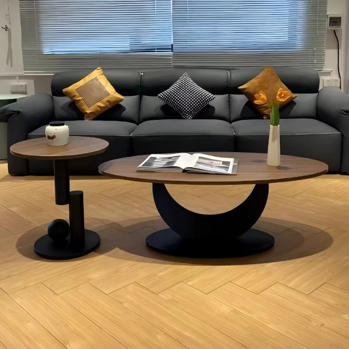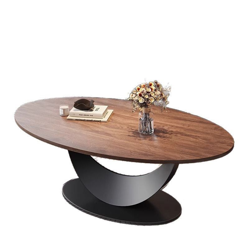 This Contemporary Scandinavian coffee table features an oval, softly curved silhouette crafted from engineered wood with iron support, offering strong structural stability, moisture resistance, and excellent load-bearing performance. Finished in walnut, black, or almond, the single-tier design brings a refined, minimalist accent to modern living rooms while resisting warping and cracking over time.