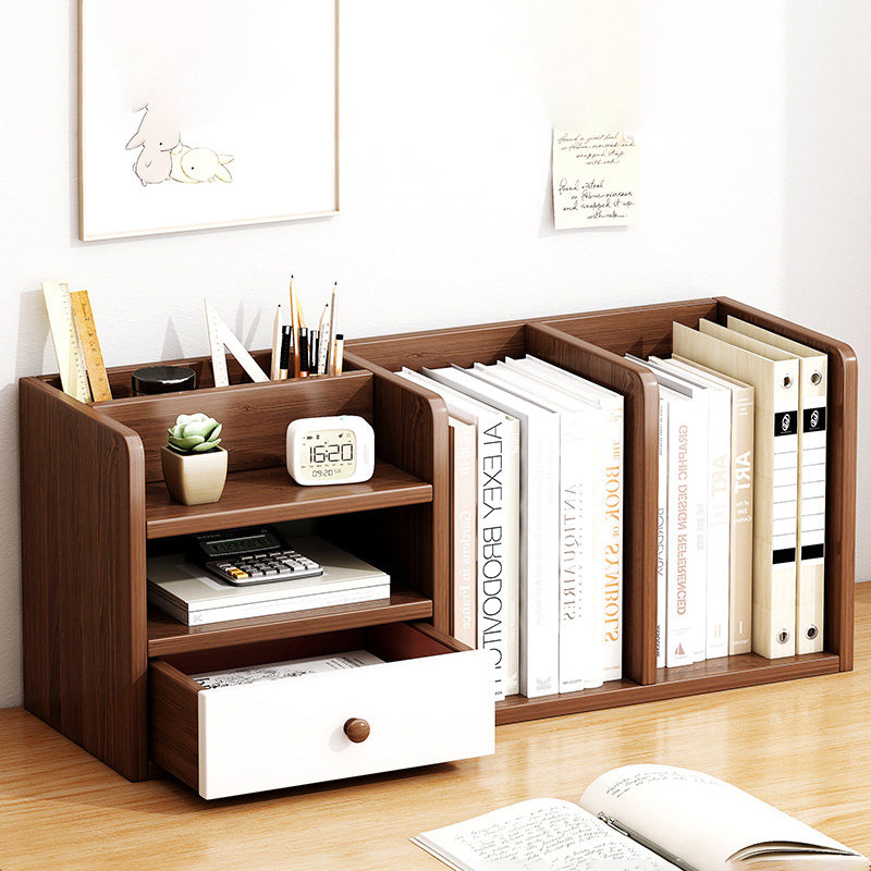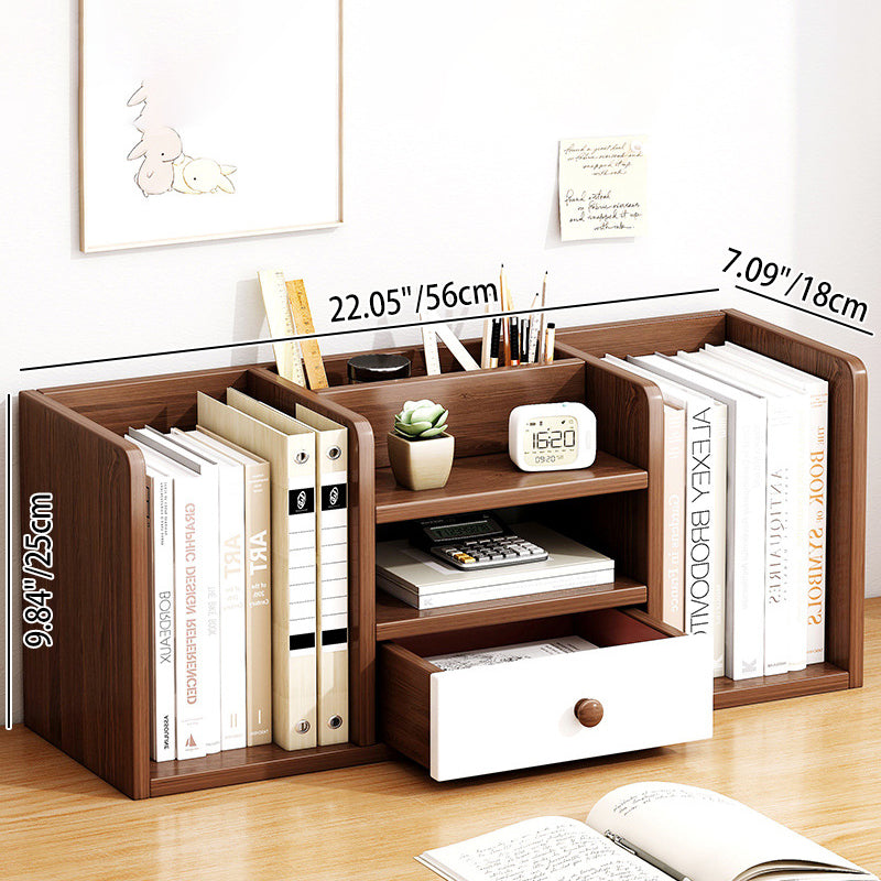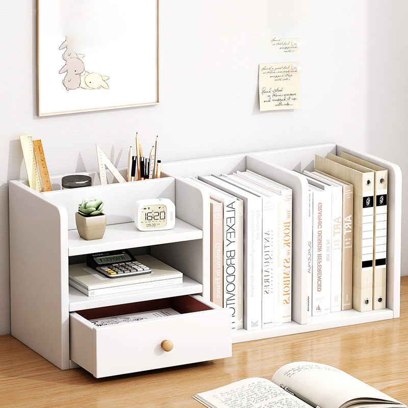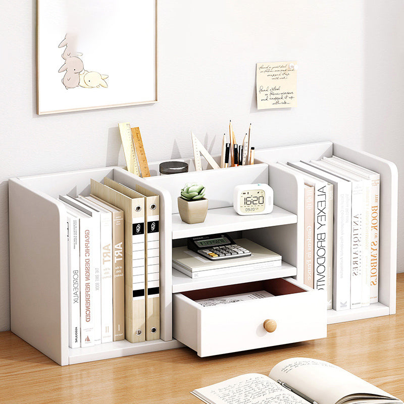 This modern minimalist desktop storage shelf is made from durable MDF and features a clean rectangular design with one smooth-glide drawer for concealed storage. Available in warm white or oak finish, it includes rounded anti-bump corners and a full back panel for added stability, making it ideal for organizing books and essentials in living rooms, home offices, or study spaces.