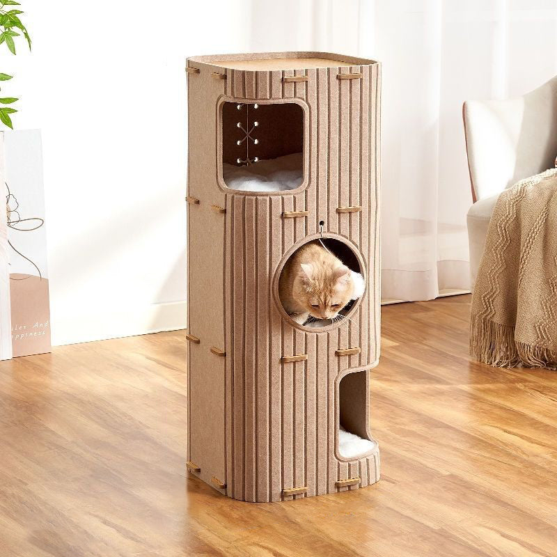 This modern minimalist cat tree house features a cozy multi-level design specifically engineered for multi-cat households, providing ample space for climbing, scratching, and hiding. Constructed from durable, scratch-resistant felt board, it offers a sturdy and reliable structure available in two or three tiers to suit your feline friends' needs. The warm green and brown color palette transforms the unit into an ideal winter hideaway, offering a comfortable retreat that seamlessly integrates into any living room or indoor space.