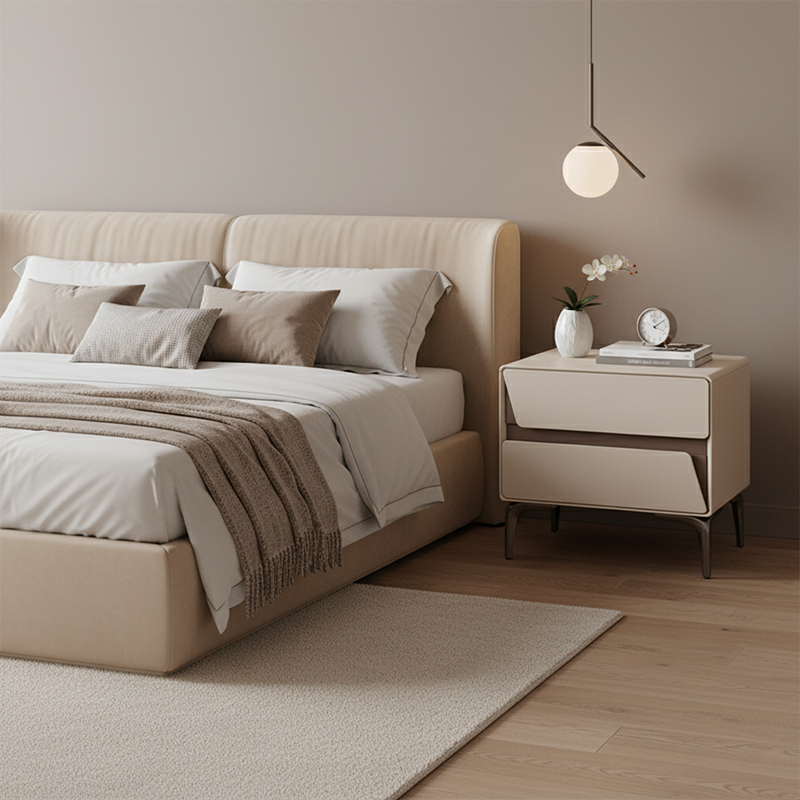 • تشطيب بلون مزدوج: إطار بيج أنيق مطلي بالورنيش مع واجهات أدراج خشبية طبيعية للتباين البصري والملمس.