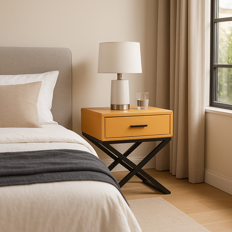This modern industrial nightstand blends sleek geometry with a refined balance of materials. The faux leather and wood veneer body offers a smooth, warm texture, while the matte black metal X-base adds stability and an industrial edge. Featuring a single drawer for convenient storage, it combines practicality with minimalist elegance, a perfect accent for modern bedrooms and loft-style interiors.
