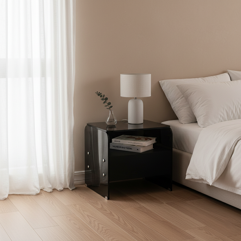 The sleek, transparent tempered glass top meets the raw texture of solid wood multilayer board---this nightstand is a "tough storage staple" for industrial-style bedrooms. Crafted with solid wood multilayer board, its dense wood fibers give it industrial-grade durability. The tempered glass top is high-strength and easy to clean, adding a cool, transparent aesthetic to industrial spaces with just a wipe. The single-drawer design is clever: the solid wood drawer features uniform color and sturdy construction, paired with an open storage shelf to organize items of all sizes. The wood-veneer cabinet is crafted with high standards, balancing ruggedness and subtle texture. Tempered glass legs are hard-wearing and easy to clean, infusing avant-garde design into industrial lines.