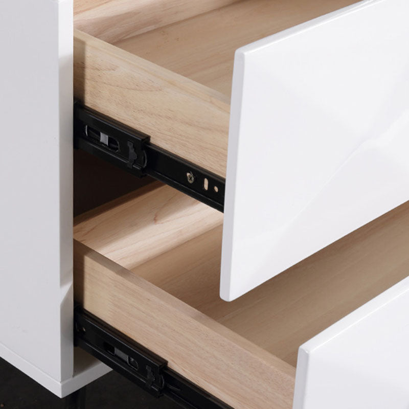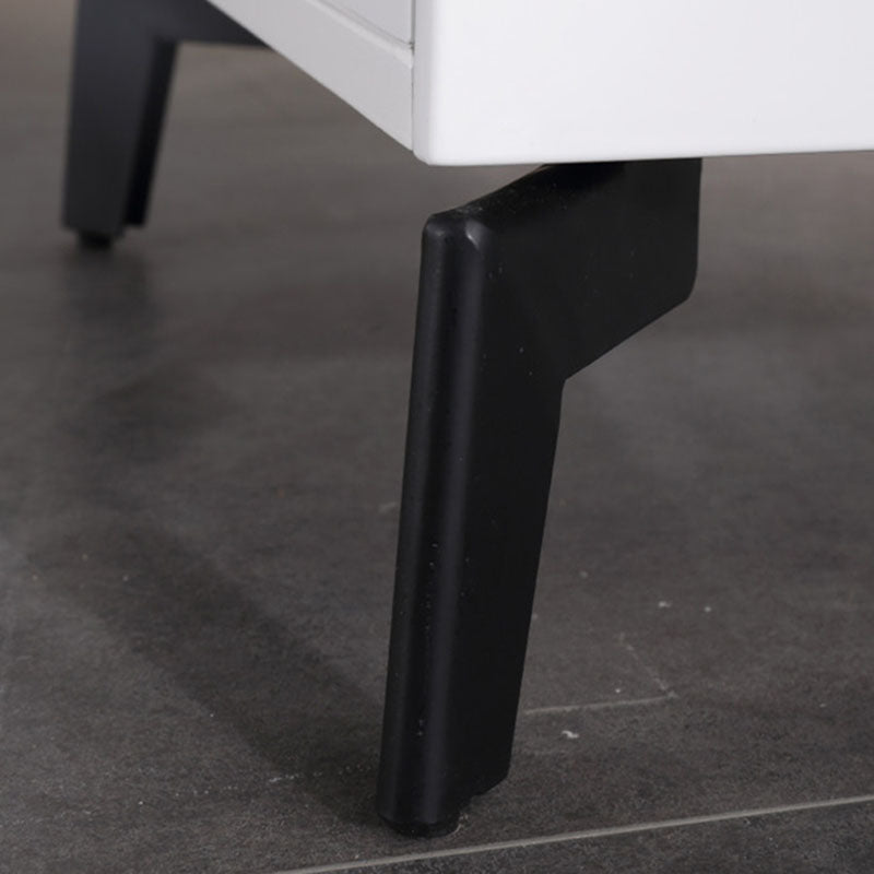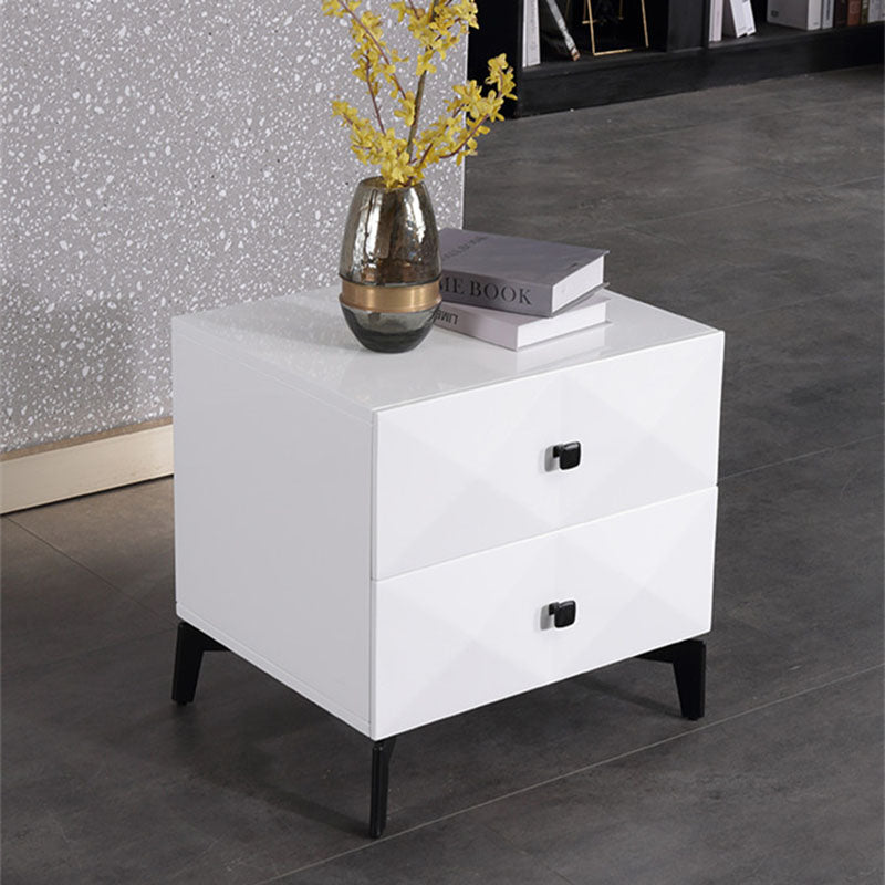 This modern minimalist nightstand features clean rectangular lines and a high-gloss geometric facade that reflects light beautifully. Crafted from veneered plywood with a smooth polished finish, it pairs timeless white tones with contrasting black metal accents for a sophisticated edge. The two spacious drawers offer practical storage while maintaining a sleek silhouette. Supported by sturdy metal legs, this nightstand combines elegance, durability, and functionality - perfect for modern, luxury, or Nordic-inspired bedrooms.
