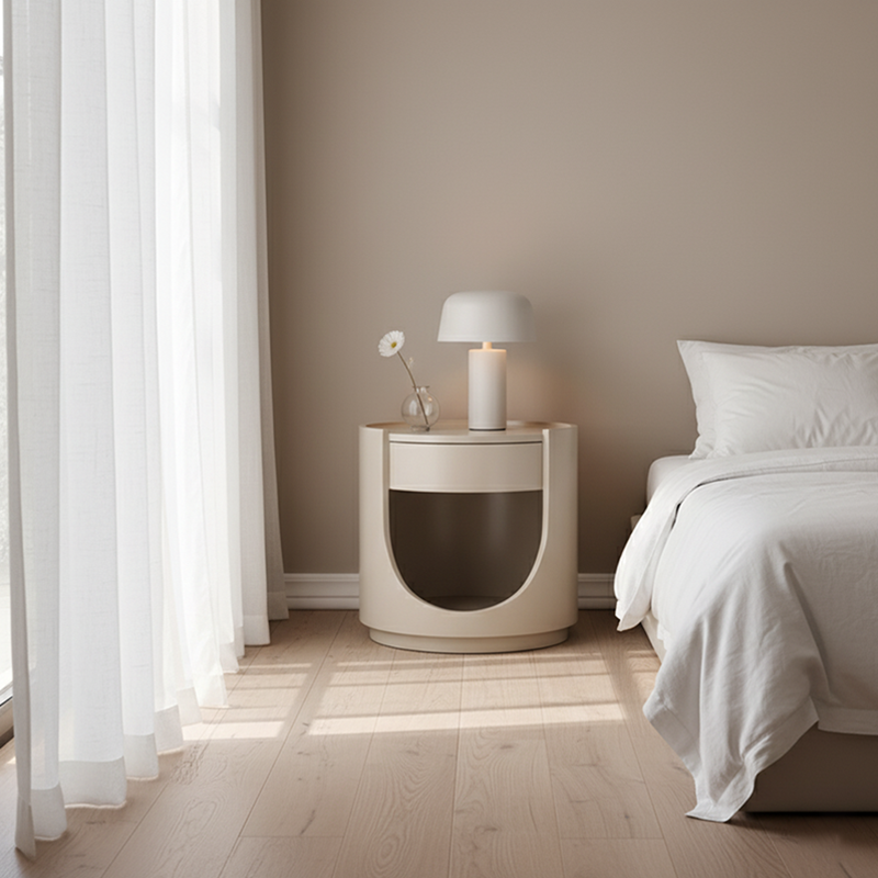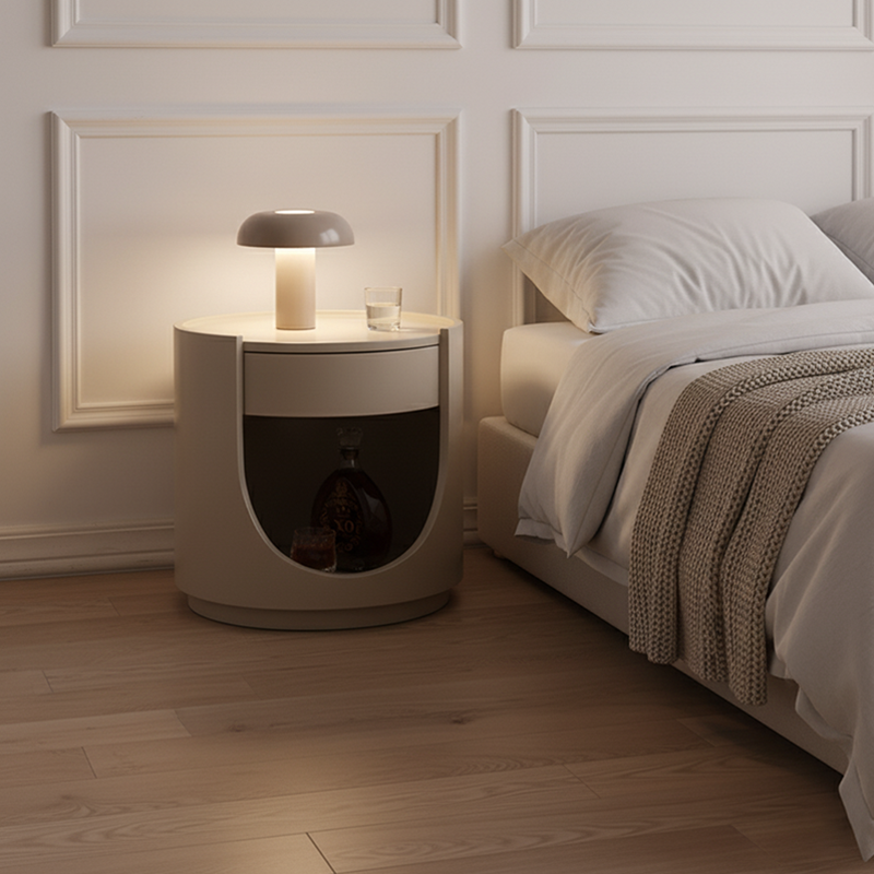 The soft lacquered surface meets the natural texture of solid wood multilayer board---this round nightstand is a "soothing storage nook" for contemporary Scandinavian bedrooms. Crafted with premium solid wood multilayer board, its layered wood fibers make it sturdy and durable while retaining that Scandinavian lightness. The skin-friendly lacquered top feels smooth, resists scratches and cracks, and is easy to clean with a simple wipe. The single-drawer design is thoughtful: the leather-wrapped solid wood drawer is elegant and protects your belongings. The built-in sensor light in the lower compartment turns off automatically after 20 seconds, offering Scandinavian-style practicality and warmth for nighttime access. Low-profile legs create a floating look, giving the rounded cabinet a playful vibe within its clean lines.