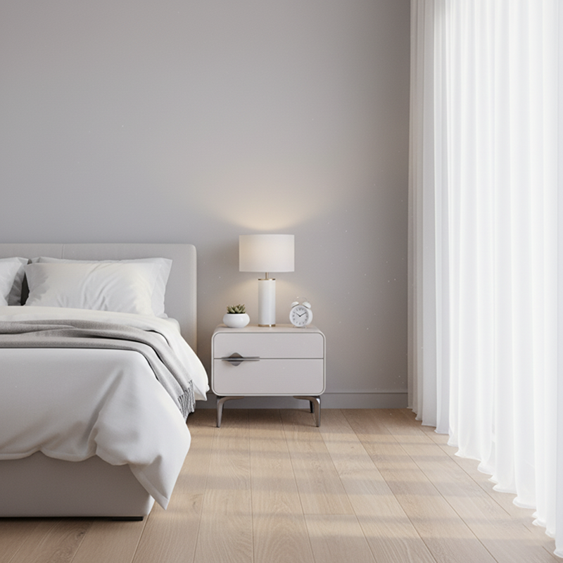 Soft PVC leather meets natural solid wood drawers---this nightstand is a sophisticated storage pick for modern minimalist bedrooms. Crafted with E1-grade eco MDF, it resists warping and ensures home safety. The PVC leather top is soft and easy to clean. Double solid wood drawers with uniform texture offer premium storage. Titanium-gray handles and legs add sleek details, while sturdy metal legs ensure lasting stability.