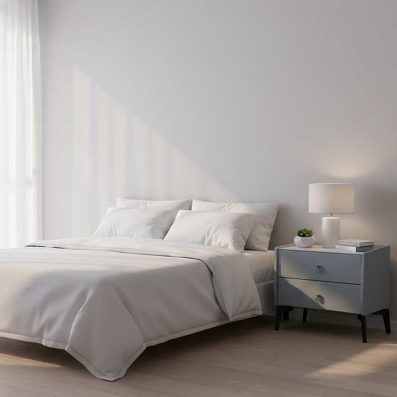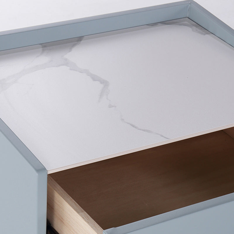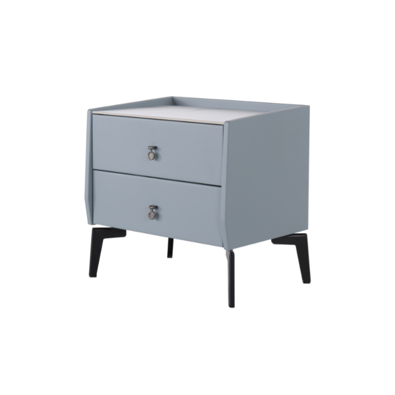 This contemporary Nordic-designed bedside table features a sintered rock stone top for enhanced texture, an E1 eco-friendly board frame, solid wood drawers for practical storage, a faux leather finish paired with airplane-shaped iron legs, and is crafted with exquisite upholstery technology. It showcases Nordic ingenuity through its minimalist design. It is a refined choice for bedroom storage and a dynamic style accent for the space, infusing daily home life with Nordic chic and quality.