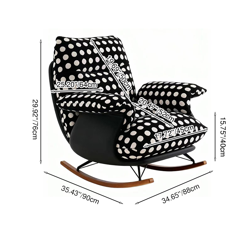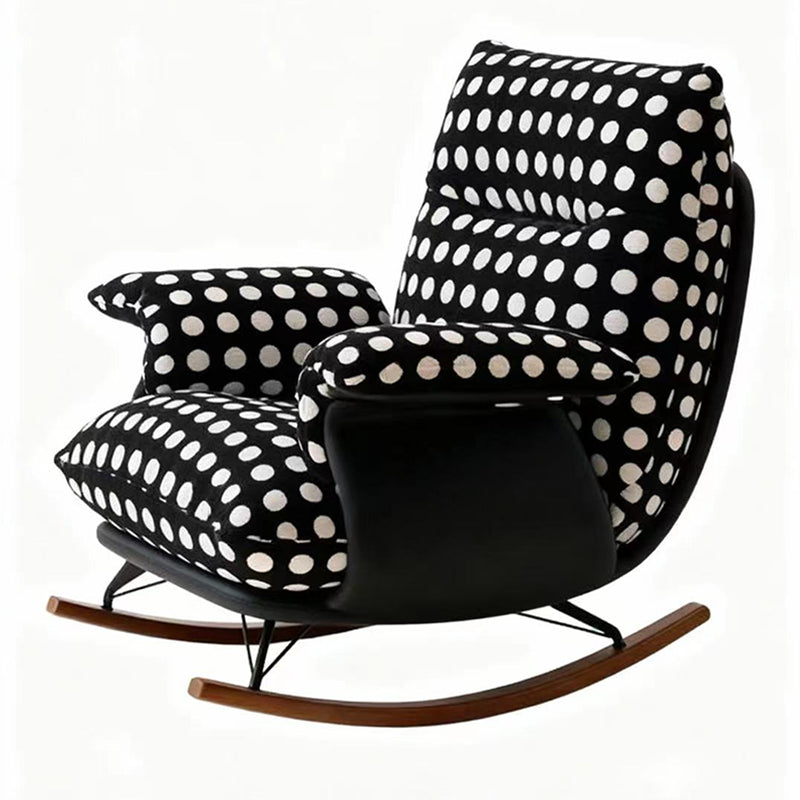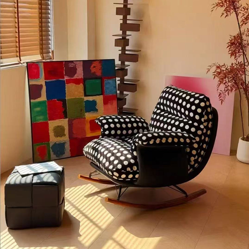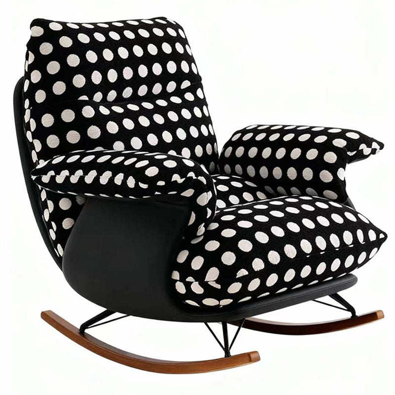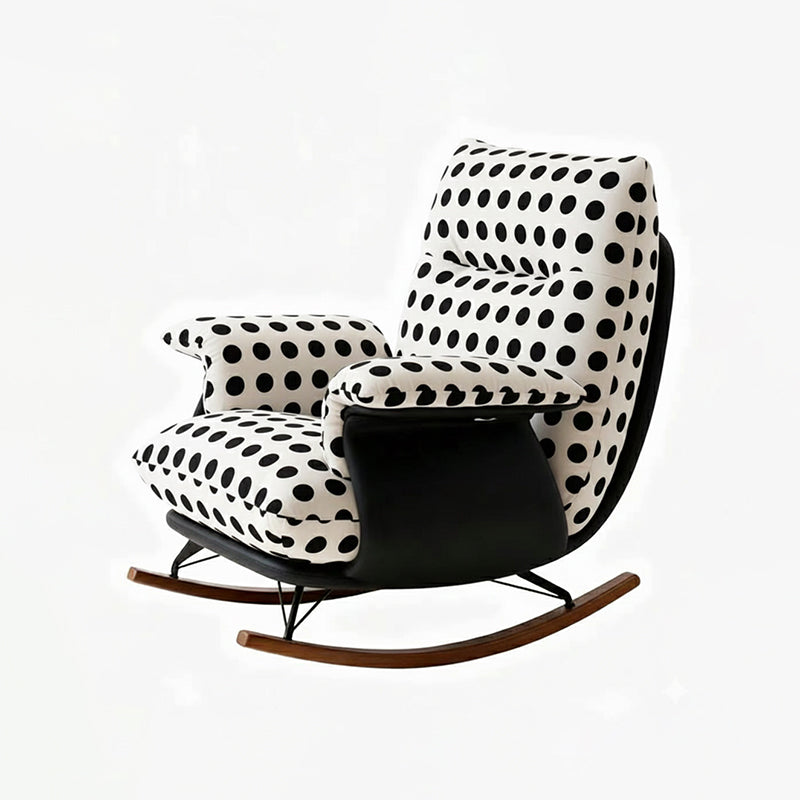 Bring a touch of retro charm and comfort to your home with this Mid-Century Modern Rocking Chair. Designed with bold polka dot fabric upholstery and a sleek faux leather shell, this chair effortlessly blends vintage flair with contemporary craftsmanship. Its sled-style solid wood legs allow a smooth, soothing rocking motion— perfect for reading, relaxing, or simply enjoying quiet moments.