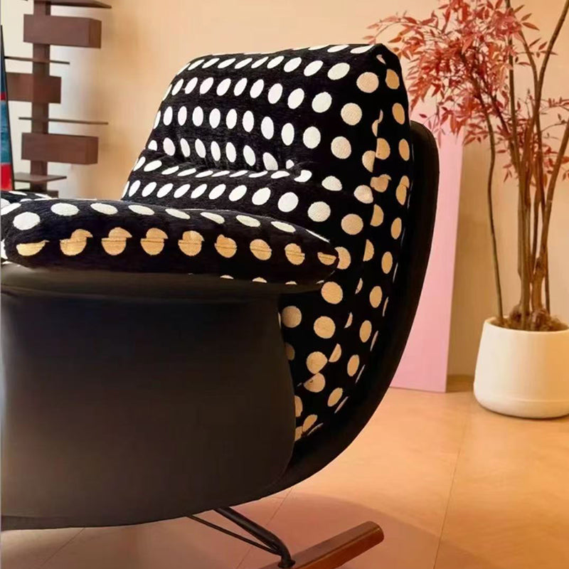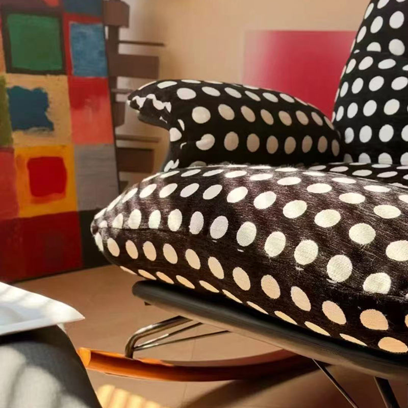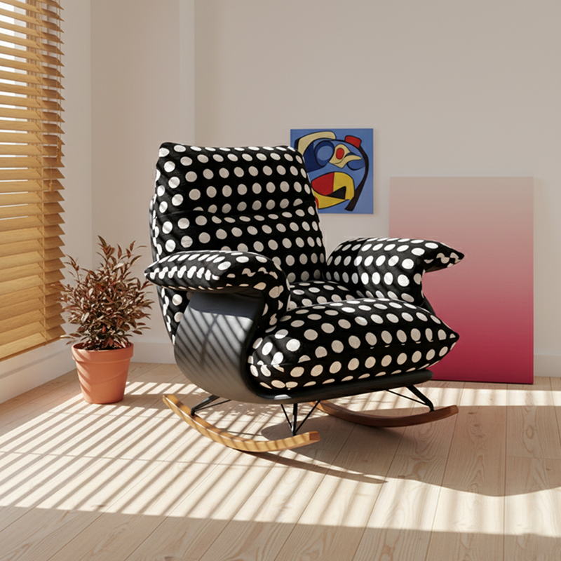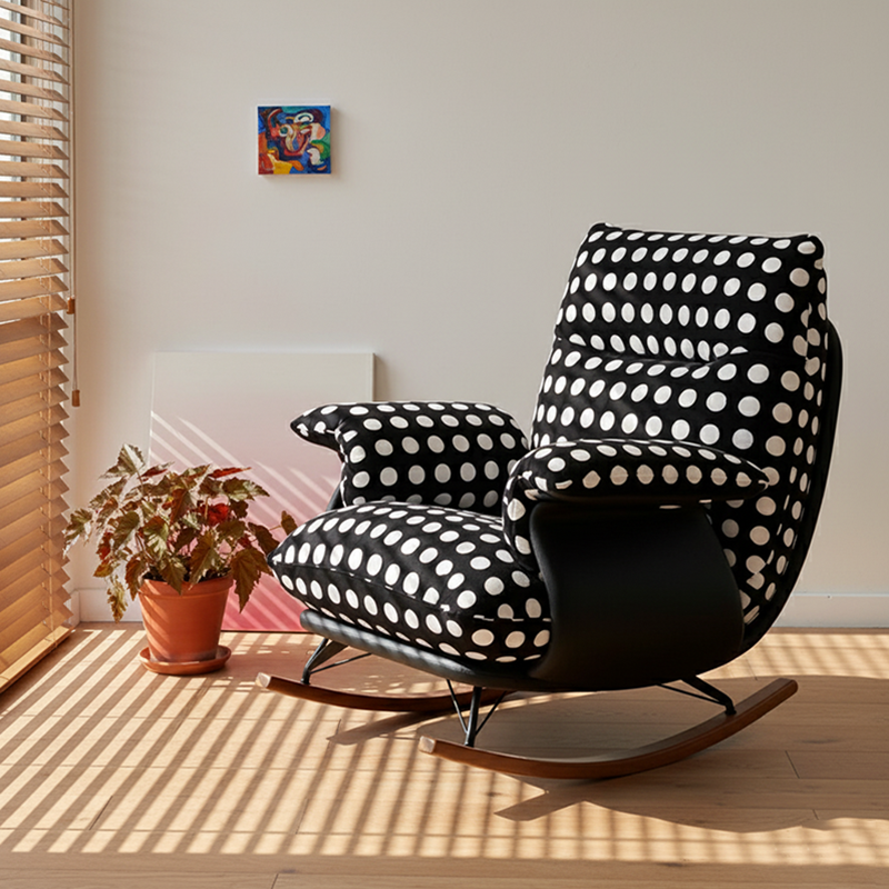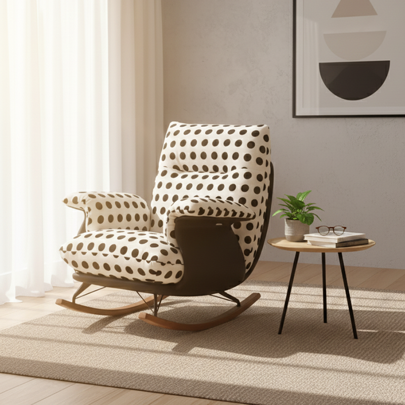 Bring a touch of retro charm and comfort to your home with this Mid-Century Modern Rocking Chair. Designed with bold polka dot fabric upholstery and a sleek faux leather shell, this chair effortlessly blends vintage flair with contemporary craftsmanship. Its sled-style solid wood legs allow a smooth, soothing rocking motion— perfect for reading, relaxing, or simply enjoying quiet moments.