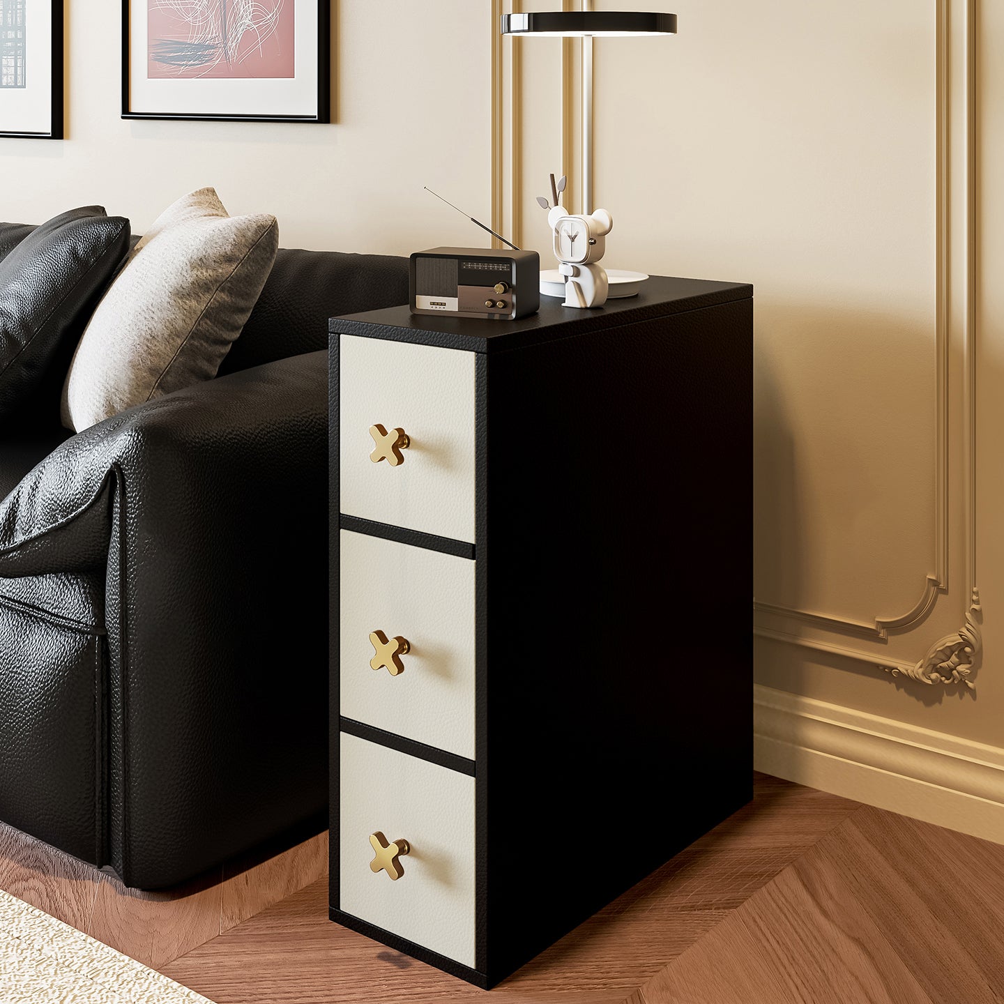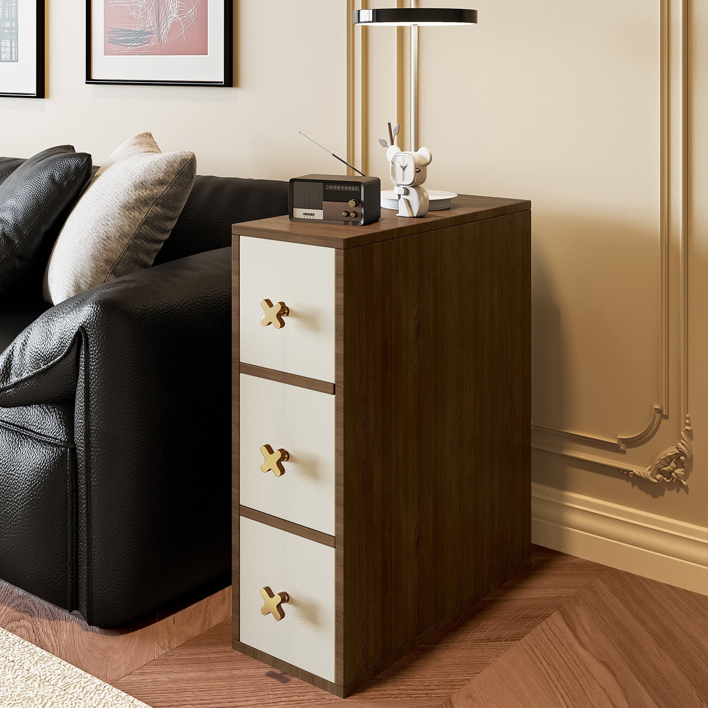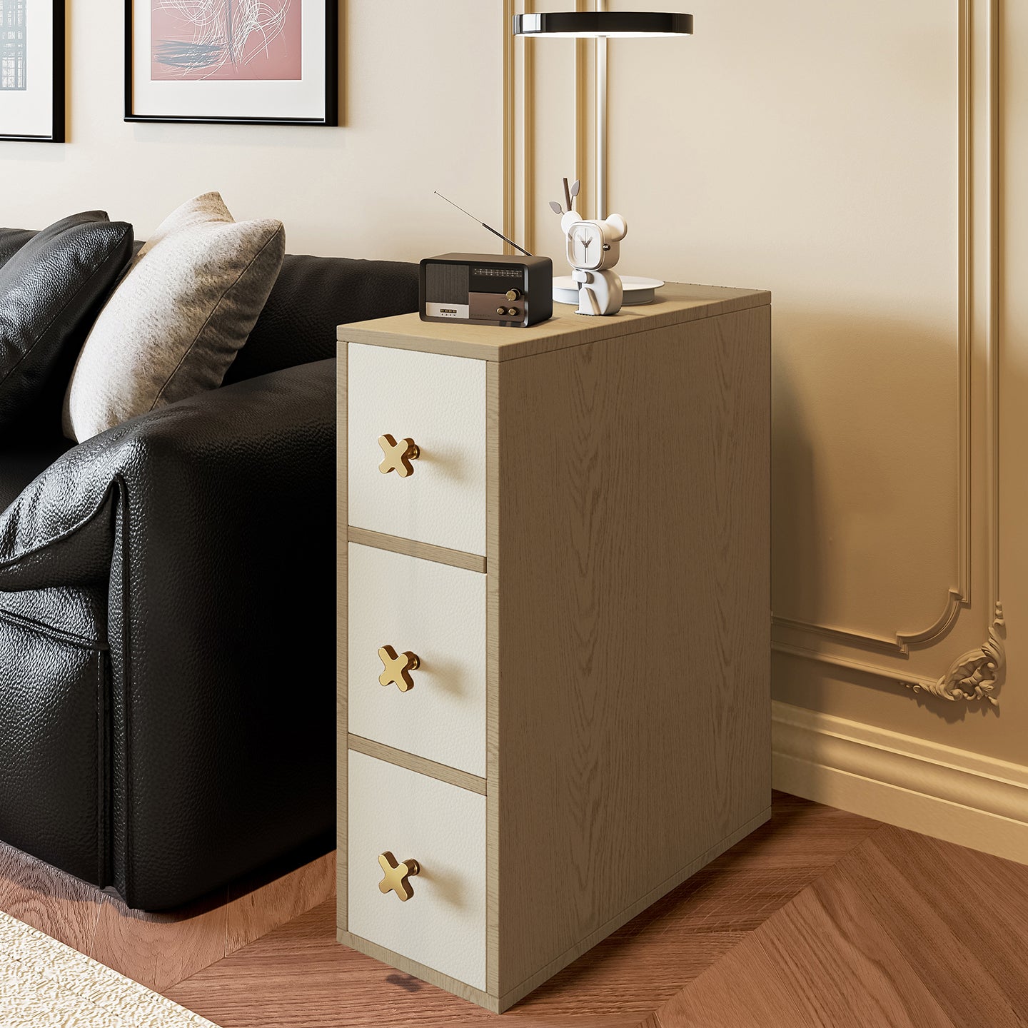 Maximize storage space with this contemporary vintage rectangular side cabinet, crafted from solid pine with microfiber leather accents. Its 3-drawer design ensures organized storage, while the slim and sturdy build fits narrow spaces in living rooms or bedrooms. Available in Light Walnut, Off-White, and Classic Wood tones, it balances durability and elegance.