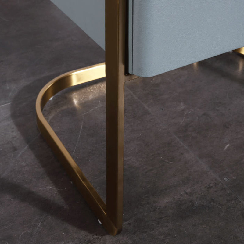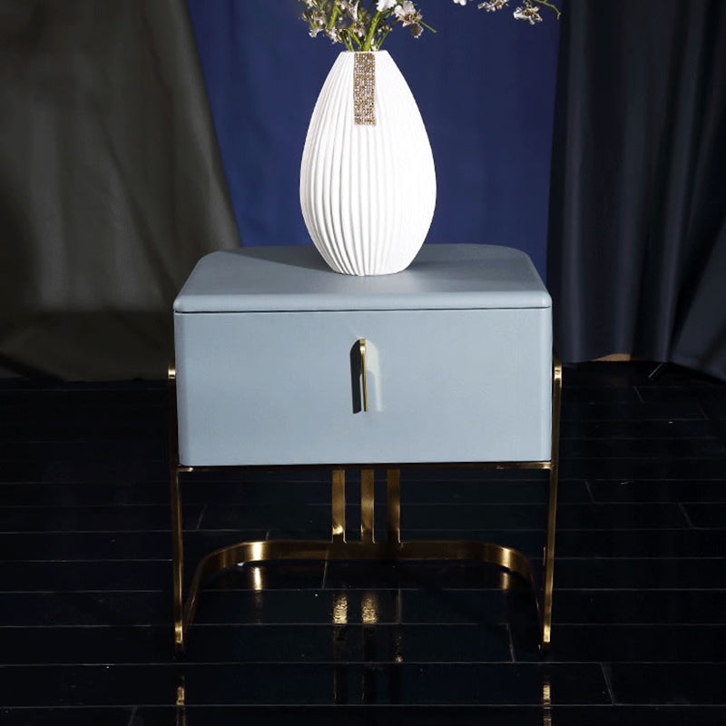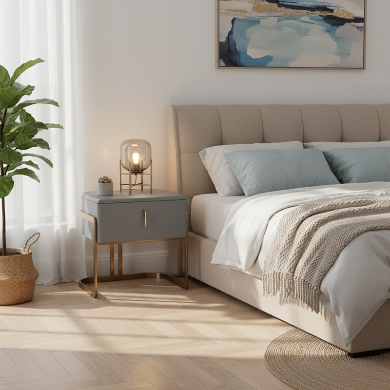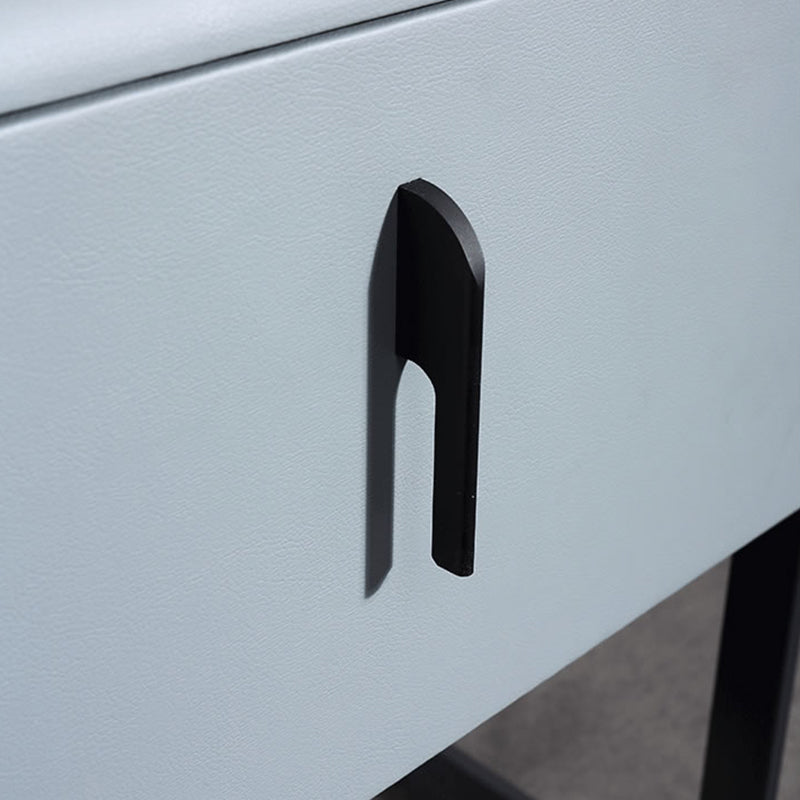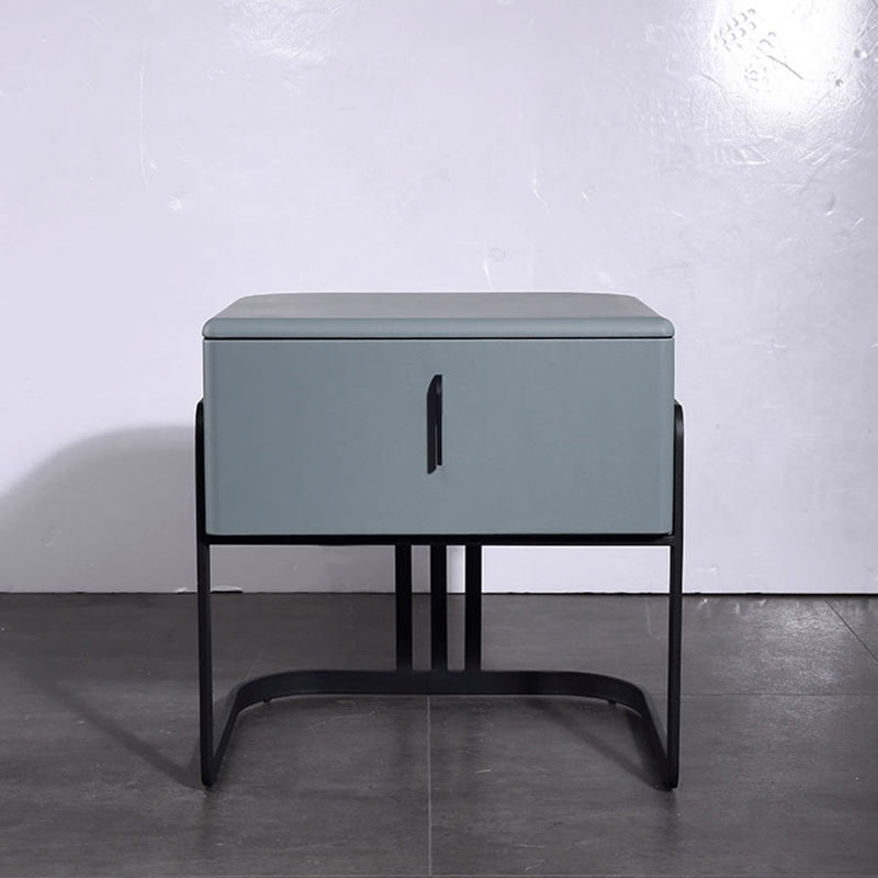 This modern Nordic nightstand features clean lines and a distinctive geometric silhouette that embodies minimalist sophistication. Wrapped in premium faux leather with a soft matte finish and supported by a curved matte metal frame, it combines visual lightness with structural stability. The soft blue-grey tone adds tranquility and modern charm to any interior.