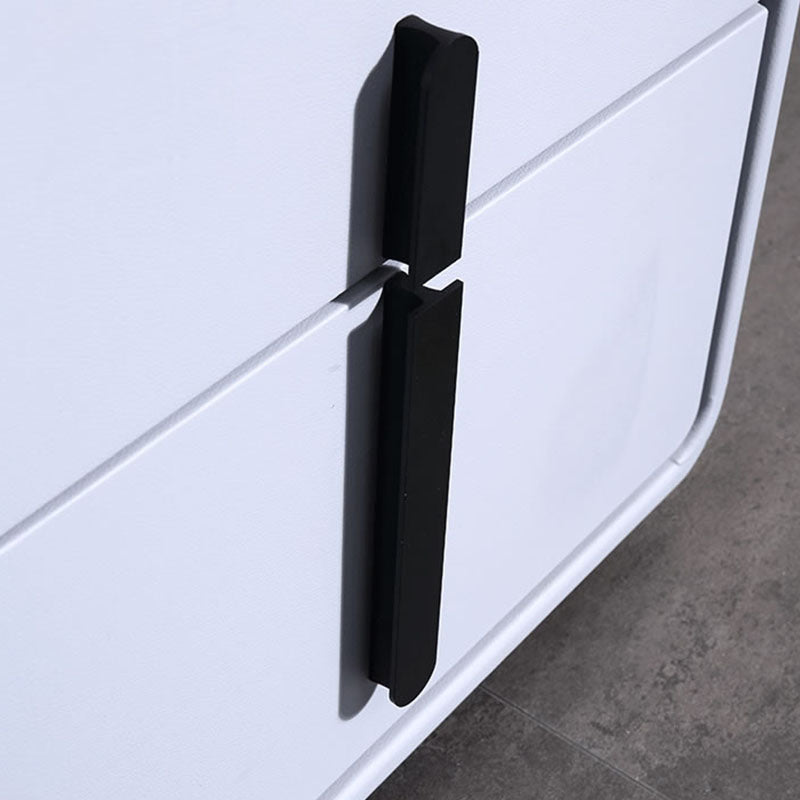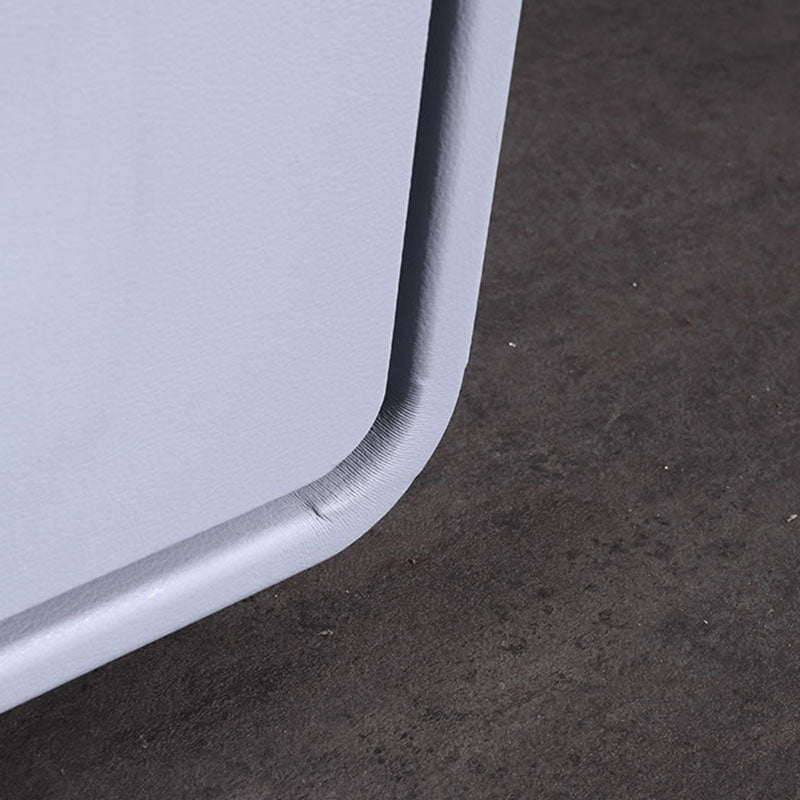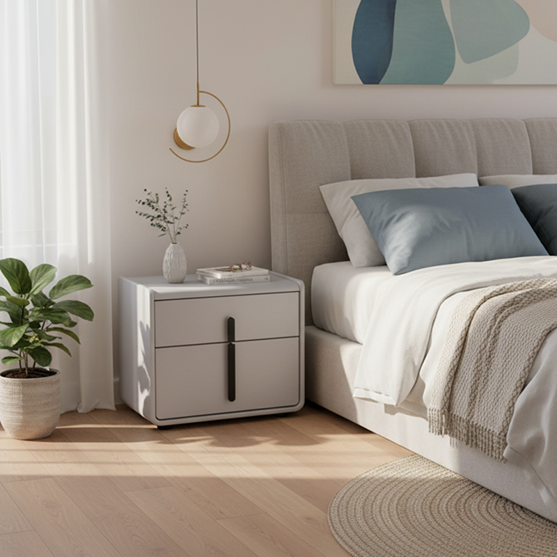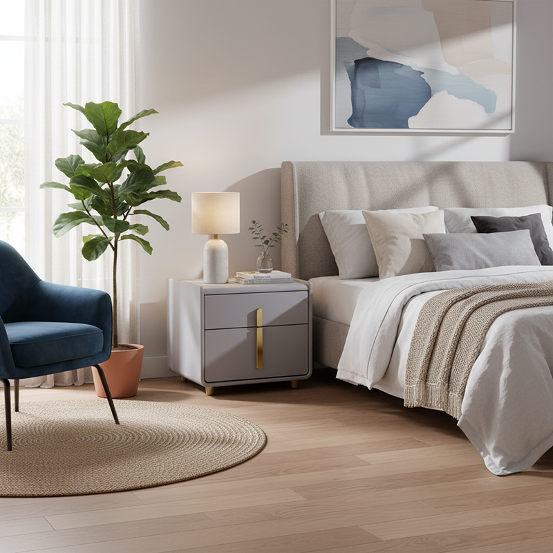 This modern minimalist nightstand blends sleek geometry with soft rounded edges for a refined yet contemporary look. Wrapped in premium faux leather with a light blue-gray finish, it exudes calm sophistication. The veneered plywood frame ensures lasting durability, while gold metal handles and legs add a touch of understated luxury. A perfect fit for modern, Nordic, or minimalist bedrooms.