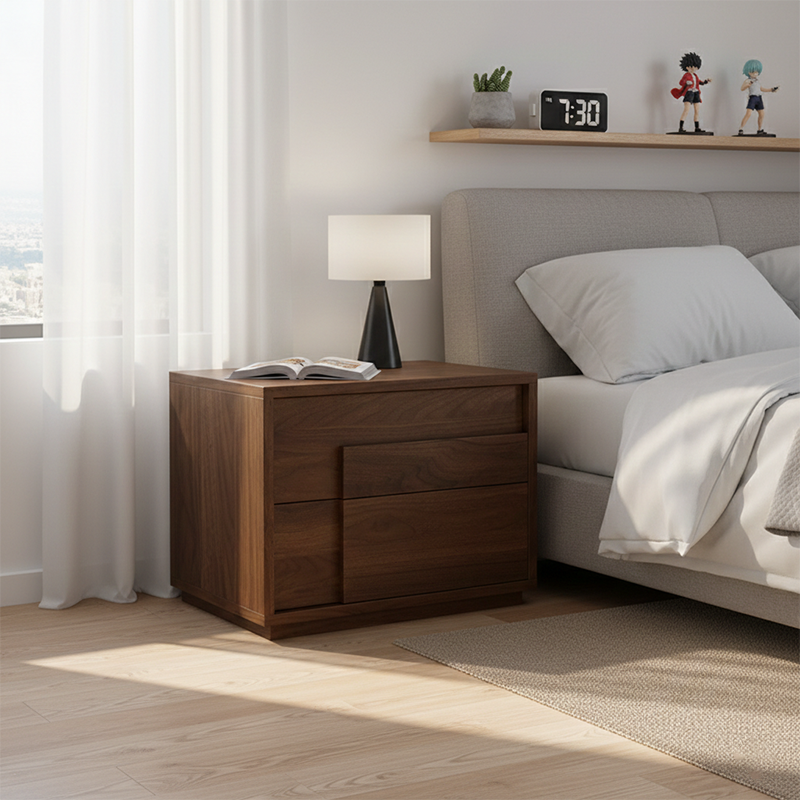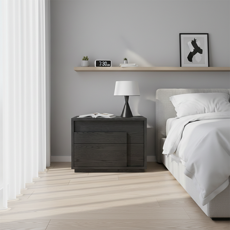 تحتوي الوحدة على درجين مصممين لانسيابية وسهولة في الحركة، مما يوفر مساحة تخزين واسعة للحفاظ على جميع مستلزماتك بجانب السرير منظمة بشكل أنيق.