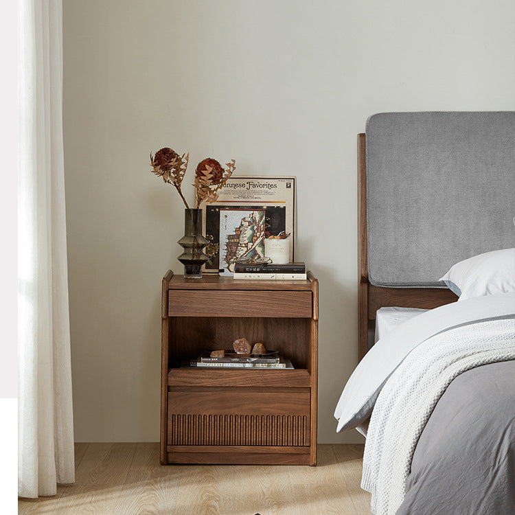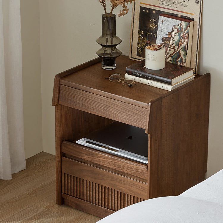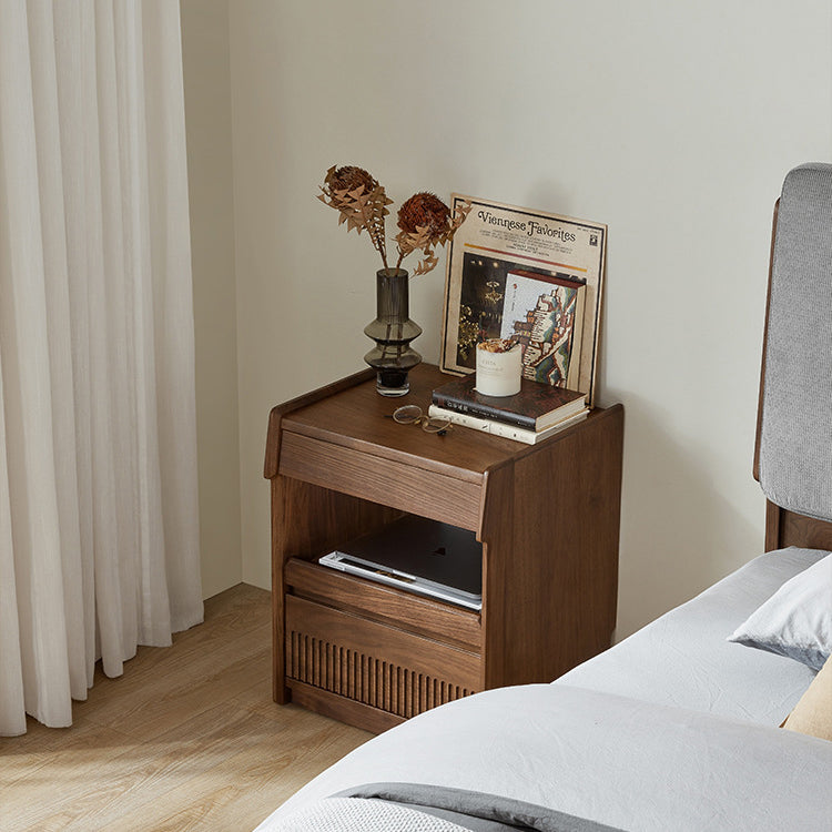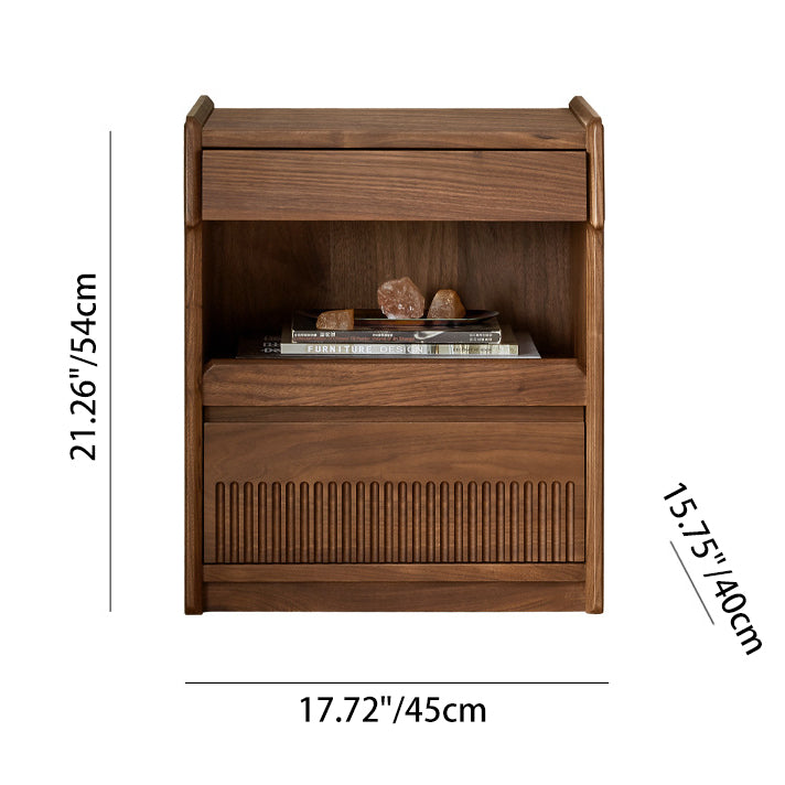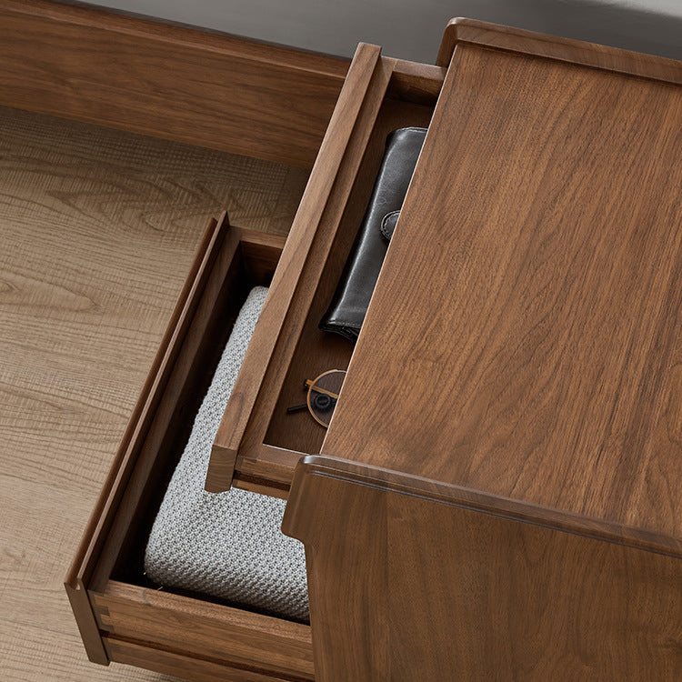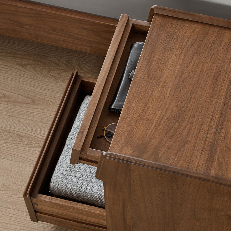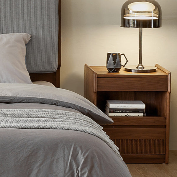 مصنوع من خشب الجوز الأسود الغني، يتميز هذا المنضدة الليلية المستطيلة بتشطيب طبيعي للحبوب، وأدراج مزدوجة بمقابض مخفية، وتصميم بحافة مرتفعة لمنع سقوط العناصر. إنه إضافة تقليدية مثالية لغرف النوم التي تسعى إلى الوظيفة والسحر الخالد.