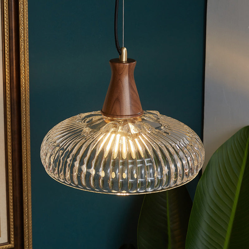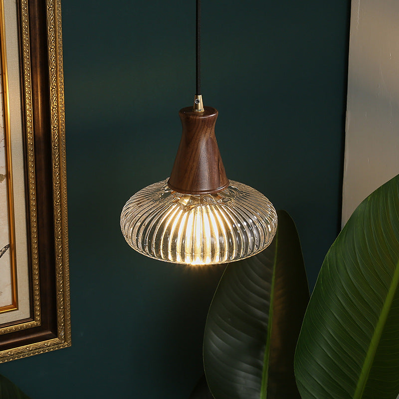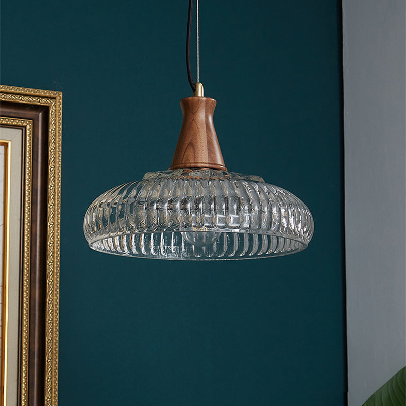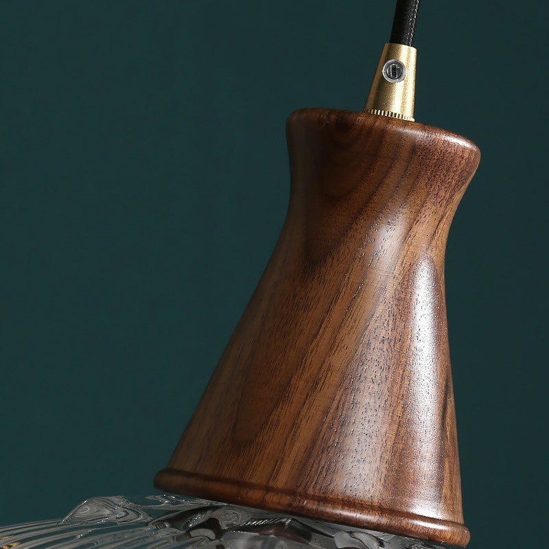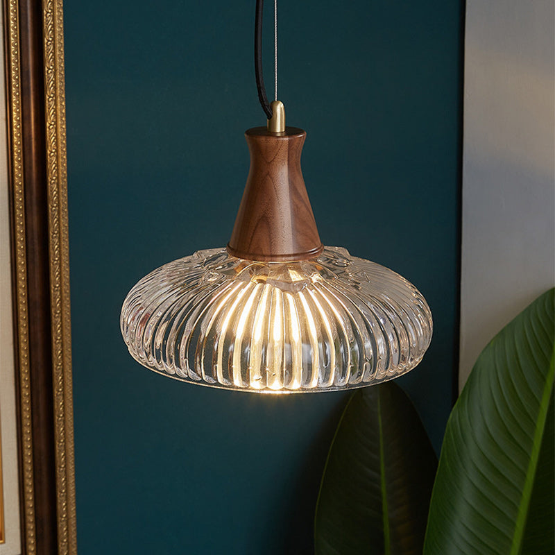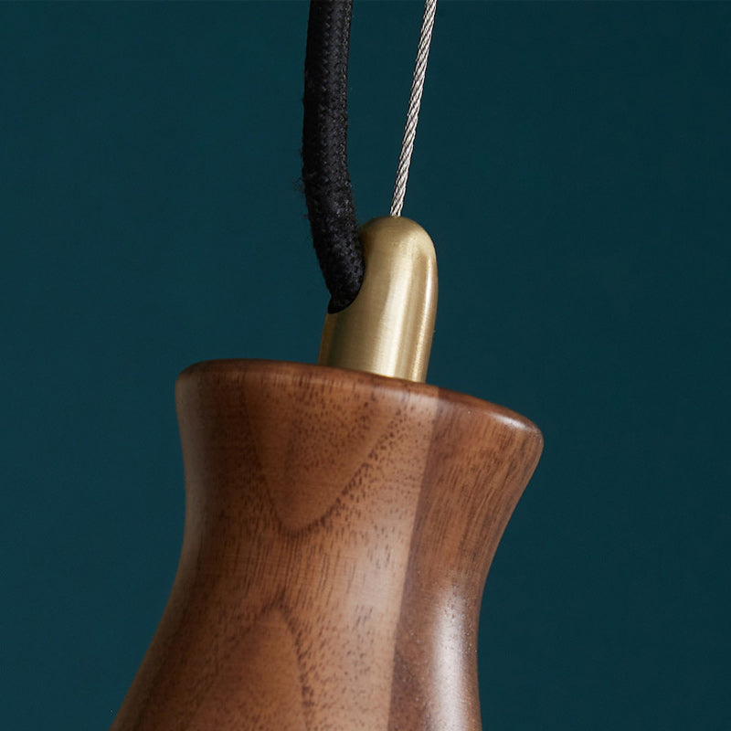 يتميز هذا الضوء المعلق بسلك تعليق قابل للتعديل، وخشب الجوز الطبيعي، ومواد نحاسية مقاومة للصدأ. غطاؤه المستدير المخطط يضفي لمسة مميزة على أجواء غرفة النوم.