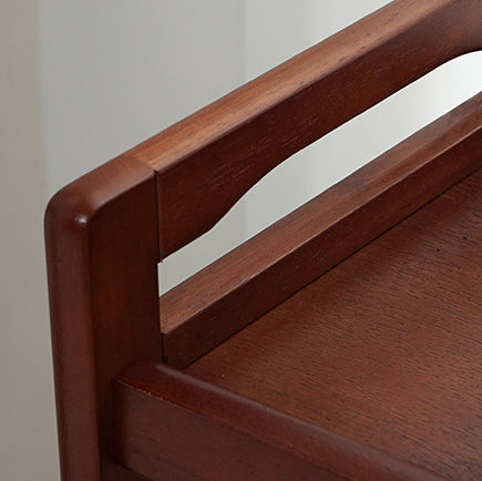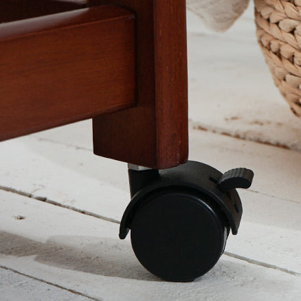 Crafted from solid wood in a rich coffee color, this traditional vintage side table features 3 tiers for versatile storage. Designed with smooth-rolling casters and lockable wheels, it offers stable mobility and a practical solution for serving drinks, desserts, or everyday dining room storage.