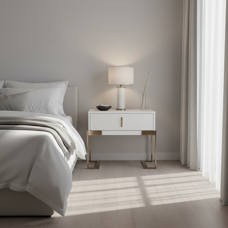 Designed in contemporary industrial style, this bedside table boasts a sleek geometric form. It’s built with an E1 eco-friendly board frame, solid wood drawers for everyday storage, titanium gold stainless steel legs, and a high-gloss baked paint finish. With its sharp lines, it radiates a luxurious trendy aura, acting as a unique marker for bedroom organization and a hallmark of industrial luxury in space design, bringing a blend of ruggedness and elegance to your home.