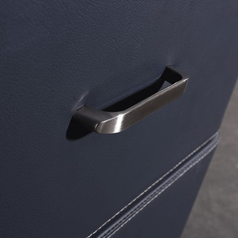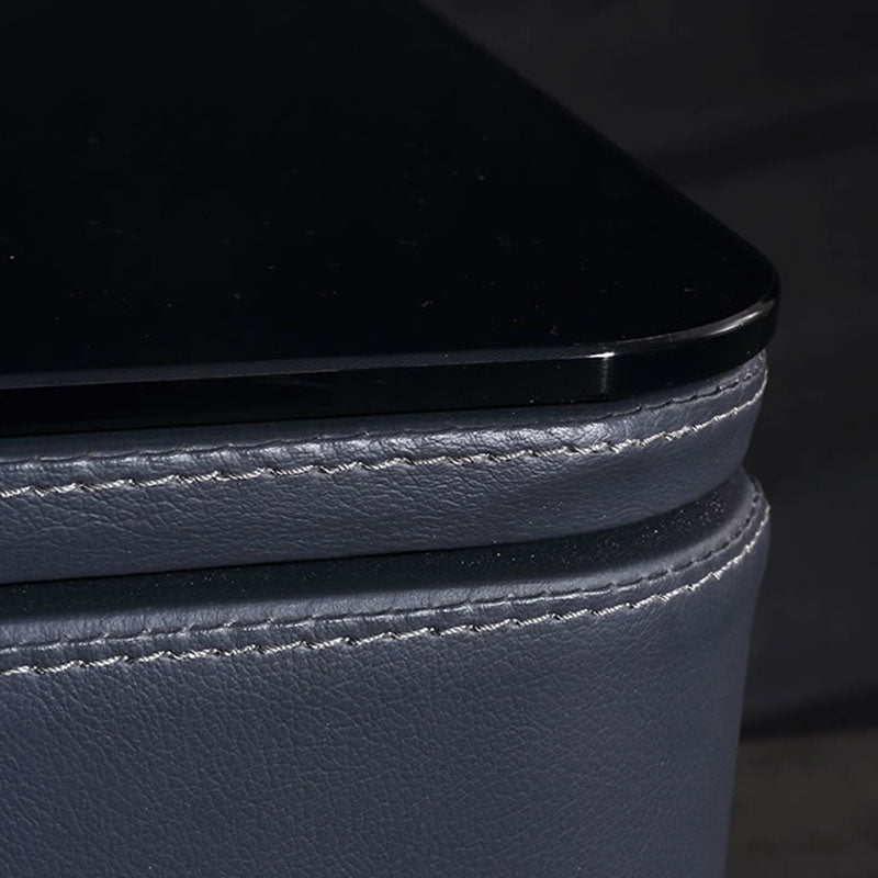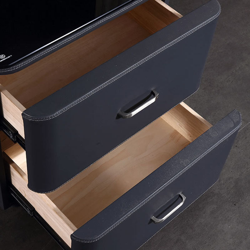 This French-style nightstand blends traditional charm with modern refinement. Wrapped in premium faux leather, it offers a smooth texture and a rich blue-grey tone that exudes quiet luxury. The black glass tabletop adds a glossy, light-reflective accent while being durable and easy to clean. Built from veneered plywood with meticulous stitching and rounded corners, it’s both sturdy and elegant. Two spacious drawers with metal handles provide organized storage for everyday essentials. Perfect for both classic and modern bedrooms, this piece enhances any interior with effortless sophistication.