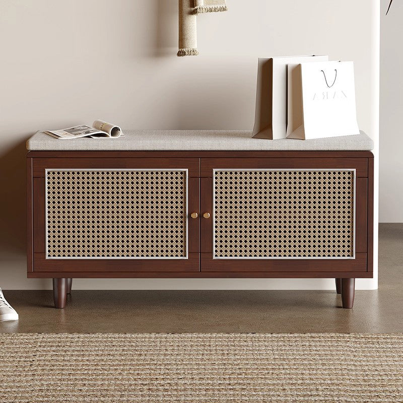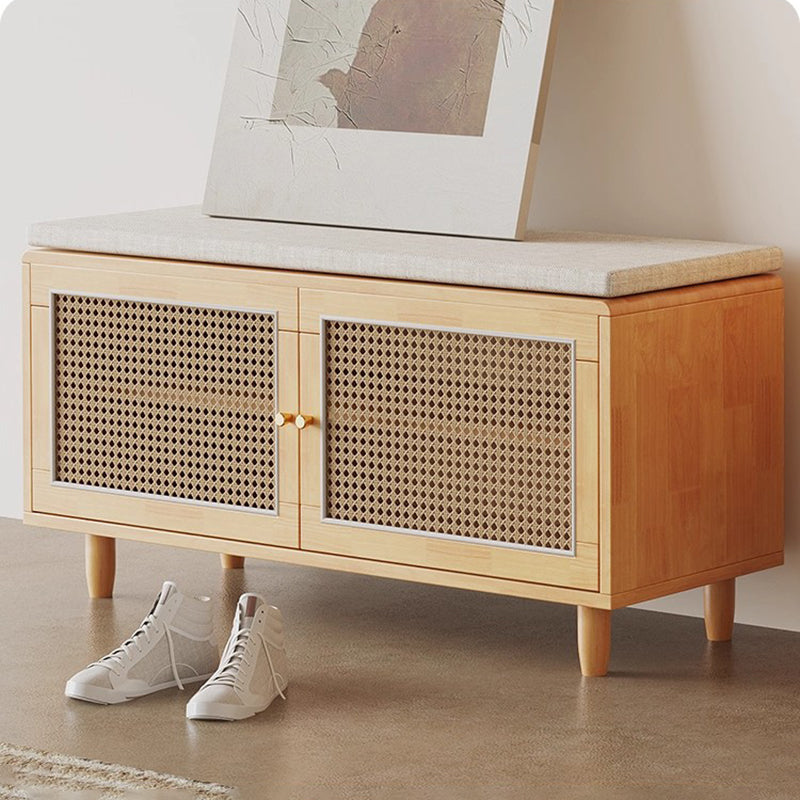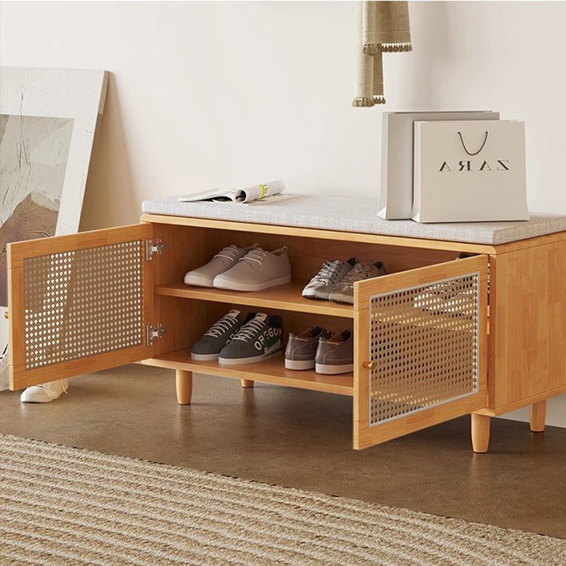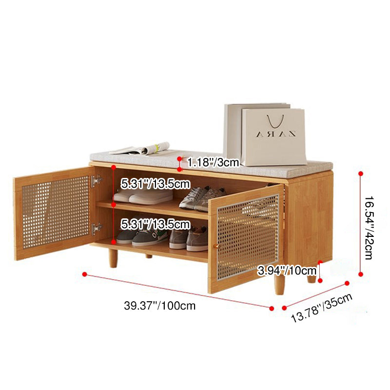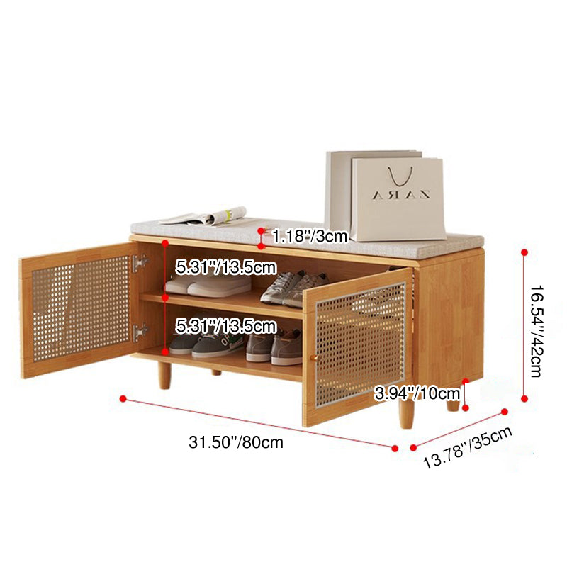 This shoe bench combines solid rubberwood, woven rattan-style doors, and a comfortable padded seat, offering a stylish and practical solution for any entryway. Featuring 3 tiers and 2 storage compartments, it keeps shoes neatly organized while providing a stable place to sit. Available in natural wood and walnut, this bench blends functionality with warm, contemporary design.