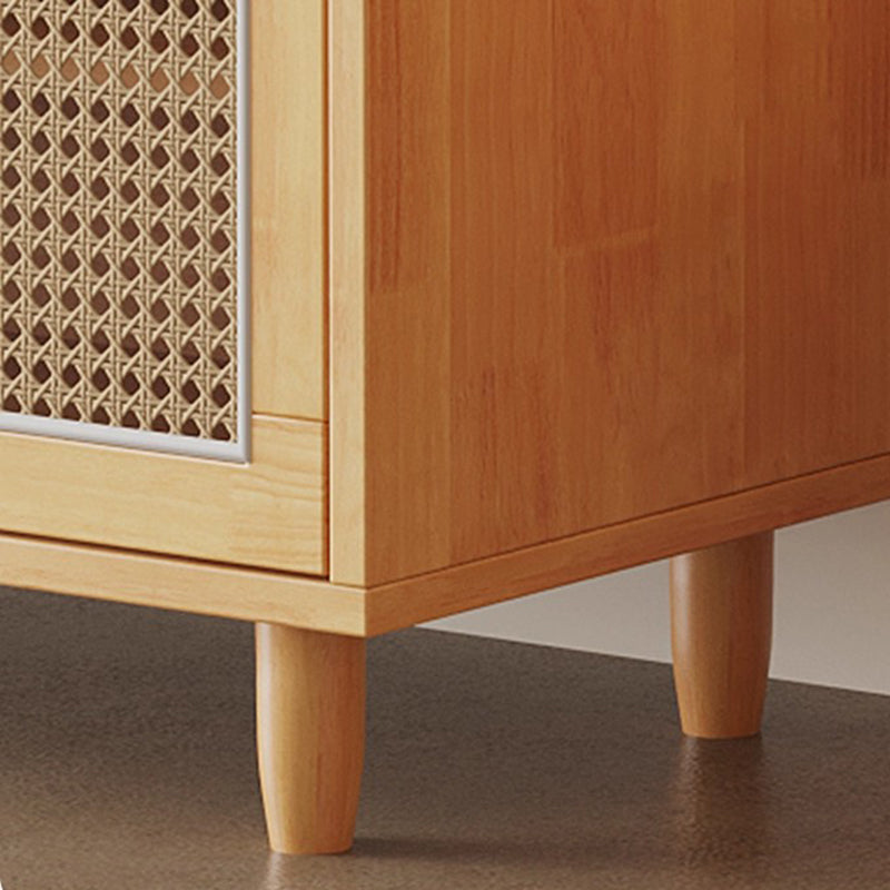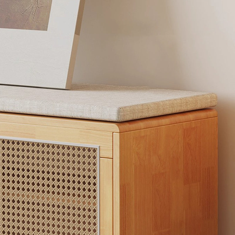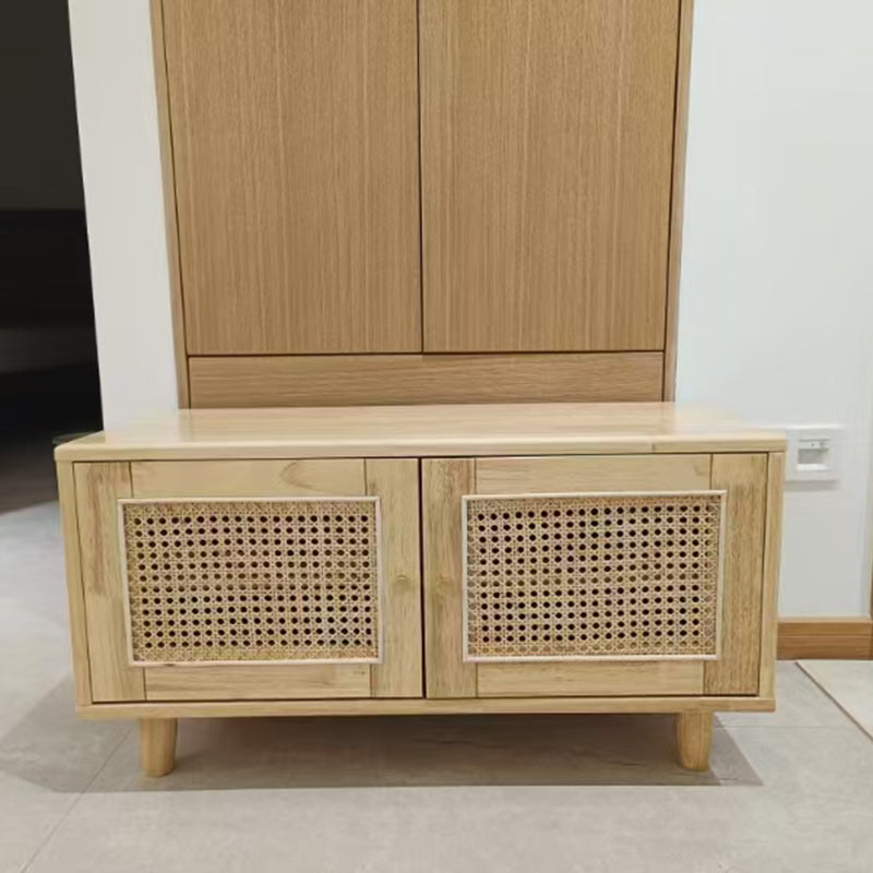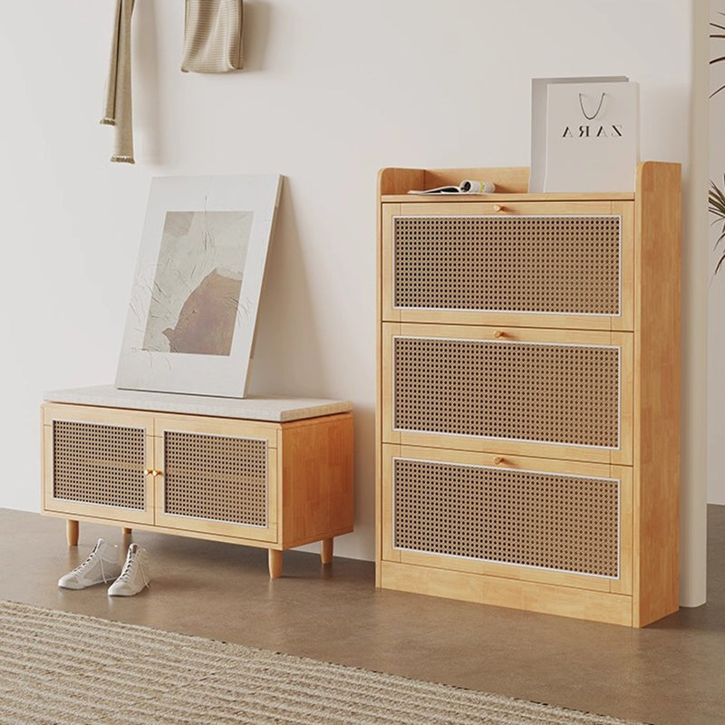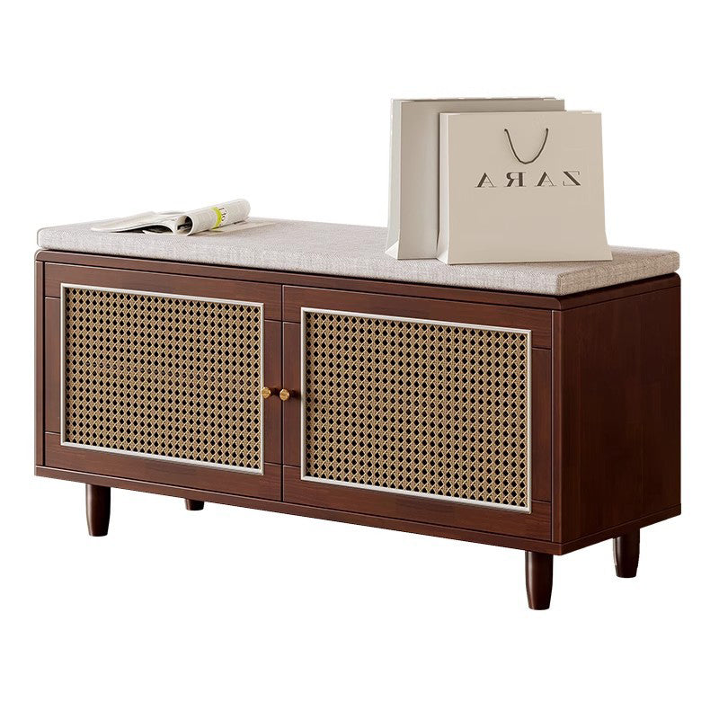 This shoe bench combines solid rubberwood, woven rattan-style doors, and a comfortable padded seat, offering a stylish and practical solution for any entryway. Featuring 3 tiers and 2 storage compartments, it keeps shoes neatly organized while providing a stable place to sit. Available in natural wood and walnut, this bench blends functionality with warm, contemporary design.