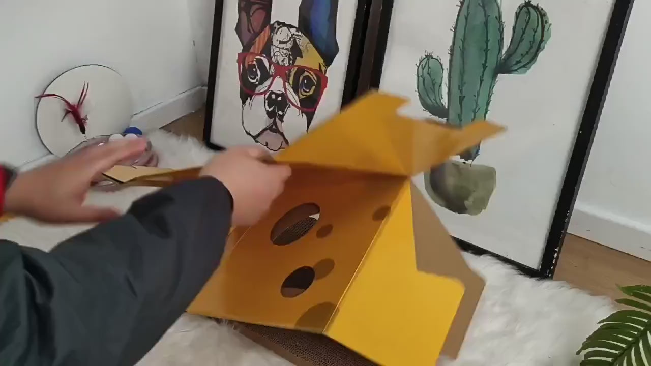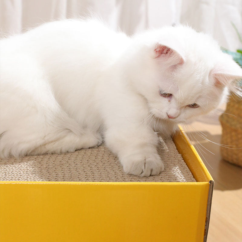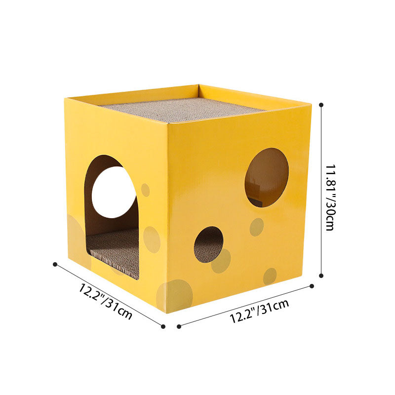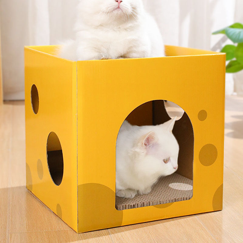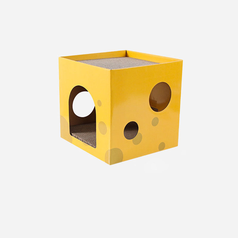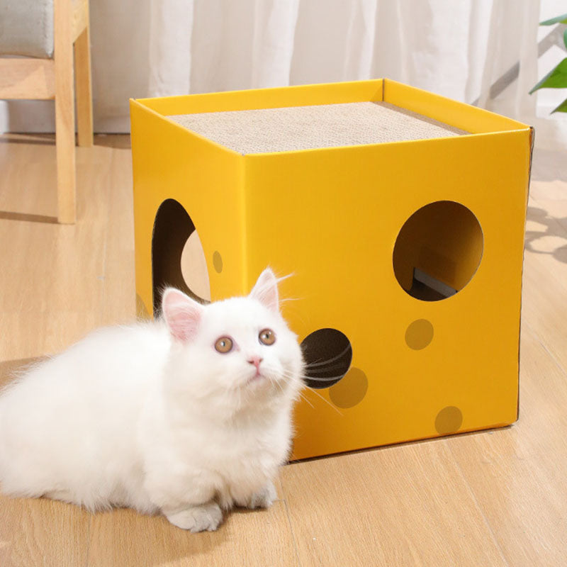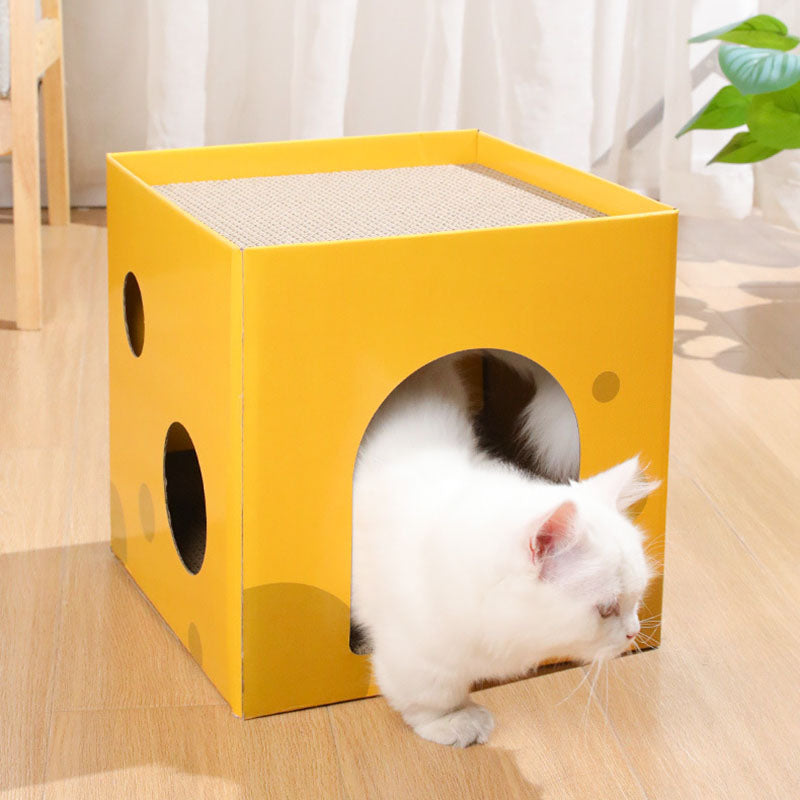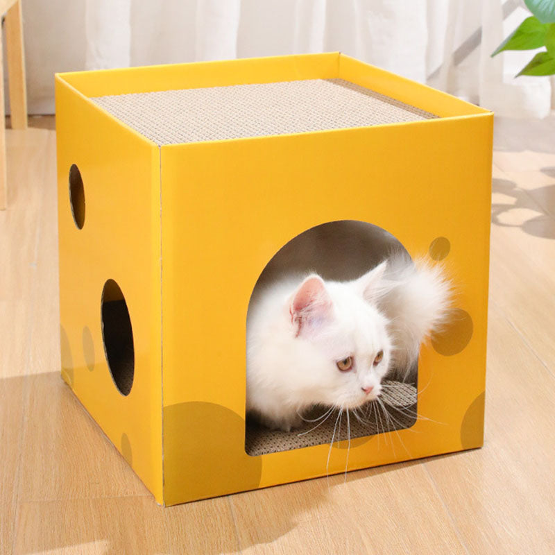 This modern minimalist cat bed, crafted from durable corrugated paper and designed as a square cheese box, features a 1-hole cozy space for your feline. In a bright yellow hue, it's scratch-resistant and wear-proof, fitting seamlessly in living rooms or bedrooms while serving as both a comfortable resting spot and an effective scratching tool.